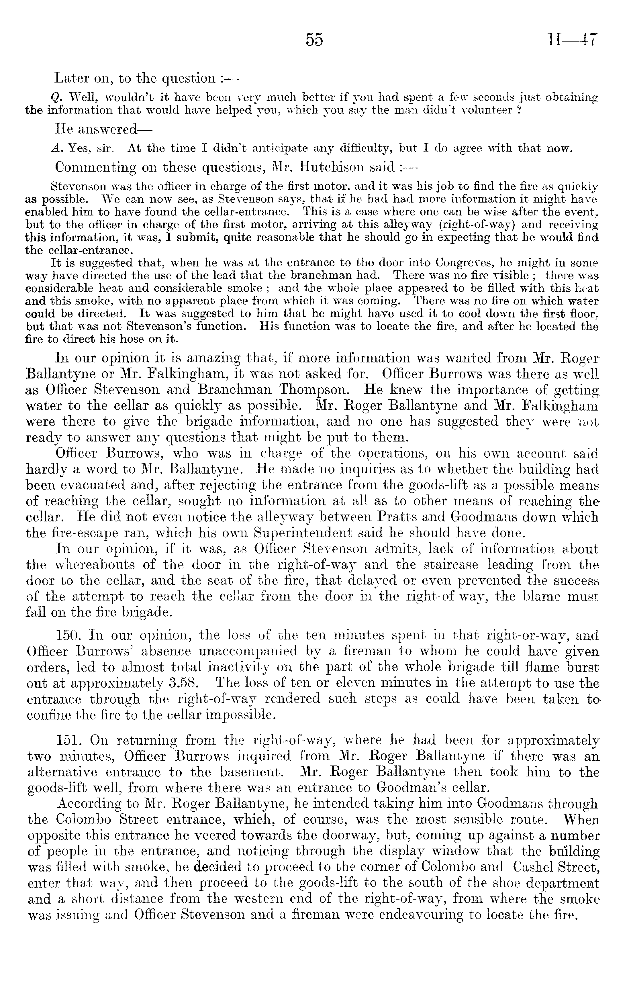 Later on, to the question : Q. Well, wouldn't it have been very much better if you had spent a few seconds just obtaining the information that would have helped you, which you say the man didn't volunteer ? He answered— A. Yes, sir. At the time I didn't anticipate any difficulty, but Ido agree with that now. Commenting on these questions, Mr. Hutchison said : Stevenson was the officer in charge of the first motor, and it was his job to find the fire as quickly as possible. We can now see, as Stevenson says, that if he had had more information it might have enabled him to have found the cellar-entrance. This is a case where one can be wise after the event, but to the officer in charge of the first motor, arriving at this alleyway (right-of-way) and receiving this information, it was, I submit, quite reasonable that he should go in expecting that he would find the cellar-entrance. It is suggested that, when he was at the entrance to the door into Congreves, he might in some way have directed the use of the lead that the branchman had. There was no fire visible ; there was considerable heat and considerable smoke ; and the whole place appeared to be filled with this heat and this smoke, with no apparent place from which it was coming. There was no fire on which water could be directed. It was suggested to him that he might have used it to cool do'-vn the first floor, but that was not Stevenson's function. His function was to locate the fire ; and after he located the fire to direct his hose on it. In our opinion it is amazing that, if more information was wanted from Mr. Roger Ballantyne or Mr. Falkingham, it was not asked for. Officer Burrows was there as well as Officer Stevenson and Branchman Thompson. He knew the importance of getting water to the cellar as quickly as possible. Mr. Roger Ballantyne and Mr. Falkingham were there to give the brigade information, and no one has suggested they were not ready to answer any questions that might be put to them. Officer Burrows, who was in charge of the operations, on his own account said hardly a word to Mr. Ballantyne. He made no inquiries as to whether the building had been evacuated and, after rejecting the entrance from the goods-lift as a possible means of reaching the cellar, sought no information at all as to other means of reaching the cellar. He did not even notice the alleyway between Pratts and Goodmans down which the fire-escape ran, which his own Superintendent said he should have done. In our opinion, if it was, as Officer Stevenson admits, lack of information about the whereabouts of the door in the right-of-way and the staircase leading from the door to the cellar, and the seat of the fire, that delayed or even prevented the success of the attempt to reach the cellar from the door in the right-of-way, the blame must fall on the fire brigade. 150. In our opinion, the loss of the ten minutes spent in that right-or-way, and Officer Burrows' absence unaccompanied by a fireman to whom he could have given orders, led to almost total inactivity on the part of the whole brigade till flame burst out at approximately 3.58. The loss of ten or eleven minutes in the attempt to use the entrance through the right-of-way rendered such steps as could have been taken to* confine the fire to the cellar impossible. 151. On returning from the right-of-way, where he had been for approximately two minutes, Officer Burrows inquired from Mr. Roger Ballantyne if there was an alternative entrance to the basement. Mr. Roger Ballantyne then took him to the goods-lift well, from where there was an entrance to Goodman's cellar. According to Mr. Roger Ballantyne, he intended taking him into Goodmans through the Colombo Street entrance, which, of course, was the most sensible route. When opposite this entrance he veered towards the doorway, but, coming up against a number of people in the entrance, and noticing through the display window that the building was filled with smoke, he decided to proceed to the corner of Colombo and Cashel Street, enter that way, and then proceed to the goods-lift to the south of the shoe department and a short distance from the western end of the right-of-way, from where the smoke was issuing and Officer Stevenson and a fireman were endeavouring to locate the fire.
