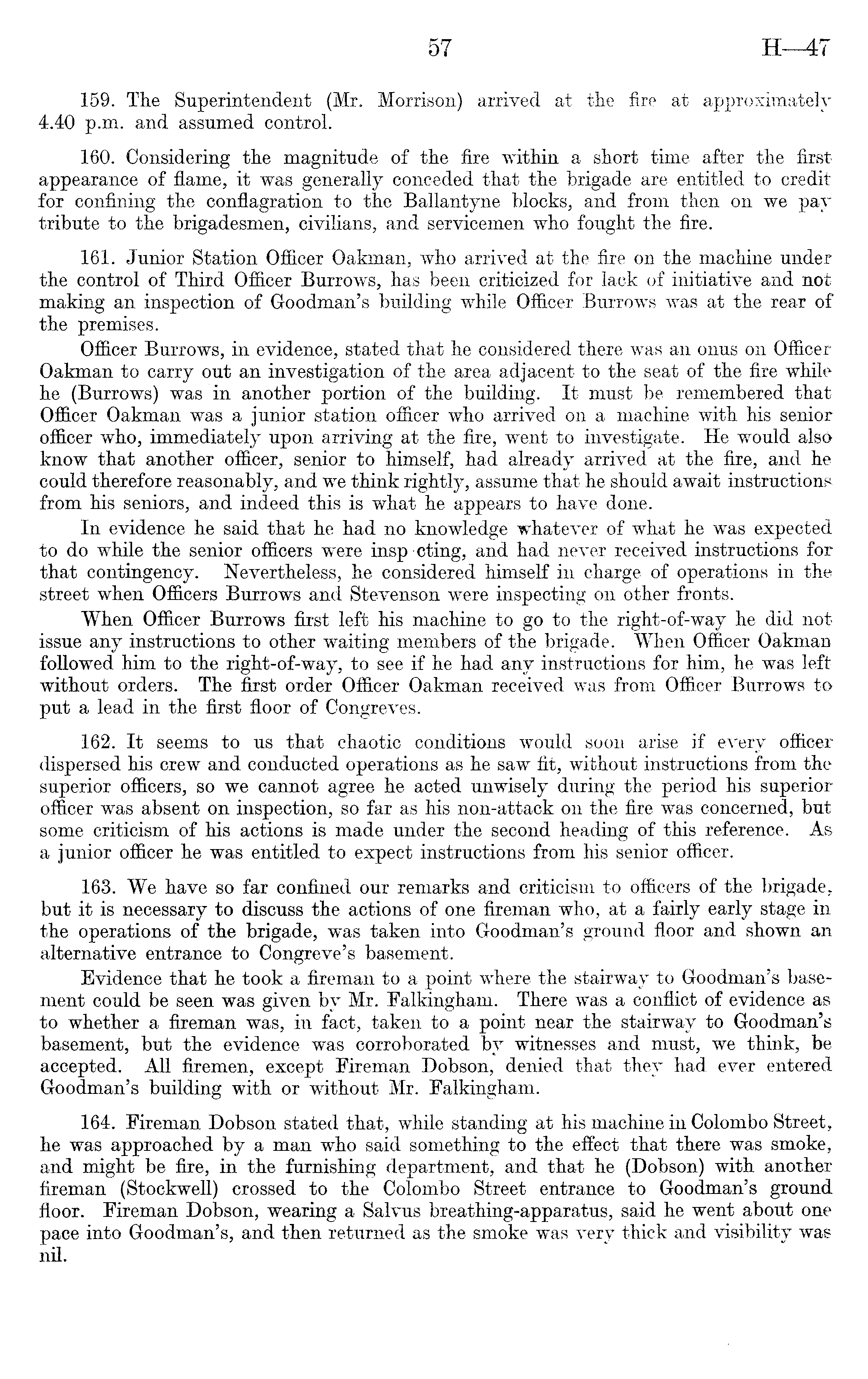 159. The Superintendent (Mr. Morrison) arrived at the fire at approximately 4.40 p.m. and assumed control. 160. Considering the magnitude of the fire within a short time after the first appearance of flame, it was generally conceded that the brigade are entitled to credit for confining the conflagration to the Ballantyne blocks, and from then on we pay tribute to the brigadesmen, civilians, and servicemen who fought the fire. 161. Junior Station Officer Oakman, who arrived at the fire on the machine under the control of Third Officer Burrows, has been criticized for lack of initiative and not making an inspection of Goodman's building while Officer Burrows was at the rear of the premises. Officer Burrows, in evidence, stated that he considered there was an onus on Officer Oakman to carry out an investigation of the area adjacent to the seat of the fire while he (Burrows) was in another portion of the building. It must be remembered that Officer Oakman was a junior station officer who arrived on a machine with his senior officer who, immediately upon arriving at the fire, went to investigate. He would also know that another officer, senior to himself, had already arrived at the fire, and he could therefore reasonably, and we think rightly, assume that he should await instructions from his seniors, and indeed this is what he appears to have done. In evidence he said that he had no knowledge whatever of what he was expected to do while the senior officers were insp cting, and had never received instructions for that contingency. Nevertheless, he considered himself in charge of operations in the street when Officers Burrows and Stevenson were inspecting on other fronts. When Officer Burrows first left his machine to go to the right-of-way he did not issue any instructions to other waiting members of the brigade. When Officer Oakman followed him to the right-of-way, to see if he had any instructions for him, he was left without orders. The first order Officer Oakman received was from Officer Burrows to put a lead in the first floor of Congreves. 162. It seems to us that chaotic conditions would soon arise if every officer dispersed his crew and conducted operations as he saw fit, without instructions from the superior officers, so we cannot agree he acted unwisely during the period his superior officer was absent on inspection, so far as his non-attack on the fire was concerned, but some criticism of his actions is made under the second heading of this reference. As a junior officer he was entitled to expect instructions from his senior officer. 163. We have so far confined our remarks and criticism to officers of the brigadebut it is necessary to discuss the actions of one fireman who, at a fairly early stage in the operations of the brigade, was taken into Goodman's ground floor and shown an alternative entrance to Congreve's basement. Evidence that he took a fireman to a point where the stairway to Goodman's basement could be seen was given by Mr. Falkingham. There was a conflict of evidence as to whether a fireman was, in fact, taken to a point near the stairway to Goodman's basement, but the evidence was corroborated by witnesses and must, we think, be accepted. All firemen, except Fireman Dobson, denied that they had ever entered Goodman's building with or without Mr. Falkingham. 164. Fireman Dobson stated that, while standing at his machine in Colombo Street, he was approached by a man who said something to the effect that there was smoke, and might be fire, in the furnishing department, and that he (Dobson) with another fireman (Stockwell) crossed to the Colombo Street entrance to Goodman's ground floor. Fireman Dobson, wearing a Salvus breathing-apparatus, said he went about one pace into Goodman's, and then returned as the smoke was verv thick and visibility was nil.