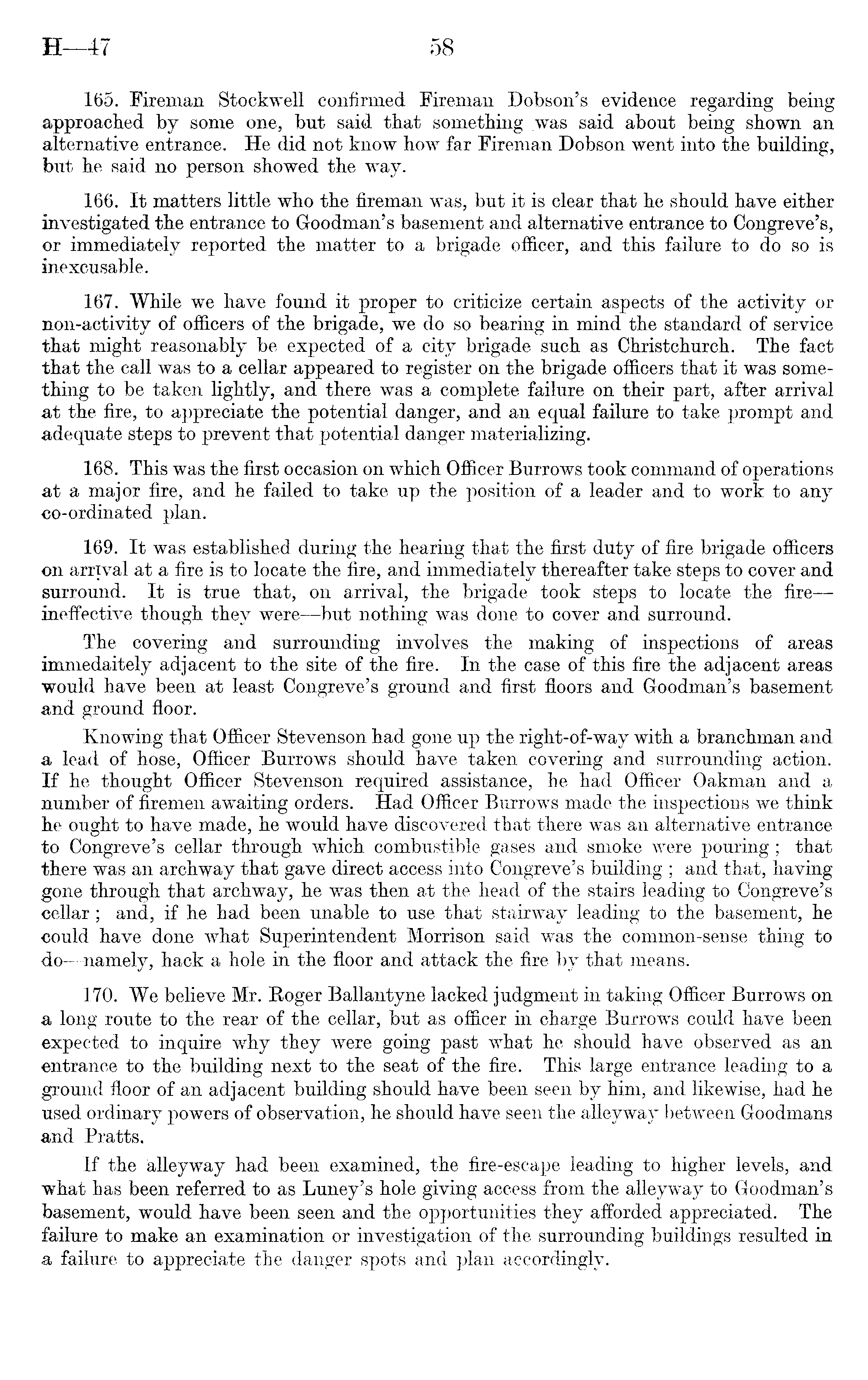 165. Fireman Stockwell confirmed Fireman Dobson's evidence regarding being approached by some one, but said that something was said about being shown an alternative entrance. He did not know how far Fireman Dobson went into the building, but he said no person showed the way. 166. It matters little who the fireman was, but it is clear that he should have either investigated the entrance to Goodman's basement and alternative entrance to Congreve's, or immediately reported the matter to a brigade officer, and this failure to do so is inexcusable. 167. While we have found it proper to criticize certain aspects of the activity or non-activity of officers of the brigade, we do so bearing in mind the standard of service that might reasonably be expected of a city brigade such as Christchurch. The fact that the call was to a cellar appeared to register on the brigade officers that it was something to be taken lightly, and there was a complete failure on their part, after arrival at the fire, to appreciate the potential danger, and an equal failure to take prompt and adequate steps to prevent that potential danger materializing. 168. This was the first occasion on which Officer Burrows took command of operations at a major fire, and he failed to take up the position of a leader and to work to any co-ordinated plan. 169. It was established during the hearing that the first duty of fire brigade officers on arrival at a fire is to locate the fire, and immediately thereafter take steps to cover and surround. It is true that, on arrival, the brigade took steps to locate the fire — ineffective though they were —but nothing was done to cover and surround. The covering and surrounding involves the making of inspections of areas immedaitely adjacent to the site of the fire. In the case of this fire the adjacent areas would have been at least Congreve's ground and first floors and Goodman's basement and ground floor. Knowing that Officer Stevenson had gone up the right-of-way with a branchman and a lead of hose, Officer Burrows should have taken covering and surrounding action. If he thought Officer Stevenson required assistance, he had Officer Oakman and a number of firemen awaiting orders. Had Officer Burrows made the inspections we think he ought to have made, he would have discovered that there was an alternative entrance to Congreve's cellar through which combustible gases and smoke were pouring ; that there was an archway that gave direct access into Congreve's building ; and that, having gone through that archway, he was then at the head of the stairs leading to Congreve's cellar ; and, if he had been unable to use that stairway leading to the basement, he could have done what Superintendent Morrison said was the common-sense thing to do—namely, hack a hole in the floor and attack the fire by that means. 170. We believe Mr. Roger Ballantyne lacked judgment in taking Officer Burrows on a long route to the rear of the cellar, but as officer in charge Burrows could have been expected to inquire why they were going past what he should have observed as an entrance to the building next to the seat of the fire. This large entrance leading to a ground floor of an adjacent building should have been seen by him, and likewise, had he used ordinary powers of observation, he should have seen the alleyway between Goodmans and Pratts. If the alleyway had been examined, the fire-escape leading to higher levels, and what has been referred to as Luney's hole giving access from the alleyway to Goodman's basement, would have been seen and the opportunities they afforded appreciated. The failure to make an examination or investigation of the surrounding buildings resulted in a failure to appreciate the danger spots and plan accordingly.