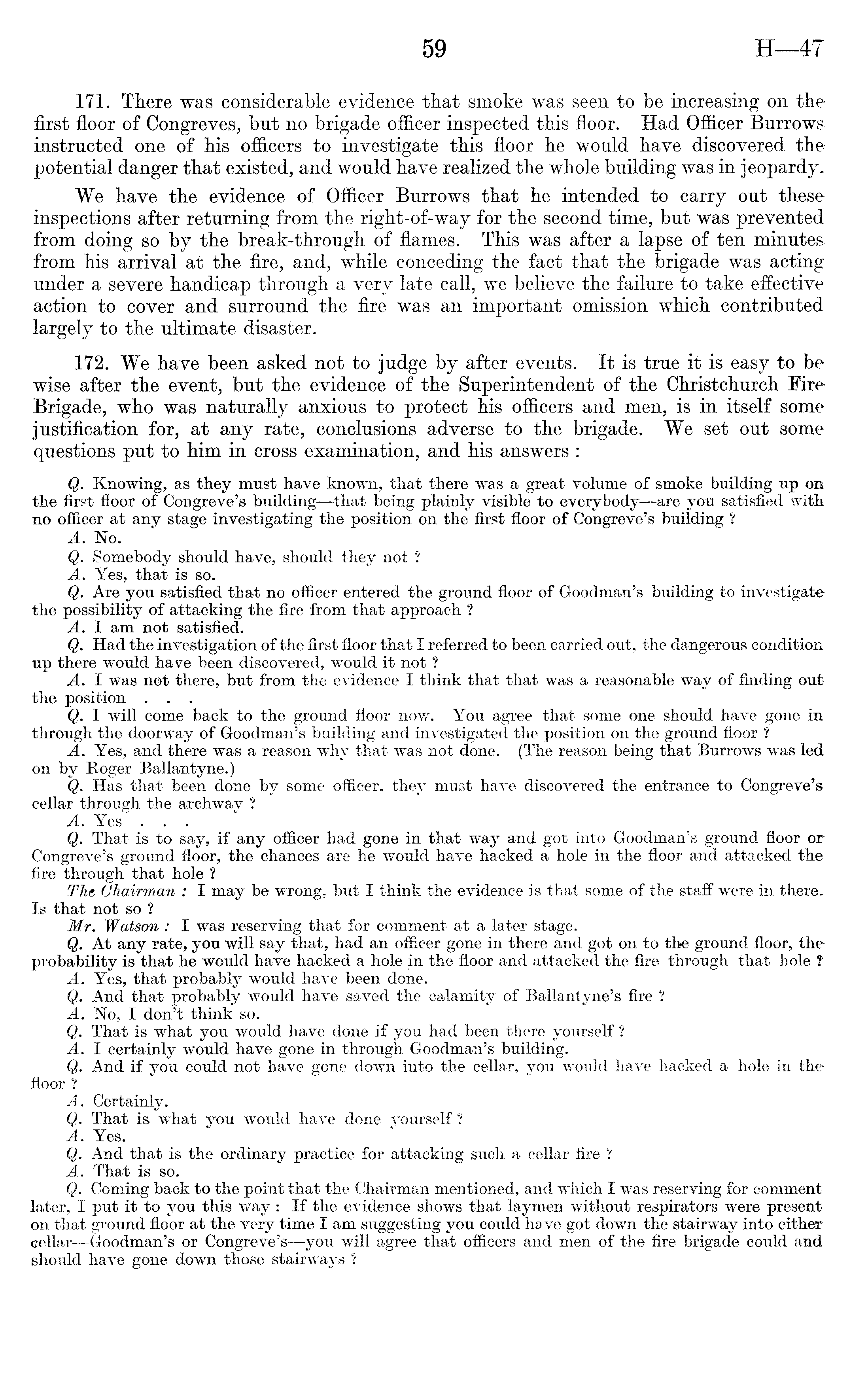 171. There was considerable evidence that smoke was seen to be increasing on the first floor of Congreves, but no brigade officer inspected this floor. Had Officer Burrows instructed one of his officers to investigate this floor he would have discovered the potential danger that existed, and would have realized the whole building was in jeopardy. We have the evidence of Officer Burrows that he intended to carry out these inspections after returning from the right-of-way for the second time, but was prevented from doing so by the break-through of flames. This was after a lapse of ten minutes from his arrival at the fire, and, while conceding the fact that the brigade was acting under a severe handicap through a very late call, we believe the failure to take effective action to cover and surround the fire was an important omission which contributed largely to the ultimate disaster. 172. We have been asked not to judge by after events. It is true it is easy to be wise after the event, but the evidence of the Superintendent of the Christchurch Fire Brigade, who was naturally anxious to protect his officers and men, is in itself some justification for, at any rate, conclusions adverse to the brigade. We set out some questions put to him in cross examination, and his answers : Q. Knowing, as they must have known, that there was a great volume of smoke building up on the first floor of Congreve's building—that being plainly visible to everybody—are you satisfied with no officer at any stage investigating the position on the first floor of Congreve's building ? A. No. Q. Somebody should have, should they not ? A. Yes, that is so. Q. Are you satisfied that no officer entered the ground floor of Goodman's building to investigate the possibility of attacking the fire from that approach ? A. I am not satisfied. Q. Had the investigation of the first floor that I referred to been carried out, the dangerous condition up there would have been discovered, would it not ? A. I was not there, but from the evidence I think that that was a reasonable way of finding out the position . . . Q. I will come back to the ground floor now. You agree that some one should have gone in through the doorway of Goodman's building and investigated the position on the ground floor ? A. Yes, and there was a reason why that was not done. (The reason being that Burrows was led on by Roger Ballantyne.) Q. Has that been done by some officer, they must have discovered the entrance to Congreve's cellar through the archway ? A. Yes . . . Q. That is to say, if any officer had gone in that way and got into Goodman's ground floor or Congreve's ground floor, the chances are he would have hacked a hole in the floor and attacked the fire through that hole ? The Chairman : I may be wrong, but I think the evidence is that some of the staff were in there. Is that not so ? Mr. Watson : I was reserving that for comment at a later stage. Q. At any rate, you will say that, had an officer gone in there and got on to the ground floor, the probability is that he would have hacked a hole in the floor and attacked the fire through that bole ? A. Yes, that probably would have been done. Q. And that probably would have saved the calamity of Ballantyne's fire ? A. No, I don't think so. Q. That is what you would have done if you had been there yourself ? A. I certainly would have gone in through Goodman's building. v Q. And if you could not have gone down into the cellar, you would have hacked a hole in the floor? A. Certainly. Q. That is what you would have done vourself ? A. Yes. Q. And that is the ordinary practice for attacking such a cellar fire ? A. That is so. Q. Coming back to the point that the Chairman mentioned, and which I was reserving for comment later, I put it to you this way: If the evidence shows that laymen without respirators were present on that ground floor at the very time I am suggesting you could have got down the stairway into either cellar- —Goodman's or Congreve's—you will agree that officers and men of the fire brigade could and should have gone down those stairways ?