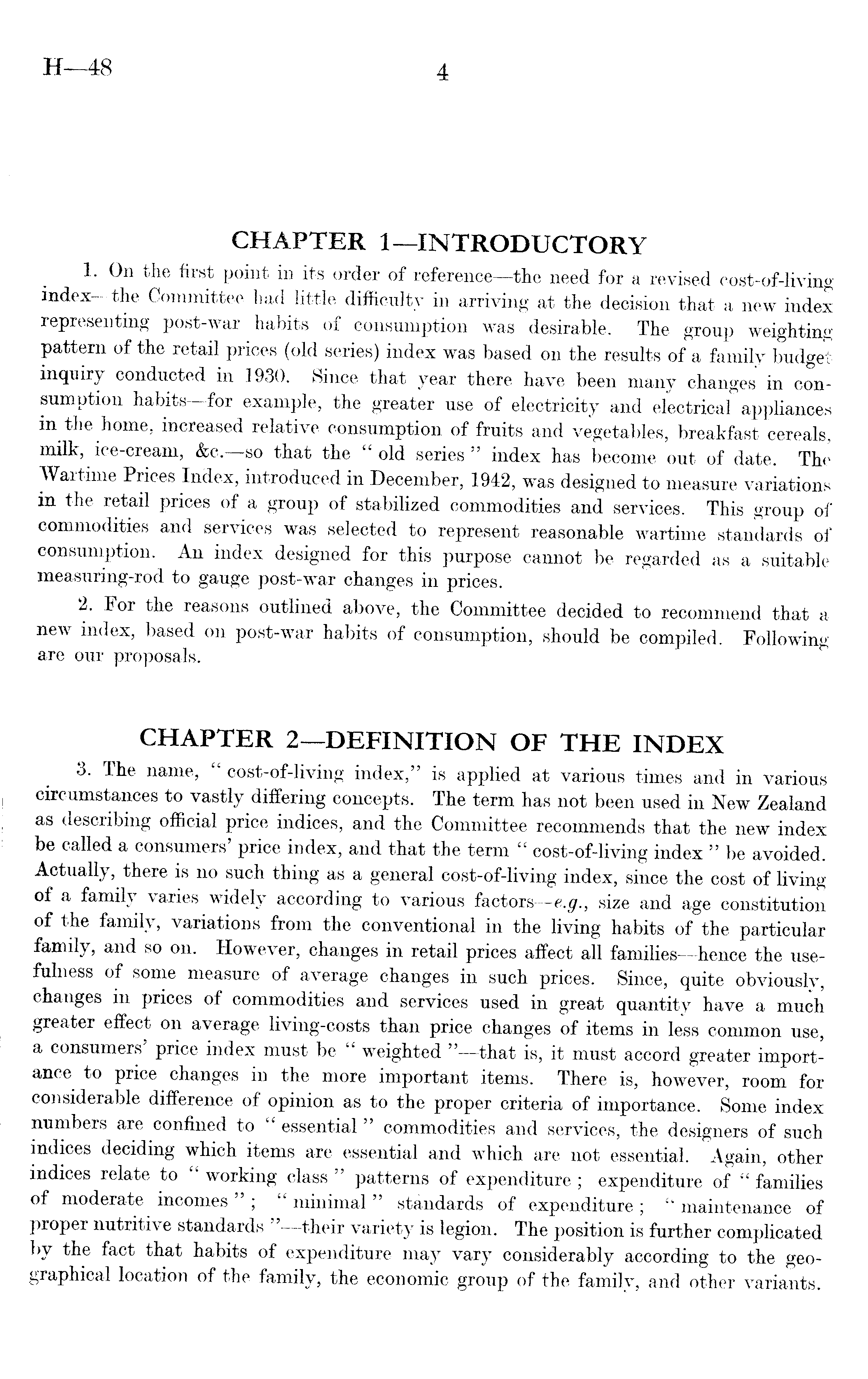 CHAPTER I—INTRODUCTORY 1. On the first point in its order of reference—the need for a revised cost-of-living index—the Committee had little difficulty in arriving at the decision that a new index representing post-war habits of consumption was desirable. The group weighting pattern of the retail prices (old series) index was based on the results of a family budget inquiry conducted in 1930. Since that year there have been many changes in consumption habits—for example, the greater use of electricity and electrical appliances m the home, increased relative consumption of fruits and vegetables, breakfast cereals, milk, ice-cream, &c. —so that the " old series " index has become out of date. The Wartime Prices Index, introduced in December, 1942, was designed to measure variations m the retail prices of a group of stabilized commodities and services. This group of commodities and services was selected to represent reasonable wartime standards of consumption. An index designed for this purpose cannot be regarded as a suitable measuring-rod to gauge post-war changes in prices. 2. For the reasons outlined above, the Committee decided to recommend that a new index, based on post-war habits of consumption, should be compiled. Following are our proposals. CHAPTER 2—DEFINITION OF THE INDEX 3. The name, " cost-of-living index," is applied at various times and in various circumstances to vastly differing concepts. The term has not been used in New Zealand as describing official price indices, and the Committee recommends that the new index be called a consumers' price index, and that the term " cost-of-living index " be avoided. Actually, there is no such thing as a general cost-of-living index, since the cost of living of a family varies widely according to various factors—e.g., size and age constitution of the family, variations from the conventional in the living habits of the particular family, and so on. However, changes in retail prices affect all families—hence the usefulness of some measure of average changes in such prices. Since, quite obviously, changes in prices of commodities and services used in great quantity have a much greater effect on average living-costs than price changes of items in less common use, a consumers' price index must be " weighted "—that is, it must accord greater importance to price changes in the more important items. There is, however, room for considerable difference of opinion as to the proper criteria of importance. Some index numbers are confined to " essential " commodities and services, the designers of such indices deciding which items are essential and which are not essential. Again, other indices relate to " working class " patterns of expenditure ; expenditure of " families of moderate incomes " ; " minimal " standards of expenditure ; " maintenance of proper nutritive standards " —their variety is legion. The position is further complicated by the fact that habits of expenditure may vary considerably according to the geographical location of the family, the economic group of the family, and other variants.