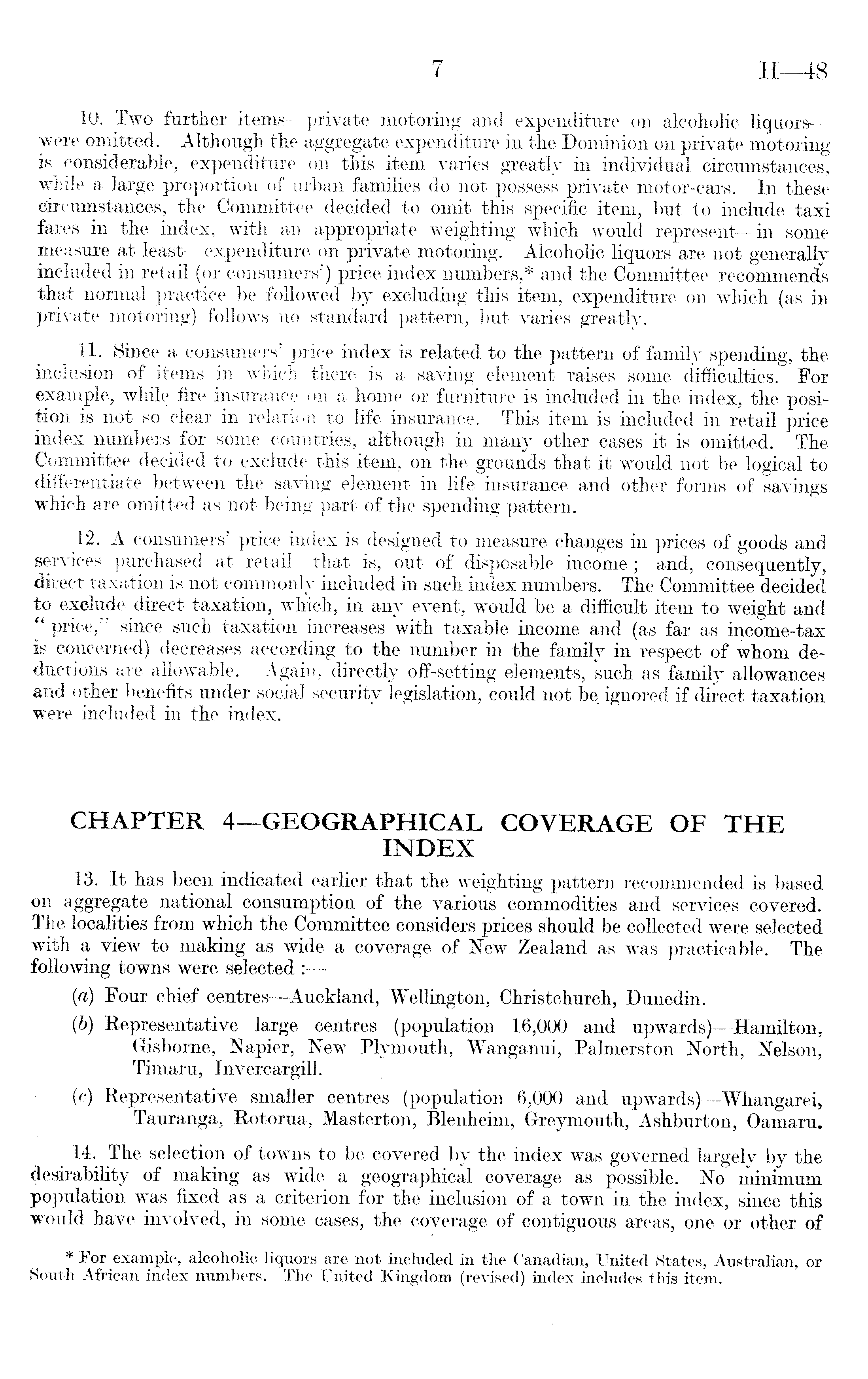 10. Two further items—private motoring and expenditure on alcoholic liquorswere omitted. Although the aggregate expenditure in the Dominion on private motoring is considerable, expenditure on this item varies greatly in individual circumstances, while a large proportion of urban families do not possess private motor-cars. In these circumstances, the Committee decided to omit this specific item, but to include taxi fares in the index, with an appropriate weighting which would represent —in some measure at least —expenditure on private motoring. Alcoholic liquors are not generally included in retail (or Consumers') price index numbers,* and the Committee recommends that normal practice be followed by excluding this item, expenditure on which (as in private motoring) follows 110 standard pattern, but varies greatly. 11. Since a consumers' price index is related to the pattern of family spending, the inclusion of items in which there is a saving element raises some difficulties. For example, while fire insurance on a home or furniture is included in the index, the position is not so clear in relation to life insurance. This item is included in retail price index numbers for some countries, although in many other cases it is omitted. The Committee decided to exclude this item, on the grounds that it would not be logical to differentiate between the saving element in life insurance and other forms of savings which are omitted as not being part of the spending pattern. 12. A consumers' price index is designed to measure changes in prices of goods and services purchased at retail —that is, out of disposable income; and, consequently, direct taxation is not commonly included in such index numbers. The Committee decided to exclude direct taxation, which, in any event, would be a difficult item to weight and " price," since such taxation increases with taxable income and (as far as income-tax is concerned) decreases according to the number in the family in respect of whom deductions are allowable. Again, directly off-setting elements, such as family allowances and other benefits under social security legislation, could not be ignored if direct taxation were included in the index. CHAPTER 4—GEOGRAPHICAL COVERAGE OF THE INDEX • 13. It has been indicated earlier that the weighting pattern recommended is based on aggregate national consumption of the various commodities and services covered. The localities from which the Committee considers prices should be collected were selected with a view to making as wide a coverage of New Zealand as was practicable. The following towns were selected : {a) Four chief centres —Auckland, Wellington, Christchurch, Dunedin. (6) Representative large centres (population 16,000 and upwards) —Hamilton, Gisborne, Napier, New Plymouth, Wanganui, Palmerston North, Nelson, Timaru, Invercargill. v (c) Representative smaller centres (population 6,000 and upwards)—Whangarei, Tauranga, Rotorua, Masterton, Blenheim, Greymouth, Ashburton, Oamaru. 14. The selection of towns to be covered by the index was governed largely by the desirability of making as wide a geographical coverage as possible. No minimum population was fixed as a criterion for the inclusion of a town in the index, since this would have involved, in some cases, the coverage of contiguous areas, one or other of * For example, alcoholic liquors are not included in the Canadian, United States, Australian, or South African index numbers. The United Kingdom (revised) index includes this item.