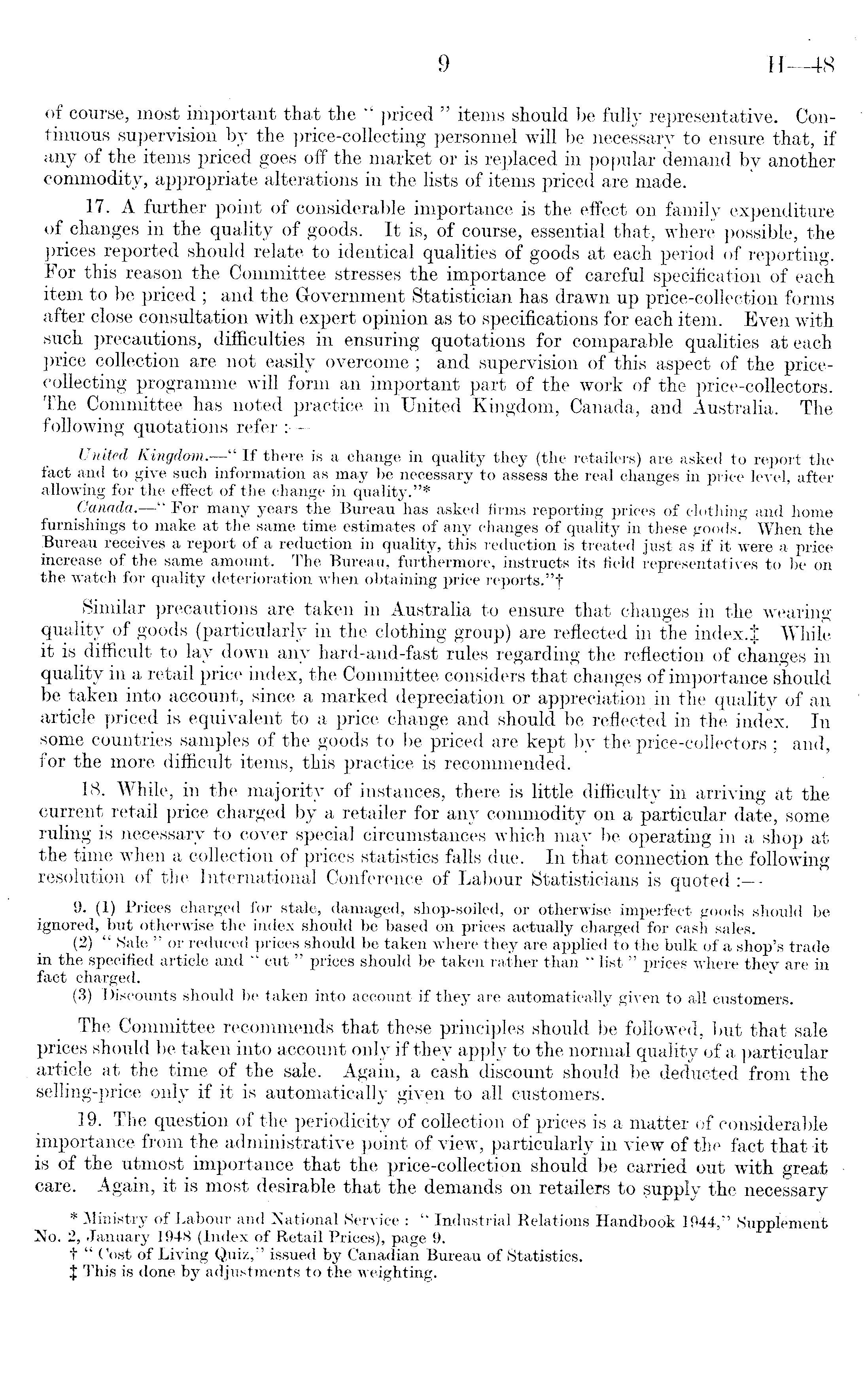 of course, most important that the " priced " items should be fully representative. Continuous supervision by the price-collecting personnel will be necessary to ensure that, if any of the items priced goes off the market or is replaced in popular demand by another commodity, appropriate alterations in the lists of items priced are made. 17. A further point of considerable importance is the effect on family expenditure of changes in the quality of goods. It is, of course, essential that, where possible, the prices reported should relate to identical qualities of goods at each period of reporting. For this reason the Committee stresses the importance of careful specification of each item to be priced ; and the Government Statistician has drawn up price-collection forms after close consultation with expert opinion as to specifications for each item. Even with such precautions, difficulties in ensuring quotations for comparable qualities at each price collection are not easily overcome ; and supervision of this aspect of the pricecollecting programme will form an important part of the work of the price-collectors. The Committee has noted practice in United Kingdom, Canada, and Australia. The following quotations refer : United Kingdom.— '' If there is a change in quality they (the retailers) are asked to report the fact and to give such information as may be necessary to assess the real changes in price level, after allowing for the effect of the change in quality."* Canada.—" For many years the Bureau has asked firms reporting prices of clothing and home furnishings to make at the same time estimates of any changes of quality in these goods. When the Bureau receives a report of a reduction in quality, this reduction is treated just as if it were a price increase of the same amount. The Bureau, furthermore, instructs its field representatives to be on the watch for quality deterioration when obtaining price reports."f Similar precautions are taken in Australia to ensure that changes in the wearing quality of goods (particularly in the clothing group) are reflected in the index.! While it is difficult to lay down any hard-and-fast rules regarding the reflection of changes in quality in a retail price index, the Committee considers that changes of importance should be taken into account, since a marked depreciation or appreciation in the quality of an article priced is equivalent to a price change and should be reflected in the index. In some countries samples of the goods to be priced are kept by the price-collectors ; and, for the more difficult items, this practice is recommended. 18. While, in the majority of instances, there is little difficulty in arriving at the current retail price charged by a retailer for any commodity on a particular date, some ruling is necessary to cover special circumstances which may be operating in a shop at the time when a collection of prices statistics falls due. In that connection the following resolution of the International Conference of Labour Statisticians is quoted : 9. (1) Prices charged for stale, damaged, shop-soiled, or otherwise imperfect goods should be ignored, but otherwise the index should be based on prices actually charged for cash sales. (2) " Sale " or reduced prices should be taken where they are applied to the bulk of a shop's trade in the specified article and " cut " prices should be taken rather than " list " prices where they are in fact charged. (3) Discounts should be taken into account if they are automatically given to all customers. The Committee recommends that these principles should be followed, but that sale prices should be taken into account only if they apply to the normal quality of a particular article at the time of the sale. Again, a cash discount should be deducted from the selling-price only if it is automatically given to all customers. 19. The question of the periodicity of collection of prices is a matter of considerable importance from the administrative point of view, particularly in view of the fact that it is of the utmost importance that the price-collection should be carried out with great care. Again, it is most desirable that the demands on retailers to supply the necessary * Ministry of Labour and National Service : " Industrial Relations Handbook 1944," Supplement No. 2, January 1948 (Index of Retail Prices), page 9. t " Cost of Living Quiz," issued by Canadian Bureau of Statistics. J This is done by adjustments to the weighting.