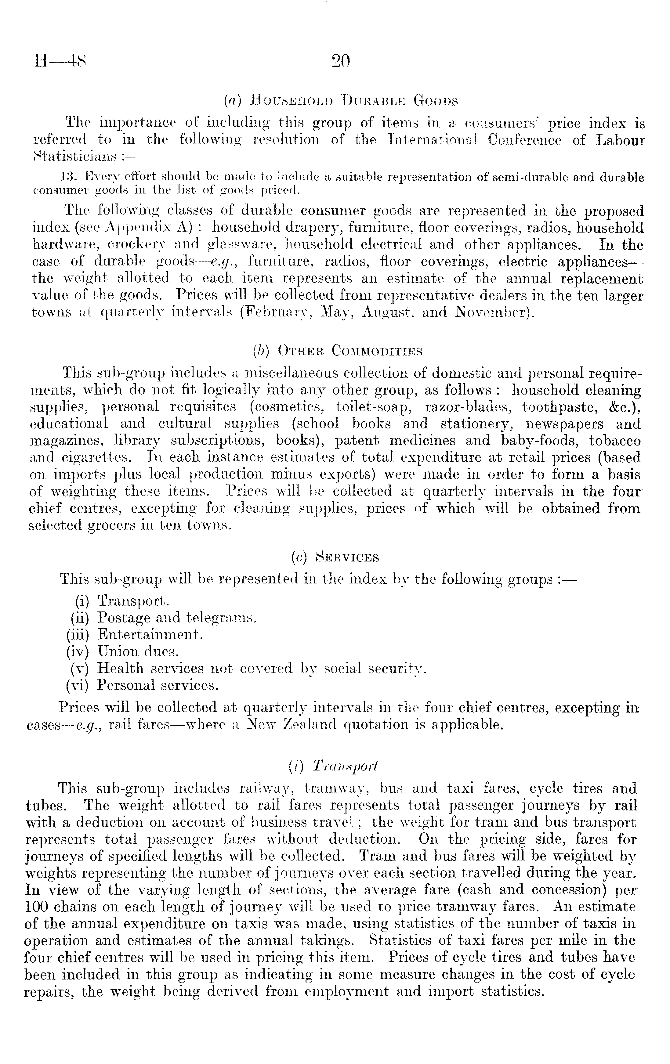 (a) Household Durable Goods The importance of including this group of items in a consumers' price index is referred to in the following resolution of the International Conference of Labour Statisticians : 13. Every effort should be made to include a suitable representation of semi-durable and durable consumer goods in the list of goods priced. The following classes of durable consumer goods are represented in the proposed index (see Appendix A) : household drapery, furniture, floor coverings, radios, household hardware, crockery and glassware, household electrical and other appliances. In the case of durable goods —e.g., furniture, radios, floor coverings, electric appliances—the weight allotted to each item represents an estimate of the annual replacement value of the goods. Prices will be collected from representative dealers in the ten larger towns at quarterly intervals (February, May, August, and November). (b) Other Commodities This sub-group includes a miscellaneous collection of domestic and personal requirements, which do not fit logically into any other group, as follows : household cleaning supplies, personal requisites (cosmetics, toilet-soap, razor-blades, toothpaste, &c.), educational and cultural supplies (school books and stationery, newspapers and magazines, library subscriptions, books), patent medicines and baby-foods, tobacco and cigarettes. In each instance estimates of total expenditure at retail prices (based on imports plus local production minus exports) were made in order to form a basis of weighting these items. Prices will be collected at quarterly intervals in the fourchief centres, excepting for cleaning supplies, prices of which will be obtained from selected grocers in ten towns. (c) Services This sub-group will be represented in the index by the following groups : (i) Transport. (ii) Postage and telegrams. (iii) Entertainment. (iv) Union dues. (v) Health services not covered by social security. (vi) Personal services. Prices will be collected at quarterly intervals in the four chief centres, excepting in cases —e.g., rail fares —where a New Zealand quotation is applicable. (i) Transport This sub-group includes railway, tramway, bus and taxi fares, cycle tires and tubes. The weight allotted to rail fares represents total passenger journeys by rail with a deduction 011 account of business travel; the weight for tram and bus transport represents total passenger fares without deduction. On the pricing side, fares for journeys of specified lengths will be collected. Tram and bus fares will be weighted by weights representing the number of journeys over each section travelled during the year. In view of the varying length of sections, the average fare (cash and concession) per 100 chains on each length of journey will be used to price tramway fares. An estimate of the annual expenditure on taxis was made, using statistics of the number of taxis in operation and estimates of the annual takings. Statistics of taxi fares per mile in the four chief centres will be used in pricing this item. Prices of cycle tires and tubes have been included in this group as indicating in some measure changes in the cost of cycle repairs, the weight being derived from employment and import statistics.