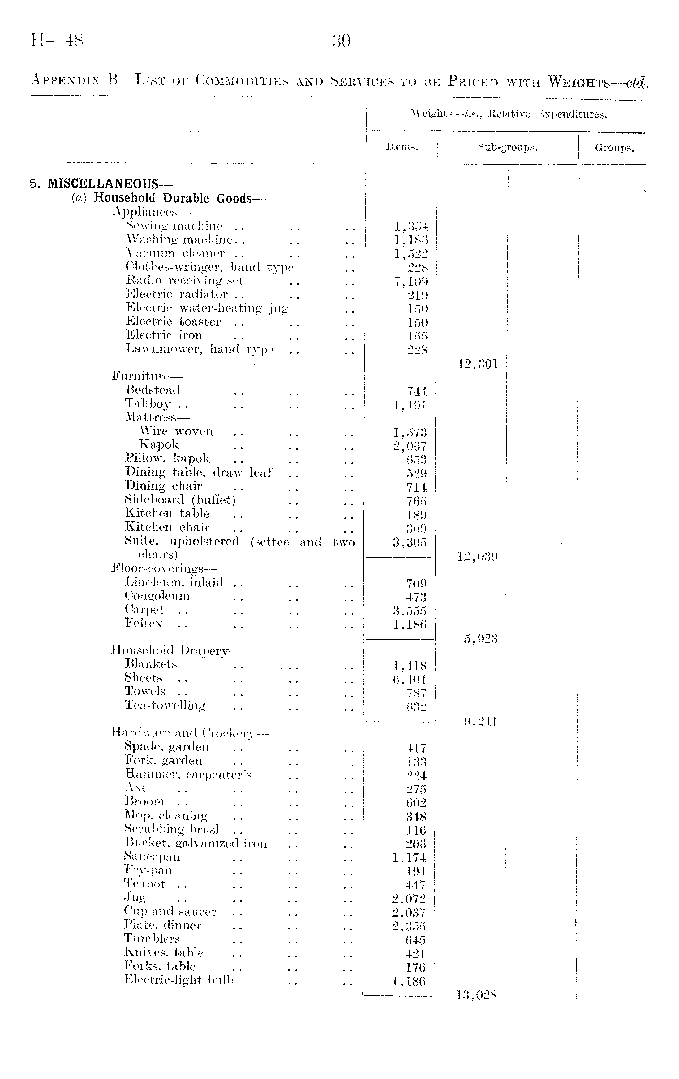 Weights—i.e., Relative Expenditures. Items. Sub-groups. | Groups. 5. MISCELLANEOUS— | (a) Household Durable Goods— { Appliances— | Sewing-machine 1,354 Washing-machine.. 1,188 Vacuum cleaner 1,522 Clothes-wringer, hand type 228 Radio receiving-set 7,109 Electric radiator 219 Electric water-heating jug 150 Electric toaster 150 1 Electric iron 155 1 Lawnmower, hand type 228 - 12,301 Furniture— Bedstead 744 Tallboy 1,191 ! Mattress— I Wire woven 1,573 | Kapok 2,067 Pillow, kapok 653 Dining table, draw leaf 529 Dining chair 714 Sideboard (buffet) 765 Kitchen table 189 Kitchen chair 309 Suite, upholstered (settee and two 3,305 ■ chairs) 12,039 Floor-coverings— Linoleum, inlaid 709 Congoleum 473 Carpet 3,555 Feltex .. 1,186 5,923 Household Drapery— Blankets .. ... 1,418 Sheets 6,404 Towels 787 Tea-towelling 632 9.241 Hardware and CrockerySpade, garden 417 Fork, garden 133 Hammer, carpenter's 224 Axe 275 Broom 602 Mop, cleaning 348 Scrubbing-brush 116 Bucket, galvanized iron 206 Saucepan 1,174 Fry-pan 194 Teapot .. 447 Jug 2,072 Cup and saucer 2,037 Plate, dinner 2,355 Tumblers 645 Knives, table 421 Forks, table 176 Electric-light bulb 1,186 13,028