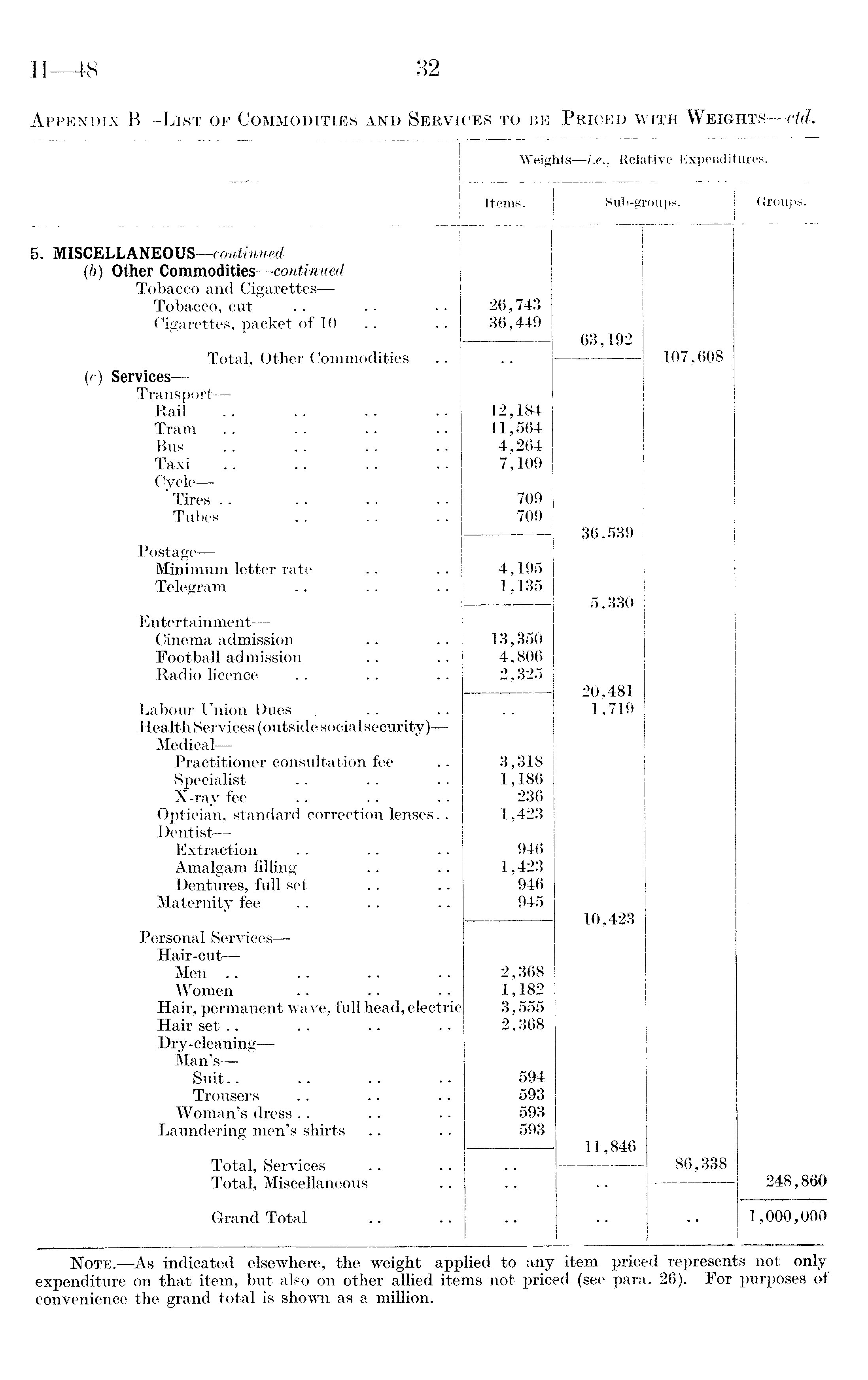 Note.—As indicated elsewhere, the weight applied to any item priced represents not only expenditure on that item, but also on other allied items not priced (see para. 26). For purposes of convenience the grand total is shown as a million.