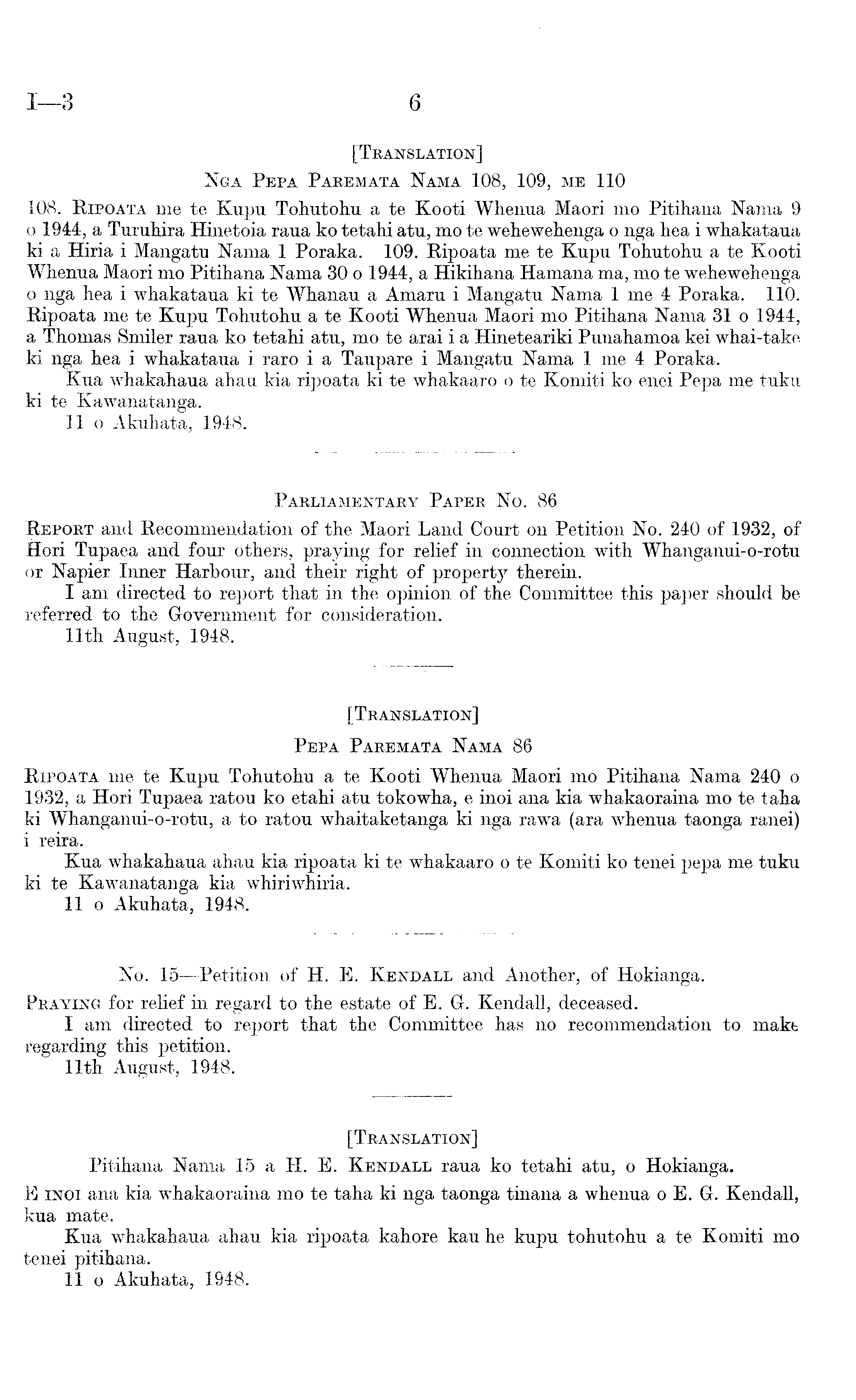 [Translation] Nga Pepa Paremata Nama 108, 109, me 110 108. Ripoata mete Kupu Tohutohu ate Kooti Whenua Maori mo Pitihana Nama 9 o 1944, a Turuhira Hinetoia raua ko tetahi atu, mo te wehewehenga o nga hea i whakataua ki a Hiria i Mangatu Nama 1 Poraka. 109. Ripoata mete Kupu Tohutohu ate Kooti Whenua Maori mo Pitihana Nama 30 o 1944, a Hikihana Hamana ma, mo te wehewehenga o nga hea i whakataua kite Whanau a Amaru i Mangatu Nama Ime 4 Poraka. 110. Ripoata mete Kupu Tohutohu ate Kooti Whenua Maori mo Pitihana Nama 31 o 1944, a Thomas Smiler raua ko tetahi atu, mo te arai i a Hineteariki Punahamoa kei whai-take ki nga hea i whakataua i raro i a Taupare i Mangatu Nama 1 me 4 Poraka. Kua whakahaua ahau kia ripoata kite whakaaro ote Komiti ko enei Pepa me tuku kite Kawanatanga. 11 o Akuhata, 1948.
