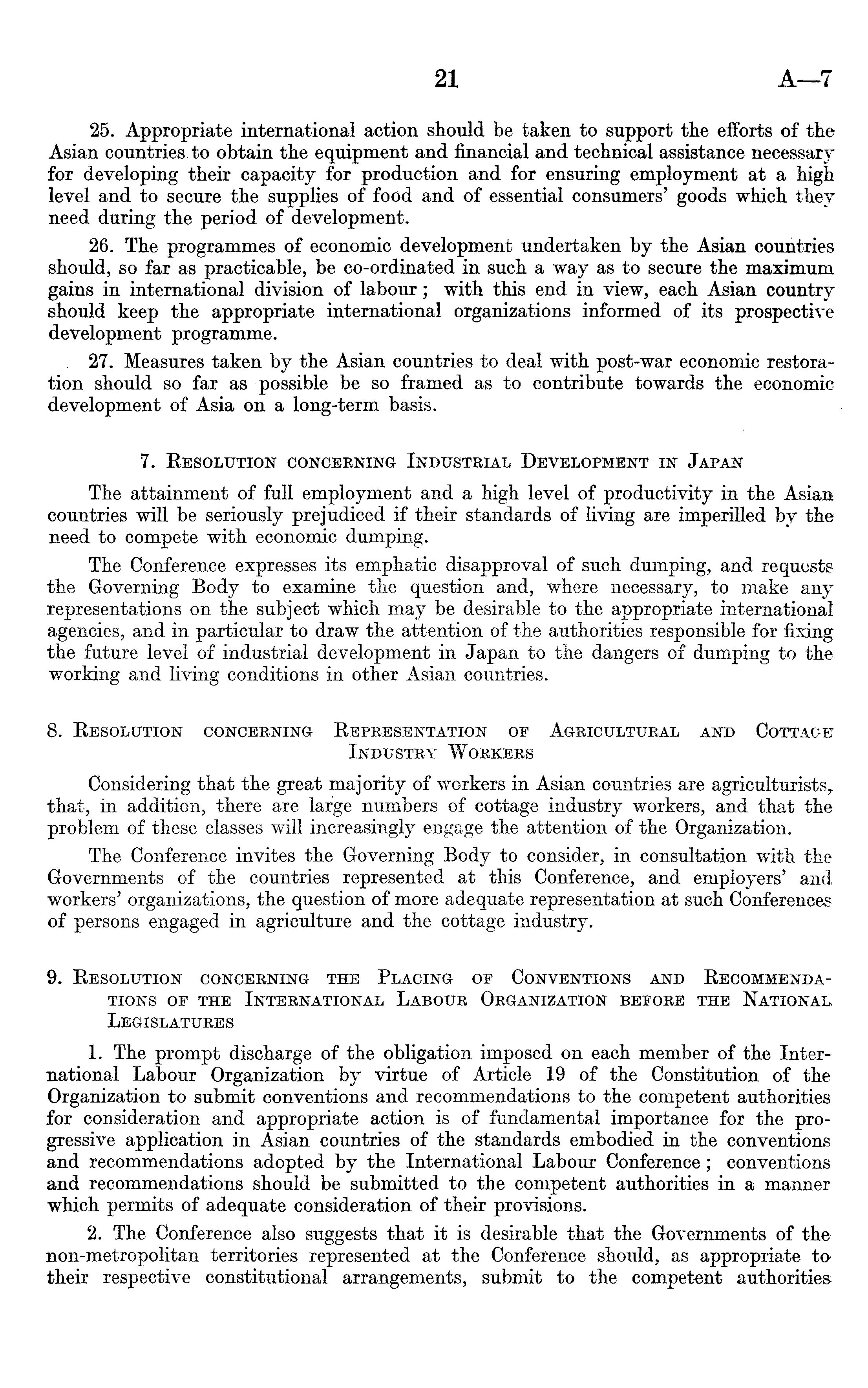 25. Appropriate international action should be taken to support the efforts of the Asian countries to obtain the equipment and financial and technical assistance necessary for developing their capacity for production and for ensuring employment at a high level and to secure the supplies of food and of essential consumers' goods which they need during the period of development. 26. The programmes of economic development undertaken by the Asian countries should, so far as practicable, be co-ordinated in such a way as to secure the maximum gains in international division of labour; with this end in view, each Asian country should keep the appropriate international organizations informed of its prospective development programme. 27. Measures taken by the Asian countries to deal with post-war economic restoration should so far as possible be so framed as to contribute towards the economic development of Asia on a long-term basis. 7. Resolution concerning Industrial Development in Japan The attainment of full employment and a high level of productivity in the Asi art countries will be seriously prejudiced if their standards of living are imperilled by the need to compete with economic dumping. The Conference expresses its emphatic disapproval of such dumping, and requests the Governing Body to examine the question and, where necessary, to make any representations on the subject which may be desirable to the appropriate international agencies, and in particular to draw the attention of the authorities responsible for fixing the future level of industrial development in Japan to the dangers of dumping to the working and living conditions in other Asian countries. 8. Resolution concerning Representation of Agricultural and Cottage Industry Workers Considering that the great majority of workers in Asian countries are agriculturists, that, in addition, there are large numbers of cottage industry workers, and that the problem of these classes will increasingly engage the attention of the Organization. The Conference invites the Governing Body to consider, in consultation with the Governments of the countries represented at this Conference, and employers' and workers' organizations, the question of more adequate representation at such Conferences of persons engaged in agriculture and the cottage industry. 9. Resolution concerning the Placing op Conventions and Recommendations op the International Labour Organization bepore the National Legislatures 1. The prompt discharge of the obligation imposed on each member of the International Labour Organization by virtue of Article 19 of the Constitution of the Organization to submit conventions and recommendations to the competent authorities for consideration and appropriate action is of fundamental importance for the progressive application in Asian countries of the standards embodied in the conventions and recommendations adopted by the International Labour Conference ; conventions and recommendations should be submitted to the competent authorities in a manner which permits of adequate consideration of their provisions. 2. The Conference also suggests that it is desirable that the Governments of the non-metropolitan territories represented at the Conference should, as appropriate to their respective constitutional arrangements, submit to the competent authorities