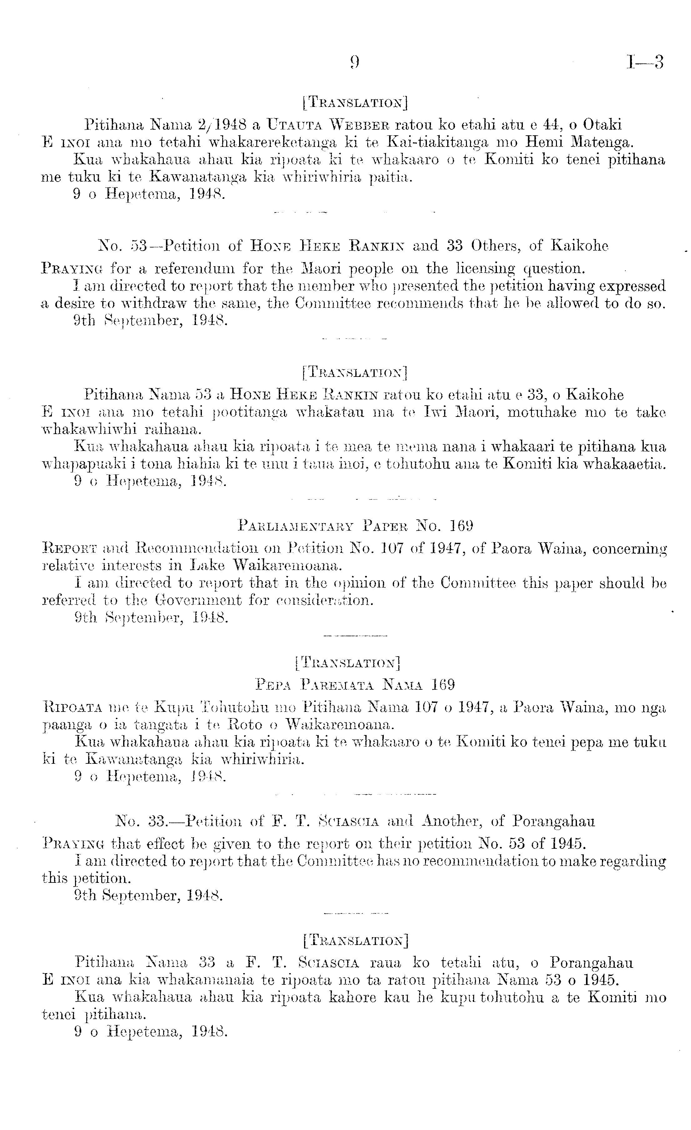 No. 53—Petition of Hone Heke Kankin and 33 Others, of Kaikohe Praying for a referendum for the Maori people on the licensing question. I am directed to report that the member who presented the petition having expressed a desire to withdraw the same, the Committee recommends that he be allowed to do so. 9th September, 1948. [Translation] Pitihana Nama 53 a Hone Heke Eankin ratou ko etahi atu e 33, o Kaikohe B inoi ana mo tetahi pootitanga whakatau ma te Iwi Maori, motuhake mo te take whakawhiwhi raihana. Kua whakahaua ahau kia ripoata i te mea te meina nana i whakaari te pitihana kua whapapuaki i tona hiahia kite unu i tana inoi, e tohutohu ana te Komiti kia whakaaetia. 9 o Hepetema, 1948.