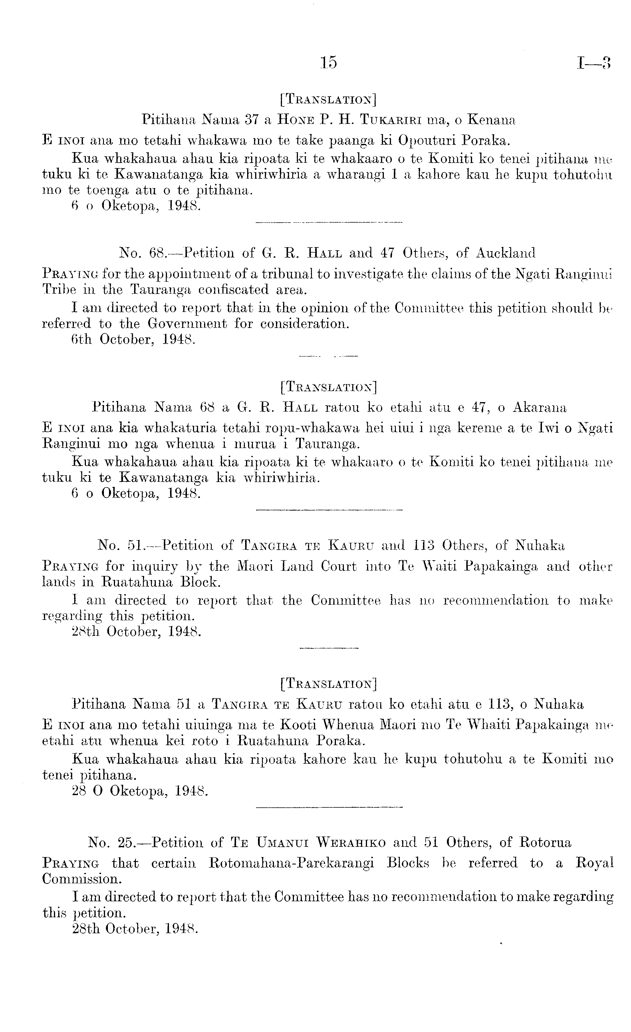 [Translation] Pitihana Nama 37 a Hone P. H. Tukariri ma, o Kenana E inoi ana mo tetahi whakawa mo te take paanga ki Opouturi Poraka. Kua whakahaua ahau kia ripoata kite whakaaro o te Komiti ko tenei pitihana me tuku kite Kawanatanga kia whiriwhiria a wkarangi 1 a kahore kau he kupu tohutohu mo te toenga atu o te pitihana. 6 o Oketopa, 1948.