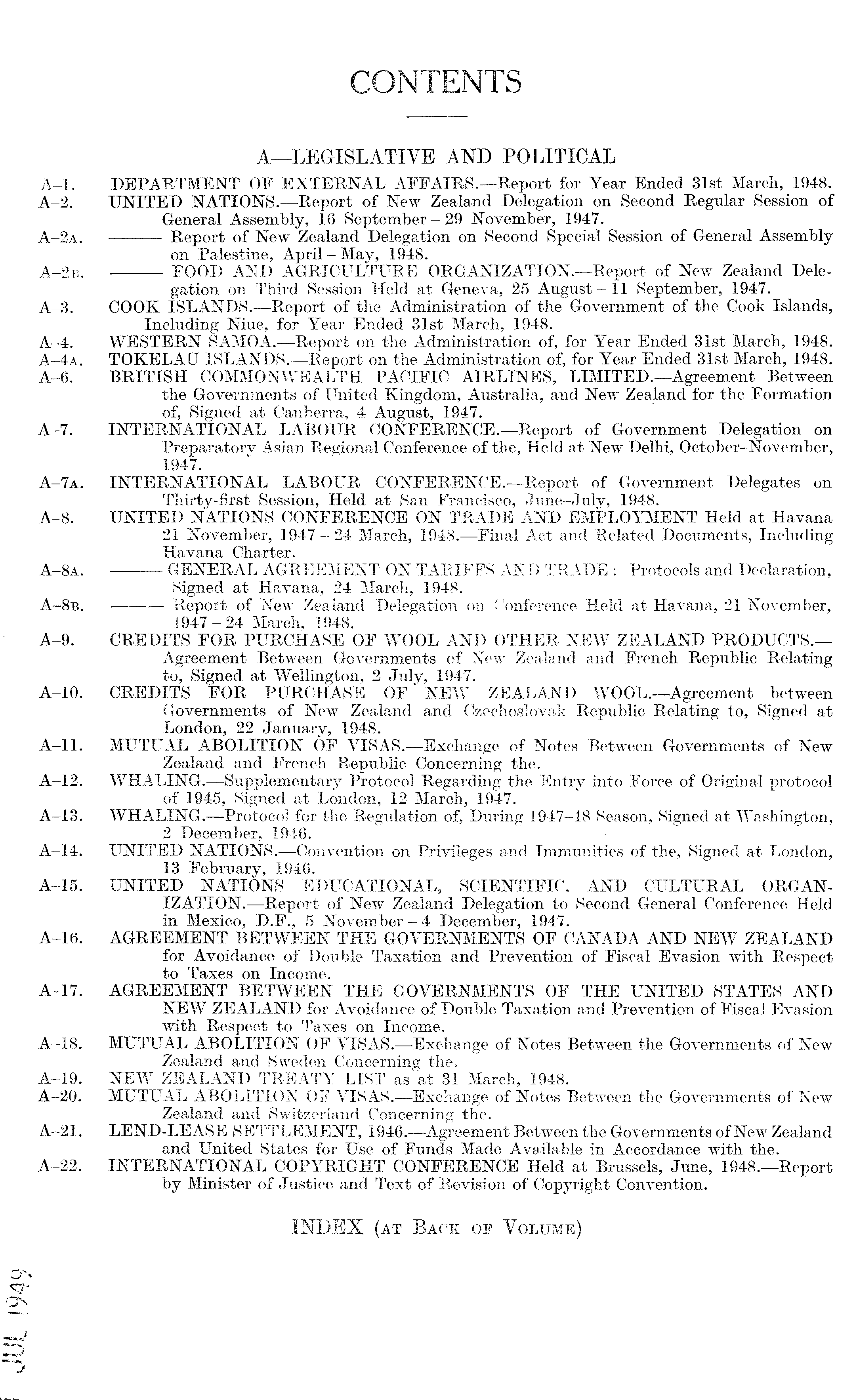 CONTENTS A—LEGISLATIVE AND POLITICAL A-l. DEPARTMENT OE EXTERNAL AFFAIRS.—Report for Year Ended 31st March, 1948. A-2. UNITED NATIONS. —Report of New Zealand Delegation on Second Regular Session of General Assembly, 16 September - 29 November, 1947. A-2a. Report of New Zealand Delegation on Second Special Session of General Assembly on Palestine, April-May, 1948. A-2b. FOOD AND AGRICULTURE ORGANIZATION.—Report of New Zealand Delegation on Third Session Held at Geneva, 25 August-11 September, 1947. A-3. COOK ISLANDS.—Report of the Administration of the Government of the Cook Islands, Including Niue, for Year Ended 31st March, 1948. A-4. WESTERN SAMOA.—Report on the Administration of, for Year Ended 31st March, 1948. A-4a. TOKELAU ISLANDS.—Report on the Administration of, for Year Ended 31st March, 1948. A-6. BRITISH COMMONWEALTH PACIFIC AIRLINES, LlMlTED.—Agreement Between the Governments of United Kingdom, Australia, and New Zealand for the Formation of, Signed at Canberra, 4 August, 1947. A-7. INTERNATIONAL LABOUR CONFERENCE.—Report of Government Delegation on Preparatory Asian Regional Conference of the, Held at New Delhi, October-November, 1947. A-7a. INTERNATIONAL LABOUR CONFERENCE.—Report of Government Delegates on Thirty-first Session, Held at San Francisco, June-July, 1948. A-8. UNITED NATIONS CONFERENCE ON TRADE AND EMPLOYMENT Held at Havana 21 November, 1947 - 24 March, 1948.—Final Act and Related Documents, Including Havana Charter. A-Ba. GENERAL AGREEMENT ON TARIFFS AND TRADE : Protocols and Declaration, Signed at Havana, 24 March, 1948. A-Bb. Report of New Zealand Delegation on Conference Held at Havana, 21 November, 1947 -24 March, 1948. A-9. CREDITS FOR PURCHASE OF WOOL AND OTHER NEW ZEALAND PRODUCTS.— Agreement Between Governments of New Zealand and French Republic Relating to, Signed at Wellington, 2 July, 1947. A-10. CREDITS FOR PURCHASE OF NEW ZEALAND WOOL.—Agreement between Governments of New Zealand and Czechoslovak Republic Relating to, Signed at London, 22 January, 1948. A-11. MUTUAL ABOLITION OF VlSAS.—Exchange of Notes Between Governments of New Zealand and French Republic Concerning the. A-12. WHALlNG.—Supplementary Protocol Regarding the Entry into Force of Original protocol of 1945, Signed, at London, 12 March, 1947. A-13. WHALlNG.—Protocol for the Regulation of, During 1947-48 Season, Signed at Washington, 2 December, 1946. A-14. UNITED NATlONS.—Convention on Privileges and Immunities of the, Signed at London, 13 February, 1946. A-15. UNITED NATIONS EDUCATIONAL, SCIENTIFIC, AND CULTURAL ORGANIZATION.—Report of New Zealand Delegation to Second General Conference Held in Mexico, D.F., 5 November - 4 December, 1947. A-16. AGREEMENT BETWEEN THE GOVERNMENTS OF CANADA AND NEW ZEALAND for Avoidance of Double Taxation and Prevention of Fiscal Evasion with Respect to Taxes on Income. A-l 7. AGREEMENT BETWEEN THE GOVERNMENTS OF THE UNITED STATES AND NEW ZEALAND for Avoidance of Double Taxation and Prevention of Fiscal Evasion with Respect to Taxes on Income. A-18. MUTUAL ABOLITION OF VISAS. —Exchange of Notes Between the Governments of New Zealand and Sweden Concerning the. A-19. NEW ZEALAND TREATY LIST as at 31 March, 1948. A-20. MUTUAL ABOLITION OF VISAS. —Exchange of Notes Between the Governments of New Zealand and Switzerland Concerning the. A-21. LEND-LEASE SETTLEMENT, 1946.—Agreement Between the Governments of New Zealand and United States for Use of Funds Made Available in Accordance with the. A-22. INTERNATIONAL COPYRIGHT CONFERENCE Held at Brussels, June, 1948.—Report by Minister of Justice and Text of Revision of Copyright Convention. INDEX (at Back of Volume)
