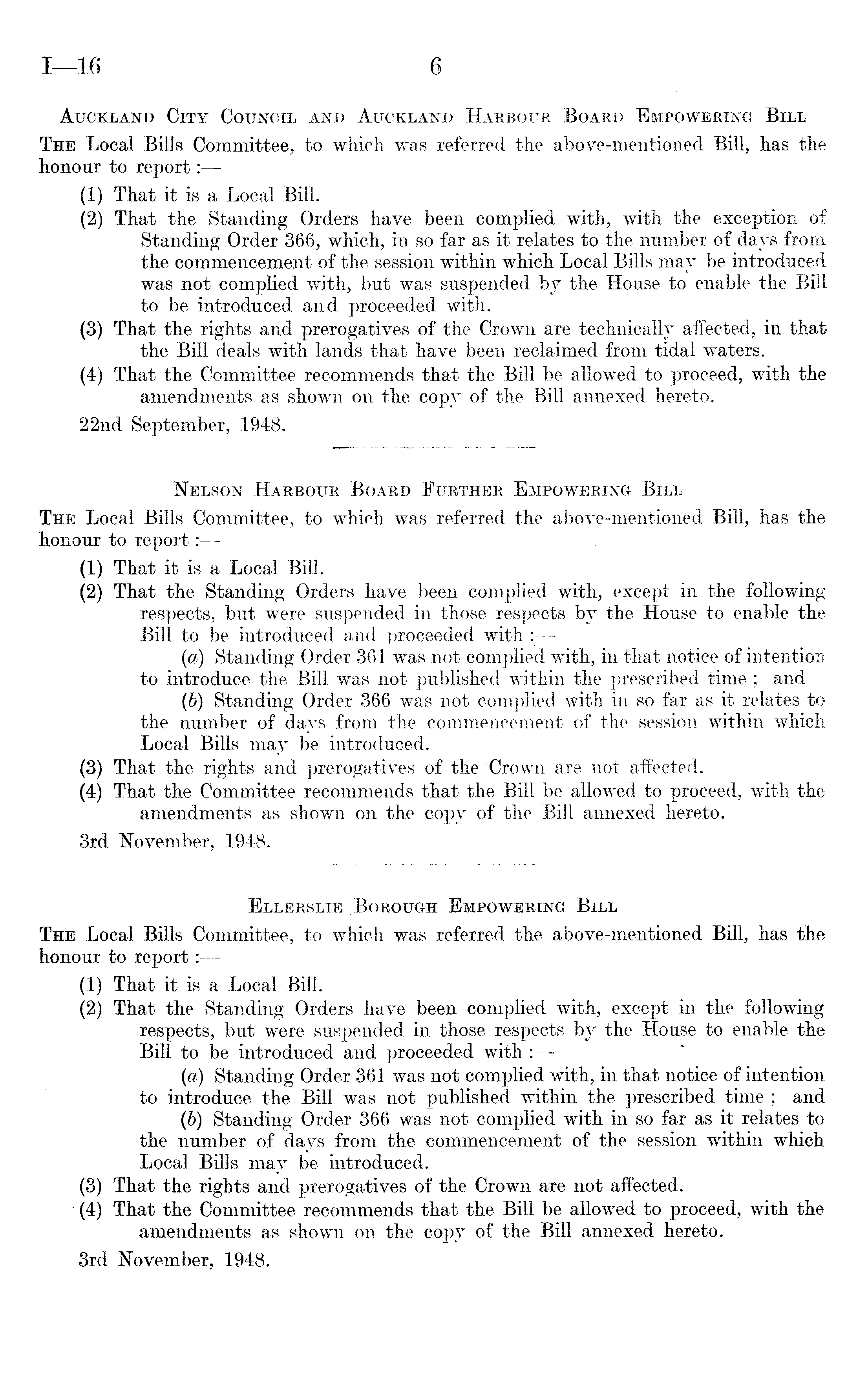 Nelson Harboub Boabd Fubtheb Empowering Bill The Local Bills Committee, to which was referred the above-mentioned Bill, has the honour to report: — (1) That it is a Local Bill. (2) That the Standing Orders have been complied with, except in the following respects, but were suspended in those respects by the House to enable the Bill to be introduced and proceeded with : (a) Standing Order 361 was not complied with, in that notice of intention to introduce the Bill was not published within the prescribed time ; and (b) Standing Order 366 was not complied with in so far as it relates to the number of days from the commencement of the session within which Local Bills may be introduced. (3) That the rights and prerogatives of the Crown are not affected. (4) That the Committee recommends that the Bill be allowed to proceed, with the amendments as shown on the copy of the Bill annexed hereto. 3rd November, 1948.