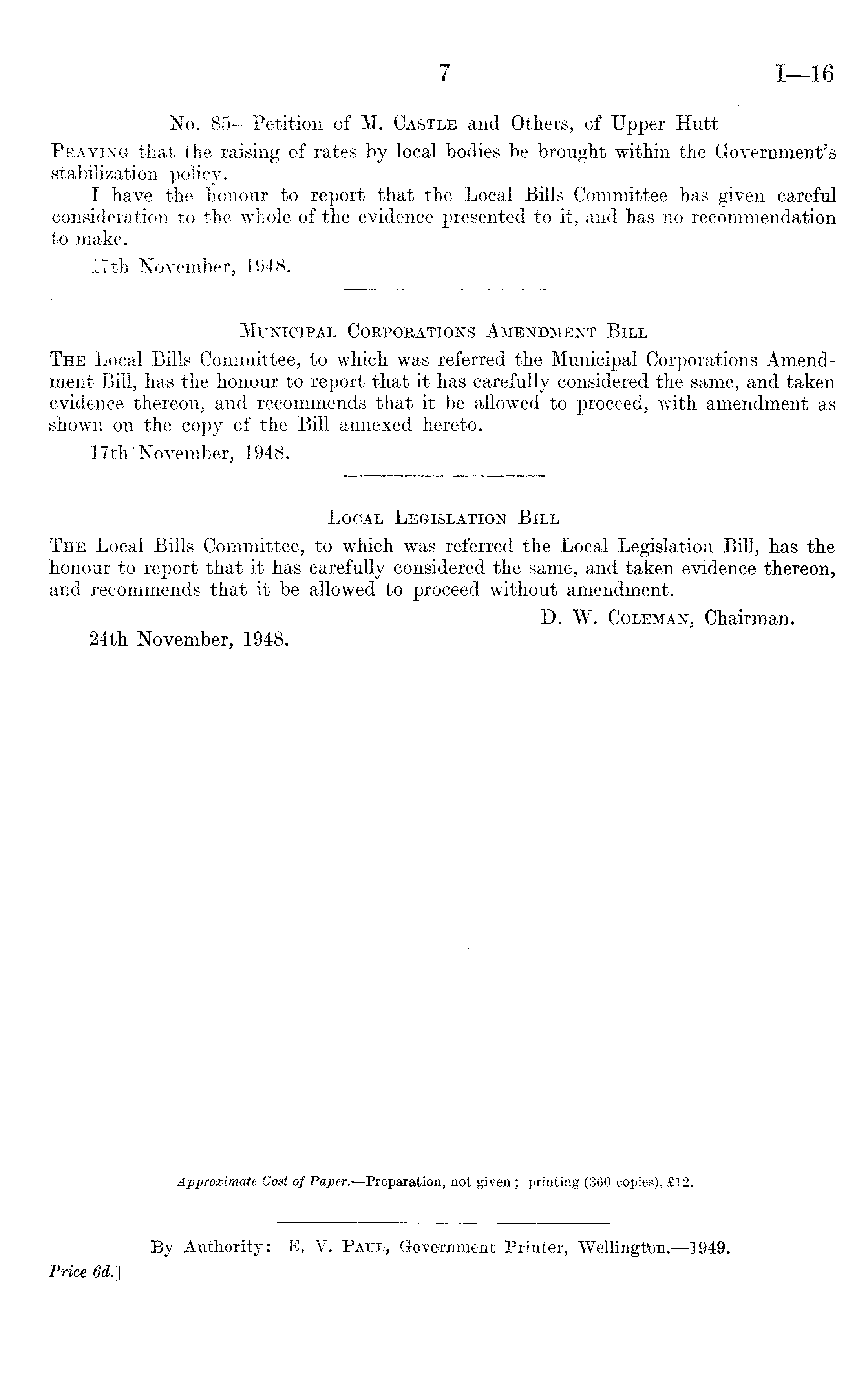 Local Legislation Bill The Local Bills Committee, to which was referred the Local Legislation Bill, has the honour to report that it has carefully considered the same, and taken evidence thereon, and recommends that it be allowed to proceed without amendment. D. W. Coleman, Chairman. 24th November, 1948.