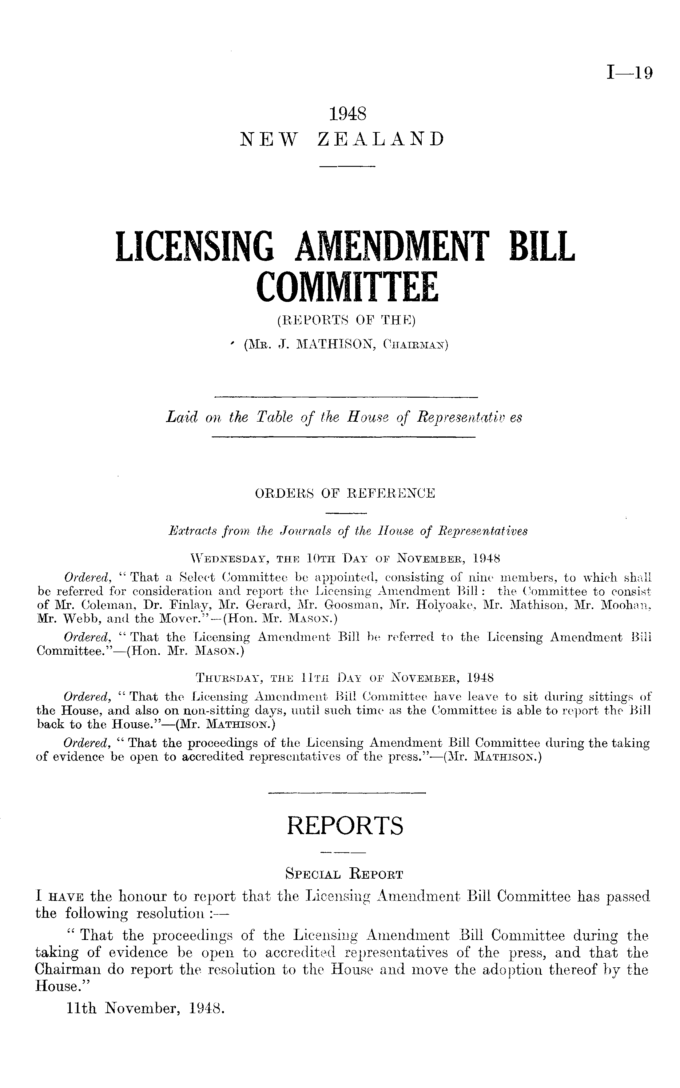 Extracts from the Journals of the House of Representatives Wednesday, the 10th Day of November, 1948 Ordered, " That a Select Committee be appointed, consisting of nine members, to which shall be referred for consideration and report the Licensing Amendment Bill: the Committee to consist of Mr. Coleman, Dr. Finlay, Mr. Gerard, Mr. Goosman, Mr. Holyoake, Mr. Mathison, Mr. Moohan, Mr. Webb, and the Mover." —(Hon. Mr. Mason.) Ordered, " That the Licensing Amendment Bill be referred to the Licensing Amendment Bill Committee." —(Hon. Mr. Mason.) Thursday, the 11th Day oe November, 1948 Ordered, " That the Licensing Amendment Bill Committee have leave to sit during sittings of the House, and also on non-sitting days, until such time as the Committee is able to report the Bill back to the House." —(Mr. Mathison.) Ordered, " That the proceedings of the Licensing Amendment Bill Committee during the taking of evidence be open to accredited representatives of the press."-—(Mr. Mathison.)