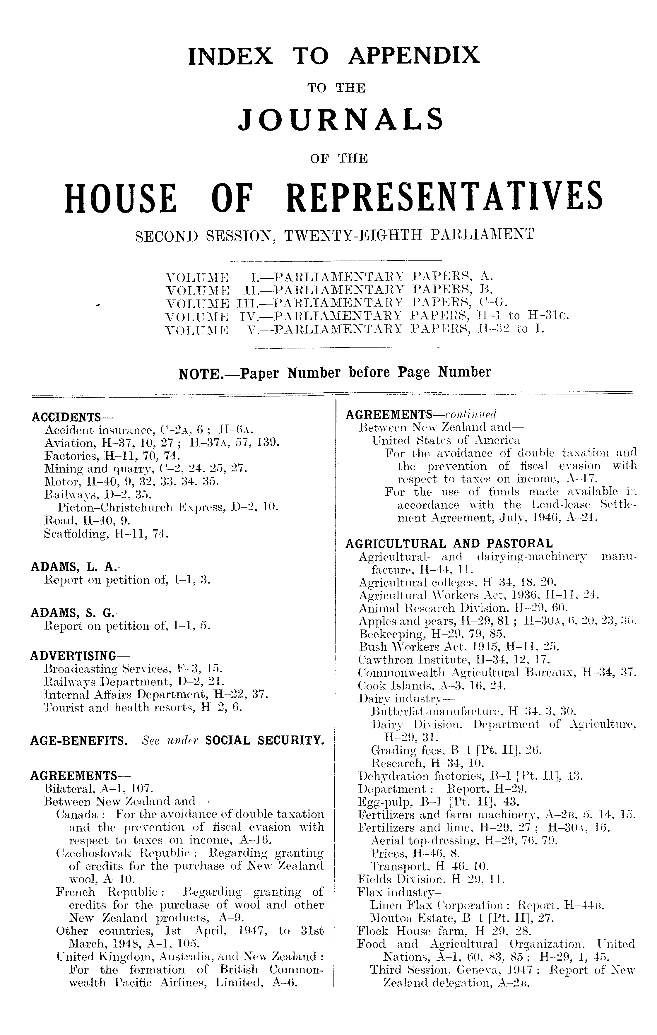 ACCIDENTS— Accident insurance, C-2a, 6 ; H-6a. Aviation, H-37, 10, 27 ; H-37a, 57, 139. Factories, H-11, 70, 74. Mining and quarry, C-2, 24, 25, 27. Motor, 9, 32, 33, 34, 35. Railways, D-2, 35. Picton-Christchurch Express, D-2, 10. Road, H-40, 9. Scaffolding, H-11, 74. ADAMS, L. A.— Report on petition of, I—l, 3. ADAMS, S. G.— Report on petition of, 1-1, 5. ADVERTISING— Broadcasting Services, F-3, 15. Railways Department, D-2, 21. Internal Affairs Department, H-22, 37. Tourist and health resorts, H-2, 6. AGE-BENEFITS. See under SOCIAL SECURITY. AGREEMENTS— Bilateral, A-l, 107. Between New Zealand and — Canada : For the avoidance of double taxation and the prevention of fiscal evasion with respect to taxes on income, A-l 6. Czechoslovak Republic : Regarding granting of credits for the purchase of New Zealand wool, A-10. French Republic: Regarding granting of credits for the purchase of wool and other New Zealand products, A-9. Other countries, Ist April, 1947, to 31st March, 1948, A-l, 105. United Kingdom, Australia, and New Zealand : For the formation of British Commonwealth Pacific Airlines, Limited, A-6.