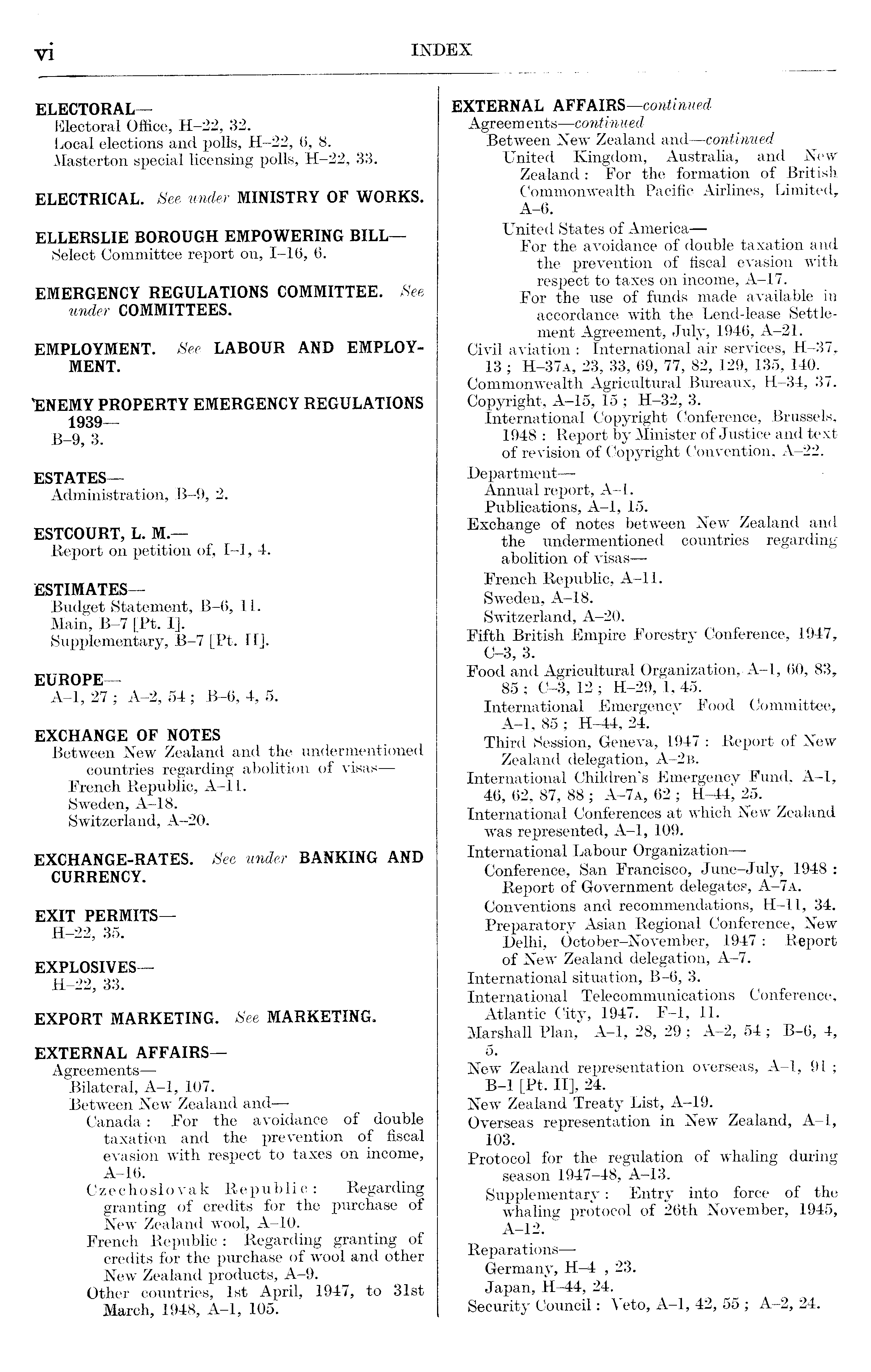 ELECTORAL— Electoral Office, H-22, 32. Local elections and polls, H-22, 6, 8. Masterton special licensing polls, H-22, 33. ELECTRICAL. See under MINISTRY OF WORKS. ELLERSLIE BOROUGH EMPOWERING BILL— Select Committee report on, 1-16, 6. EMERGENCY REGULATIONS COMMITTEE. See under COMMITTEES. EMPLOYMENT. See LABOUR AND EMPLOYMENT. "ENEMY PROPERTY EMERGENCY REGULATIONS 1939 B-9, 3. ESTATES— Administration, B-9, 2. ESTCOURT, L. M.— Report on petition of, 1-1, 4. ESTIMATES— Budget Statement, B-6, 11. Main, B-7£Pt. I]. Supplementary, B-7 [Pt. ll]. EUROPE— A-l, 27 ; A-2, 54 ; B-6, 4, 5. EXCHANGE OF NOTES Between New Zealand and the undermentioned countries regarding abolition of visas—• French Republic, A-11. Sweden, A-18. Switzerland, A-20. EXCHANGE-RATES. See under BANKING AND CURRENCY. EXIT PERMITS— H-22, 35. EXPLOSIVES— H-22, 33. EXPORT MARKETING. See MARKETING. EXTERNAL AFFAIRS— Agreements— Bilateral, A-l, 107. Between New Zealand and — Canada: For the avoidance of double taxation and the prevention of fiscal evasion with respect to taxes on income, A-l 6. Czechoslovak Republic: Regarding granting of credits for the purchase of New Zealand wool, A-10. French Republic : Regarding granting of credits for the purchase of wool and other New Zealand products, A-9. Other countries, Ist April, 1947, to 31st March, 1948, A-l, 105.