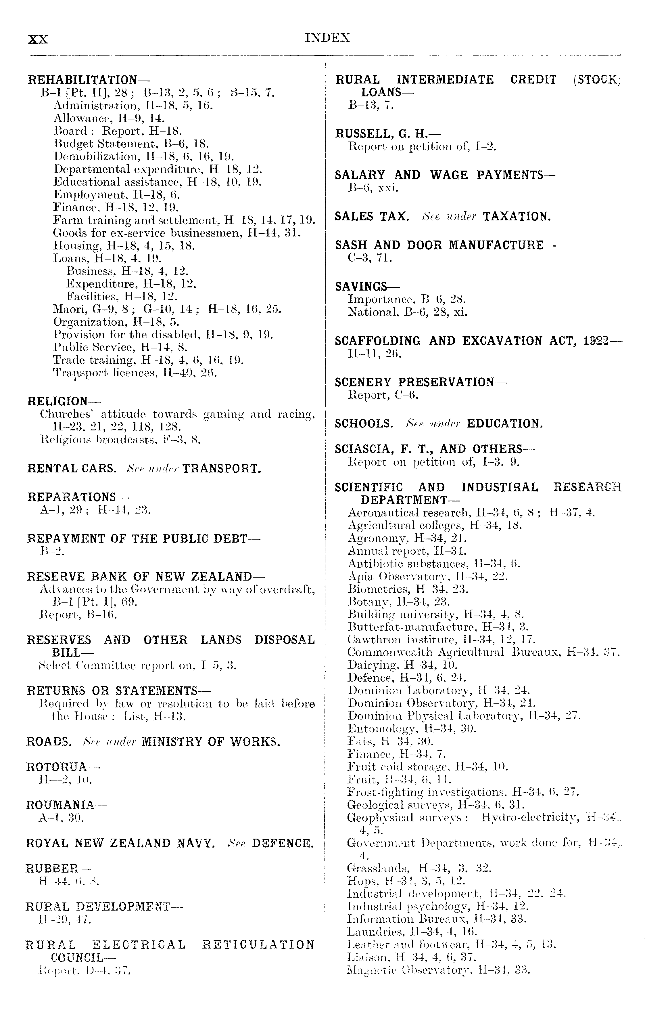 RURAL INTERMEDIATE CREDIT (STOCK) LOANS— B-13, 7. RUSSELL, G. H.— Report on petition of, 1-2. SALARY AND WAGE PAYMENTS— B-6, xxi. SALES TAX. See under TAXATION. SASH AND DOOR MANUFACTURE— C-3, 71. SAVINGS— Importance, B-6, 28. National, B-6, 28, xi. SCAFFOLDING AND EXCAVATION ACT, 1922 H-11, 26. SCENERY PRESERVATION— Report, C-6. SCHOOLS. See under EDUCATION. SCIASCIA, F. T., AND OTHERS— Report on petition of, 1-3, 9. SCIENTIFIC AND INDUSTIRAL RESEARCH. DEPARTMENT— Aeronautical research, H-34, 6, 8 ; H-37, 4. Agricultural colleges, H-34, 18. Agronomy, H-34, 21. Annual report, H-34. Antibiotic substances, H-34, 6. Apia Observatory, H-34, 22. Biometrics, H-34, 23. Botany, H-34, 23. Building university, H-34, 4, 8. Butterfat-manufacture, H-34, 3. Cawthron Institute, H-34, 12, 17. Commonwealth Agricultural Bureaux, H-34, 37. Dairying, H-34, 10. Defence, H-34, 6, 24. Dominion Laboratory, H-34, 24. Dominion Observatory, H-34, 24. Dominion Physical Laboratory, H-34, 27. Entomology, H-34, 30. Fats, H-34, 30. Finance, H-34, 7. Fruit cold storage, H-34, 10. Fruit, H-34, 6, 11. J Frost-fighting investigations, H-34, 6, 27. Geological surveys, H-34, 6, 31. Geophysical surveys : Hydro-electricity, H-34> 4, 5. Government Departments, work done for, H-34,. 4. | Grasslands, H-34, 3, 32. j Hops, H-34, 3, 5, 12. j Industrial development, H-34, 22, 24. I Industrial psychology, H-34, 12. Information Bureaux, H-34, 33. Laundries, H-34, 4, 16. Leather and footwear, H-34, 4, 5, 13. Liaison, H-34, 4, 6, 37. ( Magnetic Observatory, H-34, 33.