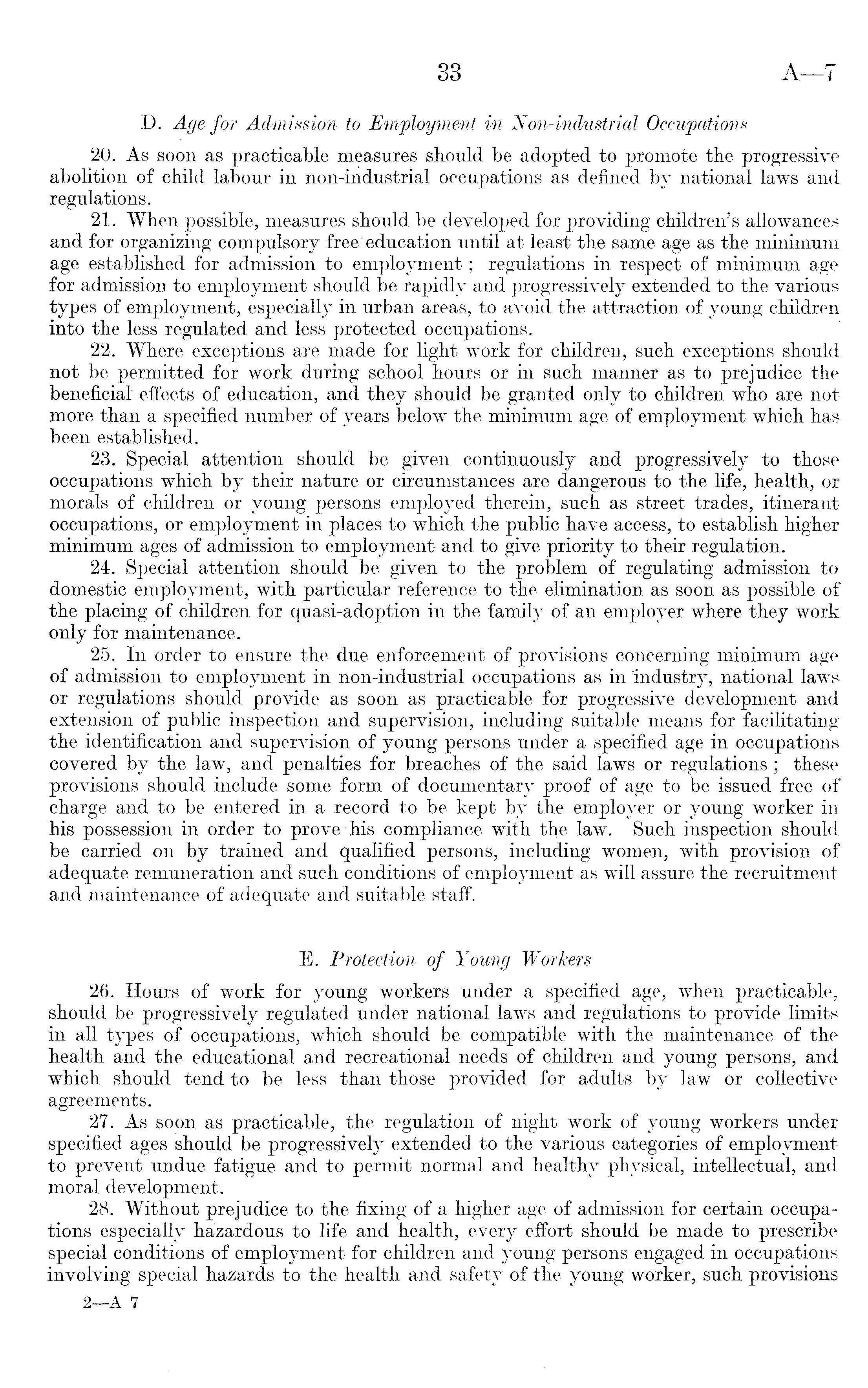 D. Age for Admission to Employment in Non-industrial Occupations 20. As soon as practicable measures should be adopted to promote the progressive abolition of child labour in non-industrial occupations as defined by national laws and regulations. 21. When possible, measures should be developed for providing children's allowances and for organizing compulsory free education until at least the same age as the minimumage established for admission to employment; regulations in respect of minimum age for admission to employment should be rapidly and progressively extended to the various types of employment, especially in urban areas, to avoid the attraction of young children into the less regulated and less protected occupations. 22. Where exceptions are made for light work for children, such exceptions should not be permitted for work during school hours or in such manner as to prejudice the beneficial effects of education, and they should be granted only to children who are not more than a specified number of years below the minimum age of employment which has been established. 23. Special attention should be given continuously and progressively to those occupations which by their nature or circumstances are dangerous to the life, health, or morals of children or young persons employed therein, such as street trades, itinerant occupations, or employment in places to which the public have access, to establish higher minimum ages of admission to employment and to give priority to their regulation. 24. Special attention should be given to the problem of regulating admission to domestic employment, with particular reference to the elimination as soon as possible of the placing of children for quasi-adoption in the family of an employer where they work only for maintenance. 25. In order to ensure the due enforcement of provisions concerning minimum age of admission to employment in non-industrial occupations as in "industry, national laws or regulations should provide as soon as practicable for progressive development and extension of public inspection and supervision, including suitable means for facilitating the identification and supervision of young persons under a specified age in occupations covered by the law, and penalties for breaches of the said laws or regulations; these provisions should include some form of documentary proof of age to be issued free of charge and to be entered in a record to be kept by the employer or young worker in his possession in order to prove his compliance with the law. Such inspection should be carried on by trained and qualified persons, including women, with provision of adequate remuneration and such conditions of employment as will assure the recruitment and maintenance of adequate and suitable staff. E. Protection of Young Workers 26. Hours of work for young workers under a specified age, when practicable, should be progressively regulated under national laws and regulations to provide.limits in all types of occupations, which should be compatible with the maintenance of the health and the educational and recreational needs of children and young persons, and which should tend to be less than those provided for adults by law or collective agreements. 27. As soon as practicable, the regulation of night work of young workers under specified ages should be progressively extended to the various categories of employment to prevent undue fatigue and to permit normal and healthy physical, intellectual, and moral development. 28. Without prejudice to the fixing of a higher age of admission for certain occupations especially hazardous to life and health, every effort should be made to prescribe special conditions of employment for children and young persons engaged in occupations involving special hazards to the health and safety of the young worker, such provisions