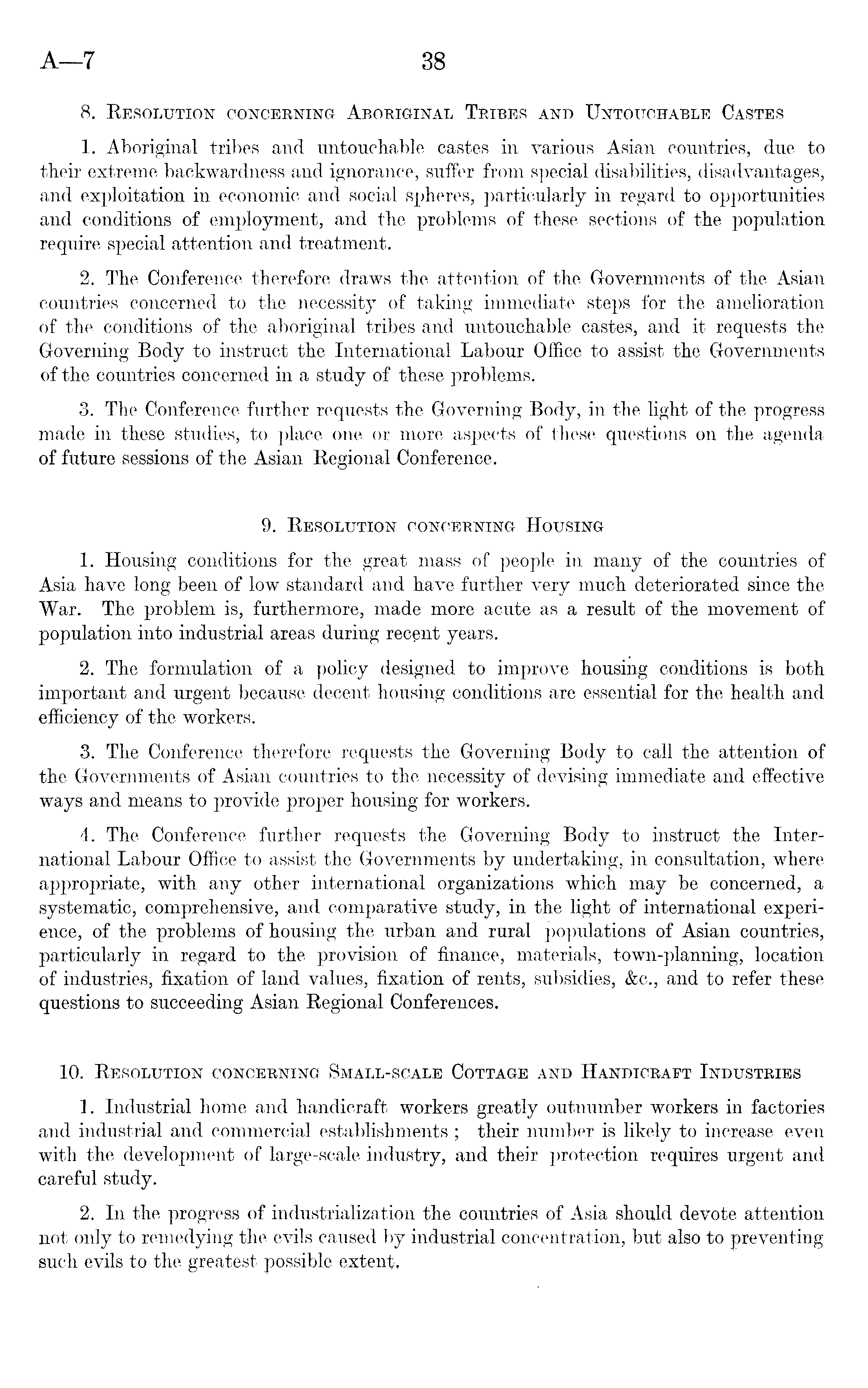 8. Resolution concerning Aboriginal Tribes and Untouchable Castes 1. Aboriginal tribes and untouchable castes in various Asian countries, due to their extreme backwardness and ignorance, suffer from special disabilities, disadvantages, and exploitation in economic and social spheres, particularly in regard to opportunities and conditions of employment, and the problems of these sections of the population require special attention and treatment. 2. The Conference therefore draws the attention of the Governments of the Asian countries concerned to the necessity of taking immediate steps for the amelioration of the conditions of the aboriginal tribes and untouchable castes, and it requests the Governing Body to instruct the International Labour Office to assist the Governments of the countries concerned in a study of these problems. 3. The Conference further requests the Governing Body, in the light of the progress made in these studies, to place one or more aspects of these questions on the agenda of future sessions of the Asian Regional Conference. 9. Resolution concerning Housing 1. Housing conditions for the great mass of people in many of the countries of Asia have long been of low standard and have further very much deteriorated since the War. The problem is, furthermore, made more acute as a result of the movement of population into industrial areas during recent years. 2. The formulation of a policy designed to improve housing conditions is both important and urgent because decent housing conditions are essential for the health and efficiency of the workers. 3. The Conference therefore requests the Governing Body to call the attention of the Governments of Asian countries to the necessity of devising immediate and effective ways and means to provide proper housing for workers. 4. The Conference further requests the Governing Body to instruct the International Labour Office to assist the Governments by undertaking, in consultation, where appropriate, with any other international organizations which may be concerned, a systematic, comprehensive, and comparative study, in the light of international experience, of the problems of housing the urban and rural populations of Asian countries, particularly in regard to the provision of finance, materials, town-planning, location of industries, fixation of land values, fixation of rents, subsidies, &c., and to refer these questions to succeeding Asian Regional Conferences. 10. Resolution concerning Small-scale Cottage and Handicraft Industries 1. Industrial home and handicraft workers greatly outnumber workers in factories and industrial and commercial establishments ; their number is likely to increase even with the development of large-scale industry, and their protection requires urgent and careful study. 2. In the progress of industrialization the countries of Asia should devote attention not only to remedying the evils caused by industrial concentration, but also to preventing such evils to the greatest possible extent,