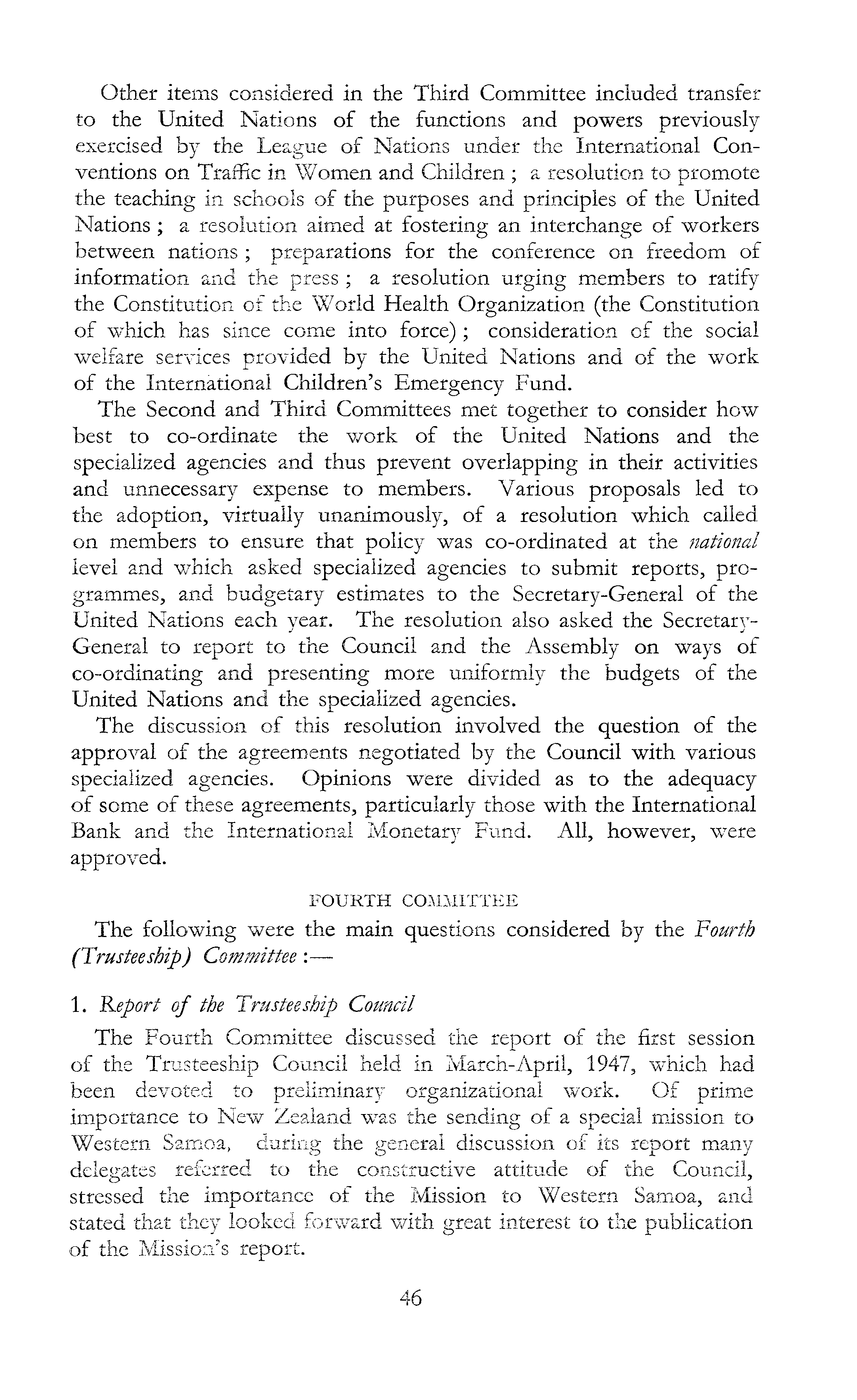Other items considered in the Third Committee included transfer to the United Nations of the functions and powers previously exercised by the League of Nations under the International Conventions on Traffic in Women and Children ; a resolution to promote the teaching in schools of the purposes and principles of the United Nations ; a resolution aimed at fostering an interchange of workers between nations ; preparations for the conference on freedom of information and the press ; a resolution urging members to ratify the Constitution of the World Health Organization (the Constitution of which has since come into force) ; consideration of the social welfare services provided by the United Nations and of the work of the International Children's Emergency Fund. The Second and Third Committees met together to consider how best to co-ordinate the work of the United Nations and the specialized agencies and thus prevent overlapping in their activities and unnecessary expense to members. Various proposals led to the adoption, virtually unanimously, of a resolution which called on members to ensure that policy was co-ordinated at the national level and which asked specialized agencies to submit reports, programmes, and budgetary estimates to the Secretary-General of the United Nations each year. The resolution also asked the SecretaryGeneral to report to the Council and the Assembly on ways of co-ordinating and presenting more uniformly the budgets of the United Nations and the specialized agencies. The discussion of this resolution involved the question of the approval of the agreements negotiated by the Council with various specialized agencies. Opinions were divided as to the adequacy of some of these agreements, particularly those with the International Bank and the International Monetary Fund. All, however, were approved. FOURTH COMMITTEE The following were the main questions considered by the Fourth (Trusteeship) Committee'.— 1. Report of the Trusteeship Council The Fourth Committee discussed the report of the first session of the Trusteeship Council held in March-April, 1947, which had been devoted to preliminary organizational work. Of prime importance to New Zealand was the sending of a special mission to Western Samoa, during the general discussion of its report many delegates referred to the constructive attitude of the Council, stressed the importance of the Mission to Western Samoa, and stated that they looked forward with great interest to the publication of the Mission's report.