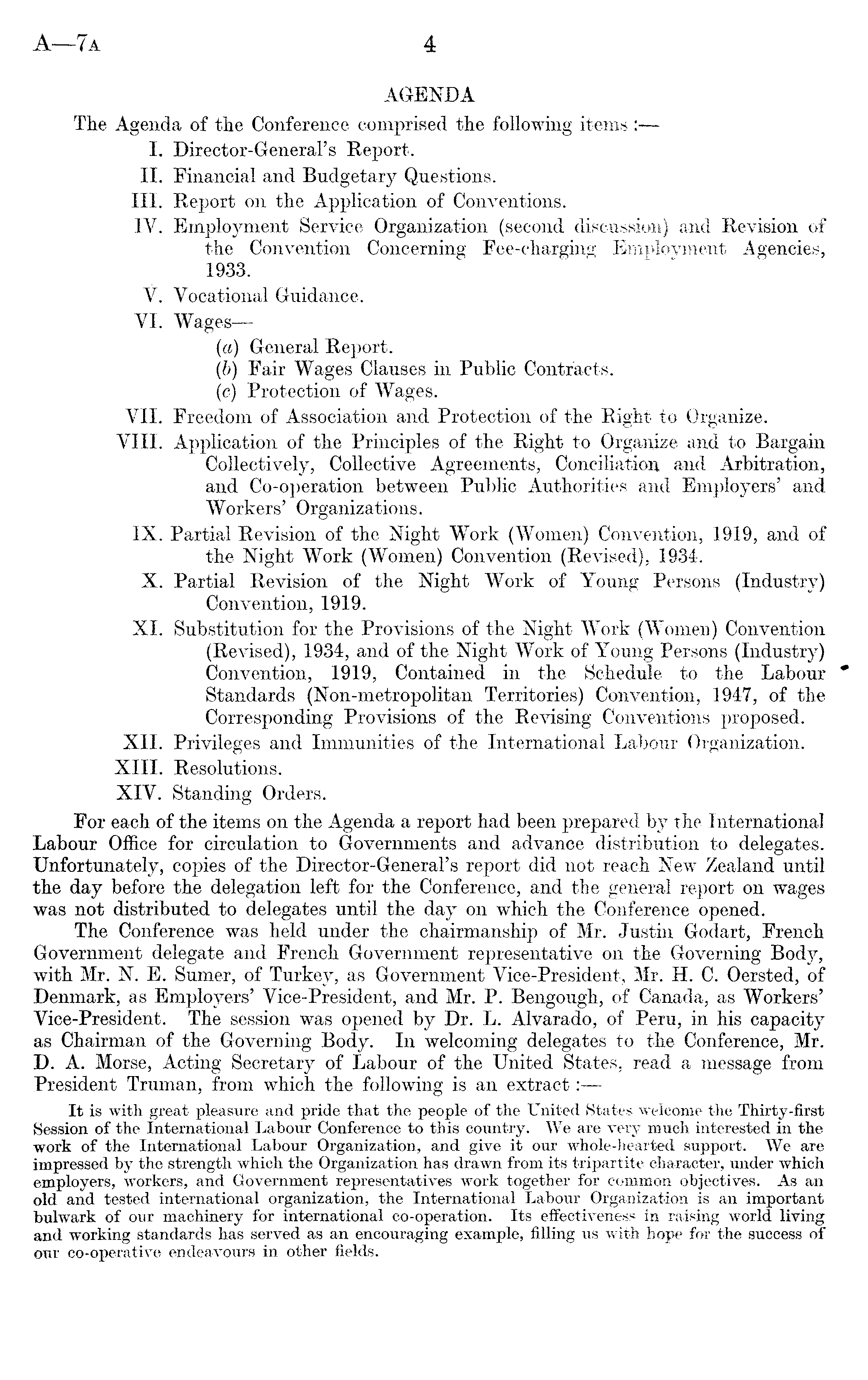 AGENDA The Agenda of the Conference comprised the following items : I. Director-General's Report. 11. Financial and Budgetary Questions. 111. Report on the Application of Conventions. IV. Employment Service Organization (second discussion) and Revision of the Convention Concerning Fee-charging Employment Agencies, 1933. Y. Vocational Guidance. VI. Wages — (a) General Report. (b) Fair Wages Clauses in Public Contracts. (c) Protection of Wages. VII. Freedom of Association and Protection of the Right to Organize. VIII. Application of the Principles of the Right to Organize and to Bargain Collectively, Collective Agreements, Conciliation and Arbitration, and Co-operation between Public Authorities and Employers' and Workers' Organizations. IX. Partial Revision of the Night Work (Women) Convention, 1919, and of the Night Work (Women) Convention (Revised), 1934. X. Partial Revision of the Night Work of Young Persons (Industry) Convention, 1919. XI. Substitution for the Provisions of the Night Work (Women) Convention (Revised), 1934, and of the Night Work of Young Persons (Industry) Convention, 1919, Contained in the Schedule to the Labour Standards (Non-metropolitan Territories) Convention, 1947, of the Corresponding Provisions of the Revising Conventions proposed. XII. Privileges and Immunities of the International Labour Organization. XIII. Resolutions. XIV. Standing Orders. For each of the items on the Agenda a report had been prepared by the International Labour Office for circulation to Governments and advance distribution to delegates. Unfortunately, copies of the Director-General's report did not reach New Zealand until the day before the delegation left for the Conference, and the general report on wages was not distributed to delegates until the day on which the Conference opened. The Conference was held under the chairmanship of Mr. Justin Godart, French Government delegate and French Government representative on the Governing Body, with Mr. N. E. Sumer, of Turkey, as Government Vice-President, Mr. H. C. Oersted, of Denmark, as Employers' Vice-President, and Mr. P. Bengough, of Canada, as Workers' Vice-President. The session was opened by Dr. L. Alvarado, of Peru, in his capacity as Chairman of the Governing Body. In welcoming delegates to the Conference, Mr. D. A. Morse, Acting Secretary of Labour of the United States, read a message from President Truman, from which the following is an extract: — It is with great pleasure and pride that the people of the United States welcome the Thirty-first Session of the International Labour Conference to this country. We are very much interested in the work of the International Labour Organization, and give it our whole-hearted support. We are impressed by the strength which the Organization has drawn from its tripartite character, under which employers, workers, and Government representatives work together for common objectives. As an old and tested international organization, the International Labour Organization is an important bulwark of our machinery for international co-operation. Its effectiveness in raising world living and working standards has served as an encouraging example, filling us with hope for the success of our co-operative endeavours in other fields.