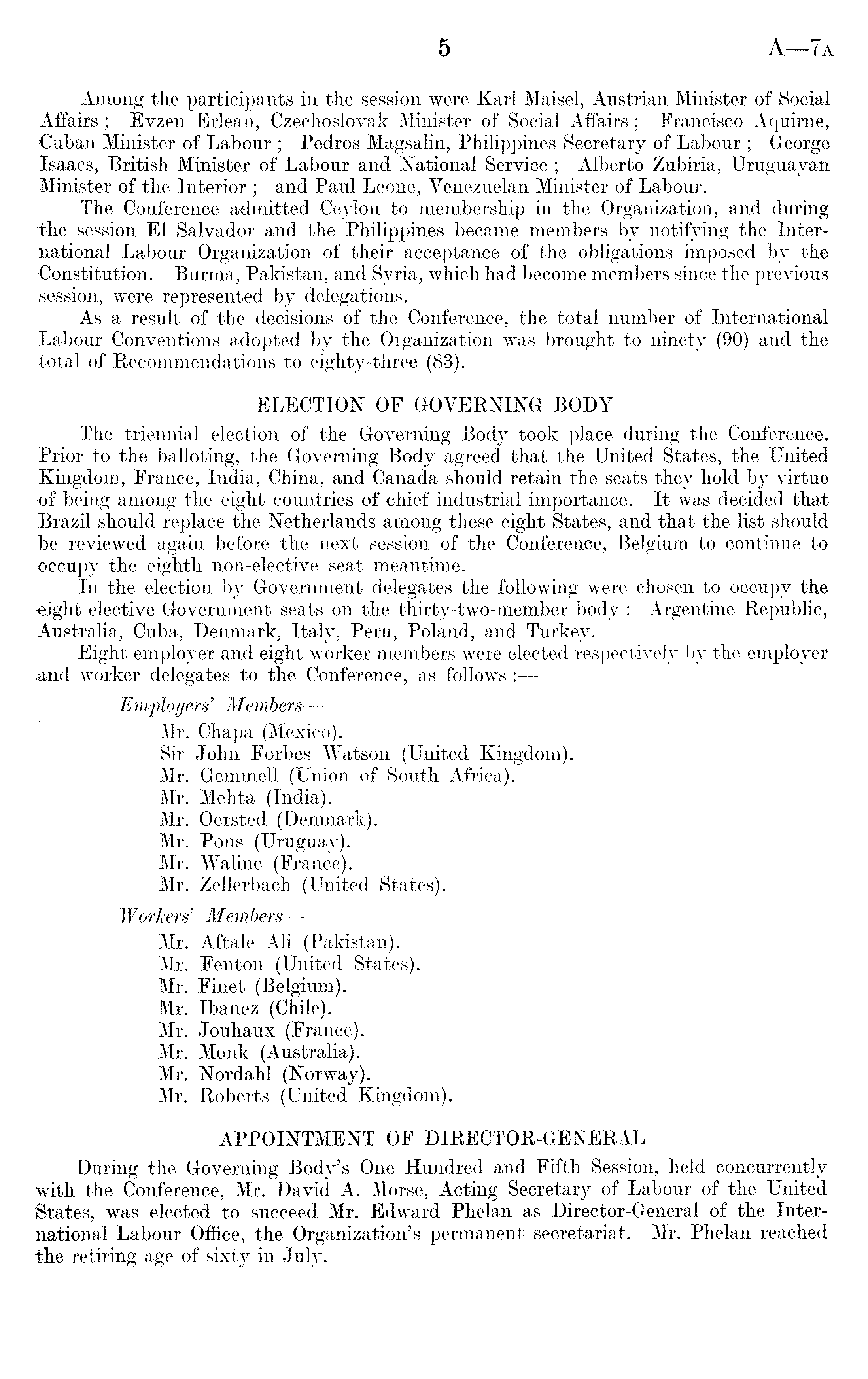 Among the participants in the session were Karl Maisel, Austrian Minister of Social Affairs; Evzen Erlean, Czechoslovak Minister of Social Affairs ; Francisco Aquirne, Ouban Minister of Labour ; Pedros Magsalin, Philippines Secretary of Labour ; George Isaacs, British Minister of Labour and National Service ; Alberto Zubiria, Uruguayan Minister of the Interior ; and Paul Leone, Venezuelan Minister of Labour. The Conference admitted Ceylon to membership in the Organization, and during the session El Salvador and the Philippines became members by notifying the International Labour Organization o'f their acceptance of the obligations imposed by the Constitution. Burma, Pakistan, and Syria, which had become members since the previous session, were represented by delegations. As a result of the decisions of the Conference, the total number of International Labour Conventions adopted by the Organization was brought to ninety (90) and the total of Recommendations to eighty-three (83). ELECTION OF GOVERNING BODY The triennial election of the Governing Body took place during the Conference. Prior to the balloting, the Governing Body agreed that the United States, the United Kingdom, France, India, China, and Canada should retain the seats they hold by virtue of being among the eight countries of chief industrial importance. It was decided that Brazil should replace the Netherlands among these eight States, and that the list should be reviewed again before the next session of the Conference, Belgium to continue to occupy the eighth non-elective seat meantime. In the election by Government delegates the following were chosen to occupy the •eight elective Government seats on the thirty-two-member body : Argentine Republic, Australia, Cuba, Denmark, Italy, Peru, and Turkey. Eight employer and eight worker members were elected respectively by the employer and worker delegates to the Conference, as follows Employers' Members— Mr. Chapa (Mexico). Sir John Forbes Watson (United Kingdom). Mr. Gemmell (Union of South Africa). . Mr. Mehta (India). Mr. Oersted (Denmark). Mr. Pons (Uruguay). Mr. Waline (France). Mr. Zellerbach (United States). Workers' Members — Mr. Aftale Ali (Pakistan). Mr. Fenton (United States). Mr. Finet (Belgium). Mr. Ibanez (Chile). Mr. Jouhaux (France). Mr. Monk (Australia). Mr. Nordahl (Norway). Mr. Roberts (United Kingdom). APPOINTMENT OF DIRECTOR-GENERAL During the Governing Body's One Hundred and Fifth Session, held concurrently with the Conference, Mr. David A. Morse, Acting Secretary of Labour of the United States, was elected to succeed Mr. Edward Phelan as Director-General of the International Labour Office, the Organization's permanent secretariat. Mr. Phelan reached the retiring age of sixty in July.