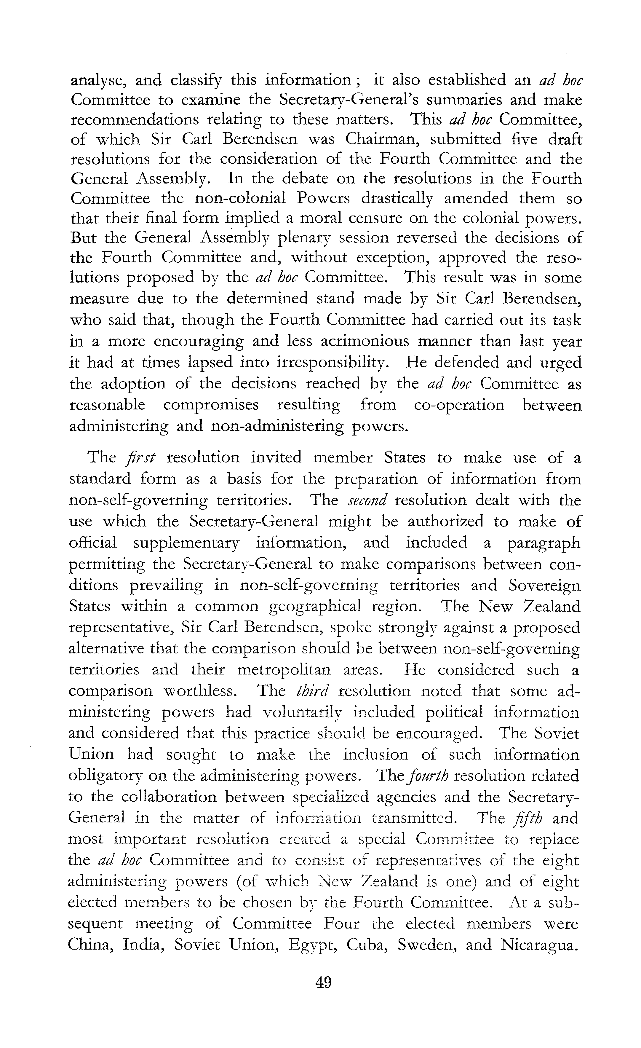 analyse, and classify this information; it also established an ad hoc Committee to examine the Secretary-General's summaries and make recommendations relating to these matters. This ad hoc Committee, of which Sir Carl Berendsen was Chairman, submitted five draft resolutions for the consideration of the Fourth Committee and the General Assembly. In the debate on the resolutions in the Fourth Committee the non-colonial Powers drastically amended them so that their final form implied a moral censure on the colonial powers. But the General Assembly plenary session reversed the decisions of the Fourth Committee and, without exception, approved the resolutions proposed by the ad hoc Committee. This result was in some measure due to the determined stand made by Sir Carl Berendsen, who said that, though the Fourth Committee had carried out its task in a more encouraging and less acrimonious manner than last year it had at times lapsed into irresponsibility. He defended and urged the adoption of the decisions reached by the ad hoc Committee as reasonable compromises resulting from co-operation between administering and non-administering powers. The first resolution invited member States to make use of a standard form as a basis for the preparation of information from non-self-governing territories. The second resolution dealt with the use which the Secretary-General might be authorized to make of official supplementary information, and included a paragraph permitting the Secretary-General to make comparisons between conditions prevailing in non-self-governing territories and Sovereign States within a common geographical region. The New Zealand representative, Sir Carl Berendsen, spoke strongly against a proposed alternative that the comparison should be between non-self-governing territories and their metropolitan areas. He considered such a comparison worthless. The third resolution noted that some administering powers had voluntarily included political information and considered that this practice should be encouraged. The Soviet Union had sought to make the inclusion of such information obligatory on the administering powers. Th & fourth resolution related to the collaboration between specialized agencies and the SecretaryGeneral in the matter of information transmitted. The fifth and most important resolution created a special Committee to replace the ad hoc Committee and to consist of representatives of the eight administering powers (of which New Zealand is one) and of eight elected members to be chosen by the Fourth Committee. At a subsequent meeting of Committee Four the elected members were China, India, Soviet Union, Egypt, Cuba, Sweden, and Nicaragua.