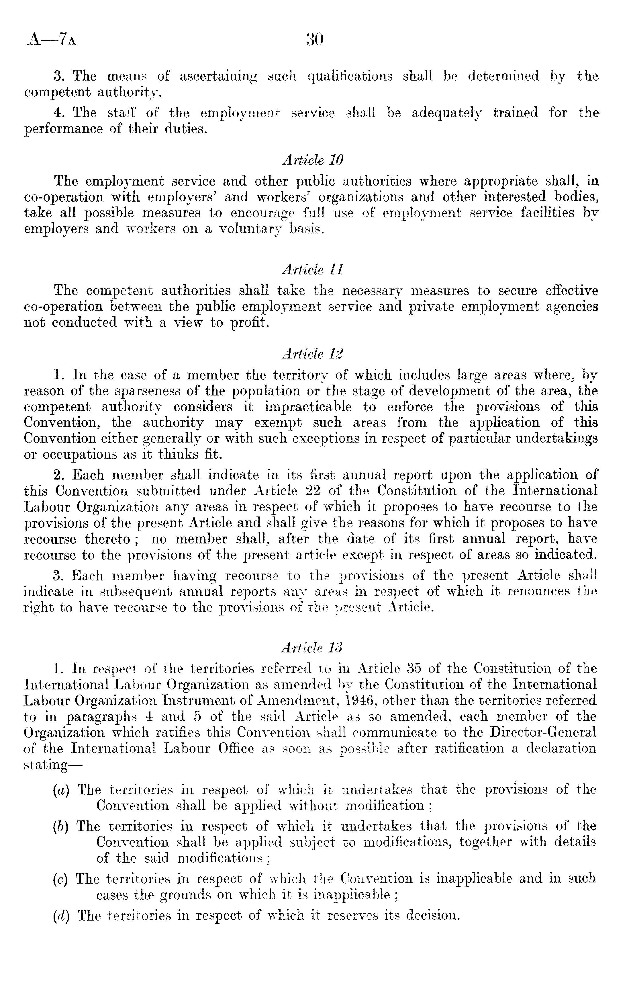 3. The means of ascertaining such qualifications shall be determined by the competent authority. 4. The staff of the employment service shall be adequately trained for the performance of their duties. Article 10 The employment service and other public authorities where appropriate shall, in co-operation with employers' and workers' organizations and other interested bodies, take all possible measures to encourage full use of employment service facilities by employers and workers on a voluntary basis. Article, 11 The competent authorities shall take the necessary measures to secure effective co-operation between the public employment service and private employment agencies not conducted with a view to profit. Article 12 1. In the case of a member the territory of which includes large areas where, by reason of the sparseness of the population or the stage of development of the area, the competent authority considers it impracticable to enforce the provisions of this Convention, the authority may exempt such areas from the application of this Convention either generally or with such exceptions in respect of particular undertakings or occupations as it thinks fit. 2. Each member shall indicate in its first annual report upon the application of this Convention submitted under Article 22 of the Constitution of the International Labour Organization any areas in respect of which it proposes' to have recourse to the provisions of the present Article and shall give the reasons for which it proposes to have recourse thereto ; no member shall, after the date of its first annual report, have recourse to the provisions of the present article except in respect of areas so indicated. 3. Each member having recourse to the provisions of the present Article shall indicate in subsequent annual reports any areas in respect of which it renounces the right to have recourse to the provisions of the present Article. Article 13 1. In respect of the territories referred to in Article 35 of the Constitution of the International Labour Organization as amended by the Constitution of the International Labour Organization Instrument of Amendment, 1946, other than the territories referred to in paragraphs 4 and 5 of the said Article as so amended, each member of the Organization which ratifies this Convention shall communicate to the Director-General of the International Labour Office as soon as possible after ratification a declaration stating—(a) The territories in respect of which it undertakes that the provisions of the Convention shall be applied without modification; (b) The territories in respect of which it undertakes that the provisions of the Convention shall be applied subject to modifications, together with details of the said modifications ; (c) The territories in respect of which the Convention is inapplicable and in such cases the grounds on which it is inapplicable ; (d) The territories in respect of which it reserves its decision.