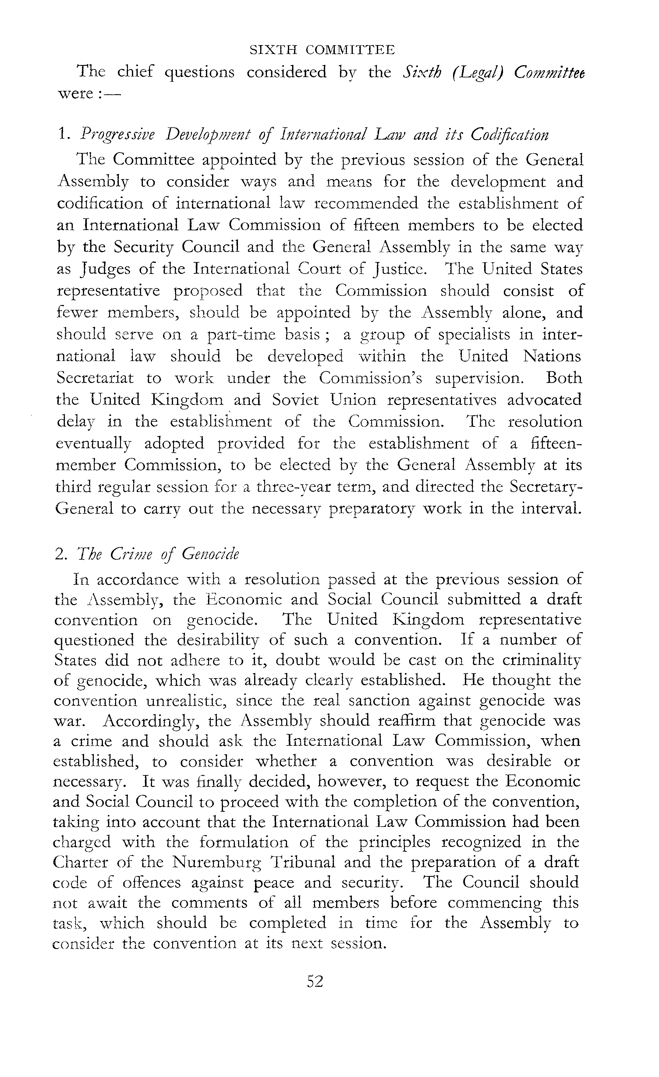 SIXTH COMMITTEE The chief questions considered by the Sixth ("Legal) Committee were : 1. "Progressive Development of International Law and its Codification The Committee appointed by the previous session of the General Assembly to consider ways and means for the development and codification of international law recommended the establishment of an International Law Commission of fifteen members to be elected by the Security Council and the General Assembly in the same way as Judges of the International Court of Justice. The United States representative proposed that the Commission should consist of fewer members, should be appointed by the Assembly alone, and should serve on a part-time basis ; a group of specialists in international law should be developed within the United Nations Secretariat to work under the Commission's supervision. Both the United Kingdom and Soviet Union representatives advocated delay in the establishment of the Commission. The resolution eventually adopted provided for the establishment of a fifteenmember Commission, to be elected by the General Assembly at its third regular session for a three-year term, and directed the SecretaryGeneral to carry out the necessary preparatory work in the interval. 2. The Crime of Genocide In accordance with a resolution passed at the previous session of the Assembly, the Economic and Social Council submitted a draft convention on genocide. The United Kingdom representative questioned the desirability of such a convention. If a number of States did not adhere to it, doubt would be cast on the criminality of genocide, which was already clearly established. He thought the convention unrealistic, since the real sanction against genocide was war. Accordingly, the Assembly should reaffirm that genocide was a crime and should ask the International Law Commission, when established, to consider whether a convention was desirable or necessary. It was finally decided, however, to request the Economic and Social Council to proceed with the completion of the convention, taking into account that the International Law Commission had been charged with the formulation of the principles recognized in the Charter of the Nuremburg Tribunal and the preparation of a draft code of offences against peace and security. The Council should not await the comments of all members before commencing this task, which should be completed in time for the Assembly to consider the convention at its next session.