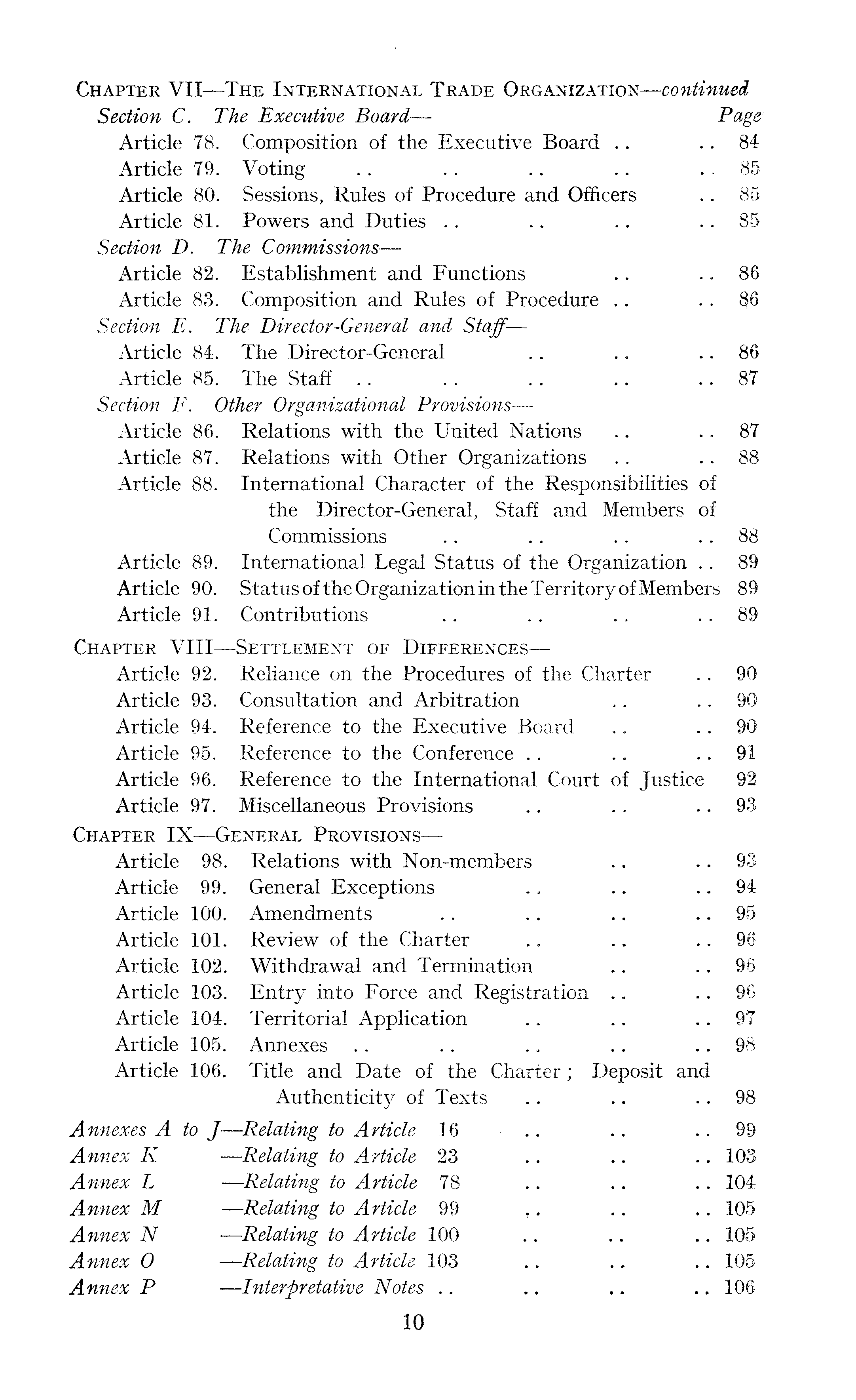 Chapter VII —The International Trade Organization—continued, Section C. The Executive Board — Page Article 78. Composition of the Executive Board .. .. 84 Article 79. Voting .. .. .. .. .. 85 Article 80. Sessions, Rules of Procedure and Officers .. 85 Article 81. Powers and Duties .. .. .. .. 85 Section D. The Commissions— Article 82. Establishment and Functions .. .. 86 Article 83. Composition and Rules of Procedure .. .. §6 Section E. The Director-General and Staff — Article 84. The Director-General .. .. .. 86 Article 85. The Staff .. .. .. .. 87 Section F. Other Organizational Provisions — Article 86. Relations with the United Nations .. .. 87 Article 87. Relations with Other Organizations .. .. 88 Article 88. International Character of the Responsibilities of the Director-General, Staff and Members of Commissions .. .. .. .. 88 Article 89. International Legal Status of the Organization .. 89 Article 90. Status of the Organization in the Territory of Members 89 Article 91. Contributions .. .. .. .. 89 Chapter VIII —Settlement of Differences — Article 92. Reliance on the Procedures of the Charter .. 90 Article 93. Consultation and Arbitration .. 90 Article 94. Reference to the Executive Board .. .. 90 Article 95. Reference to the Conference .. .. .. 91 Article 96. Reference to the International Court of Justice 92 Article 97. Miscellaneous Provisions .. .. .. 93 Chapter IX —General Provisions — Article 98. Relations with Non-members .. 93 Article 99. General Exceptions .. .. 94 Article 100. Amendments .. .. .. .. 95 Article 101. Review of the Charter .. .. .. 96 Article 102. Withdrawal and Termination .. .. 96 Article 103. Entry into Force and Registration .. .. 96 Article 104. Territorial Application .. .. .. 97 Article 105. Annexes .. .. .. .. .. 98 Article 106. Title and Date of the Charter; Deposit and Authenticity of Texts .. .. .. 98 Annexes A to J —Relating to Article 16 .. .. 99 Annex K —Relating to Article 23 .. .. .. 103 Annex L —Relating to Article 78 .. .. .. 104 Annex M —Relating to Article 99 .. .. .. 105 Annex N —Relating to Article 100 .. .. .. 105 Annex O —Relating to Article 103 .. .. .. 105 Annex P —lnterpretative Notes .. .. .. .. 106