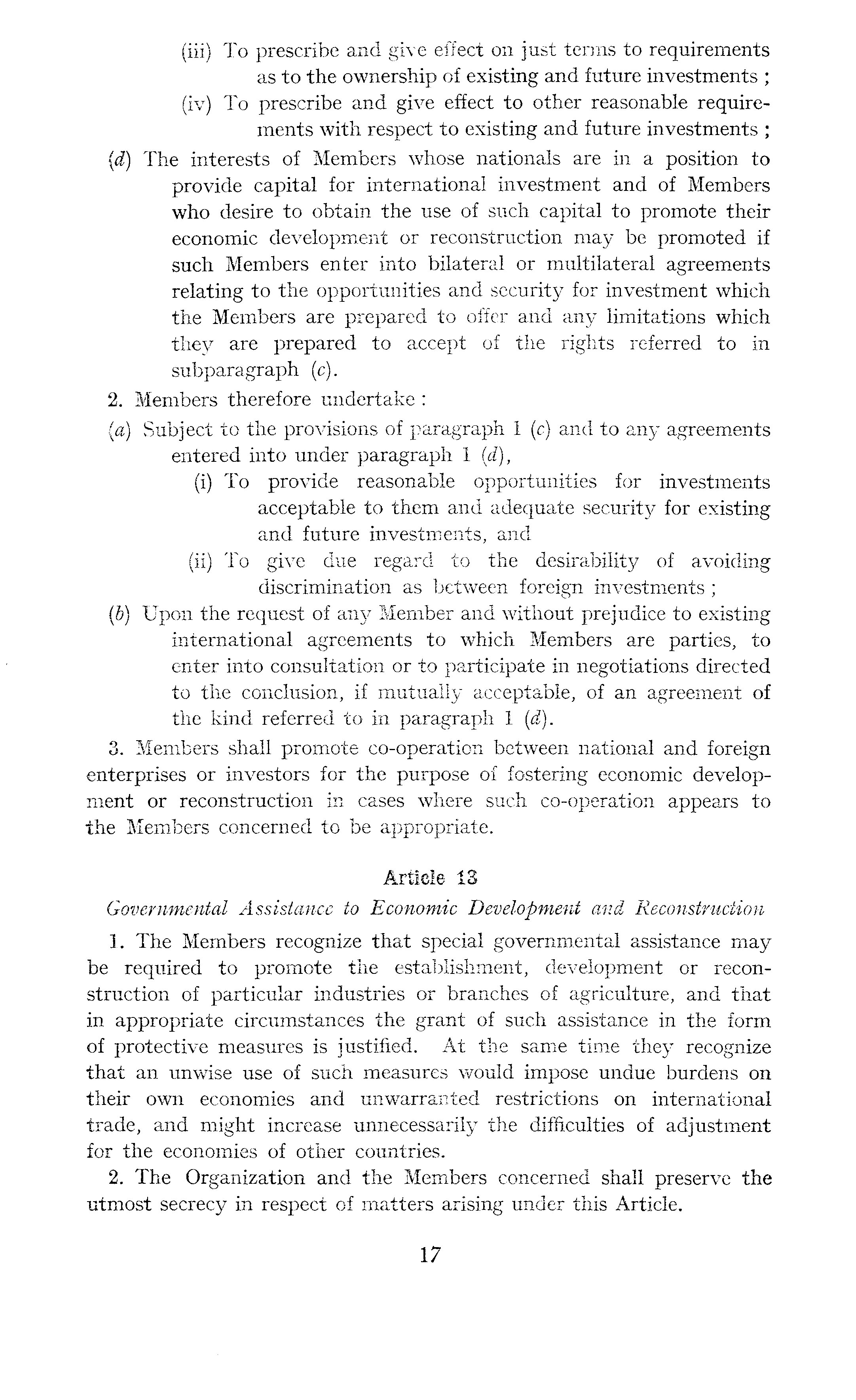 (iii) To prescribe and give effect on just terms to requirements as to the ownership of existing and future investments ; (iv) To prescribe and give effect to other reasonable requirements with respect to existing and future investments ; (d) The interests of Members whose nationals are in a position to provide capital for international investment and of Members who desire to obtain the use of such capital to promote their economic development or reconstruction may be promoted if such Members enter into bilateral or multilateral agreements relating to the opportunities and security for investment which the Members are prepared to offer and any limitations which they are prepared to accept of the rights referred to in subparagraph (c). 2. Members therefore undertake : (а) Subject to the provisions of paragraph 1 (c) and to any agreements entered into under paragraph 1 (d), (i) To provide reasonable opportunities for investments acceptable to them and adequate security for existing and future investments, and (ii) To give due regard to the desirability of avoiding discrimination as between foreign investments ; (б) Upon the request of any Member and without prejudice to existing international agreements to which Members are parties, to enter into consultation or to participate in negotiations directed to the conclusion, if mutually acceptable, of an agreement of the kind referred to in paragraph 1 (d). 3. Members shall promote co-operation between national and foreign enterprises or investors for the purpose of fostering economic development or reconstruction in cases where such co-operation appears to the Members concerned to be appropriate. Article 13 Governmental Assistance to Economic Development and Reconstruction 1. The Members recognize that special governmental assistance may be required to promote the establishment, development or reconstruction of particular industries or branches of agriculture, and that in appropriate circumstances the grant of such assistance in the form of protective measures is justified. At the same time they recognize that an unwise use of such measures would impose undue burdens on their own economies and unwarranted restrictions on international trade, and might increase unnecessarily the difficulties of adjustment for the economies of other countries. 2. The Organization and the Members concerned shall preserve the utmost secrecy in respect of matters arising under this Article.