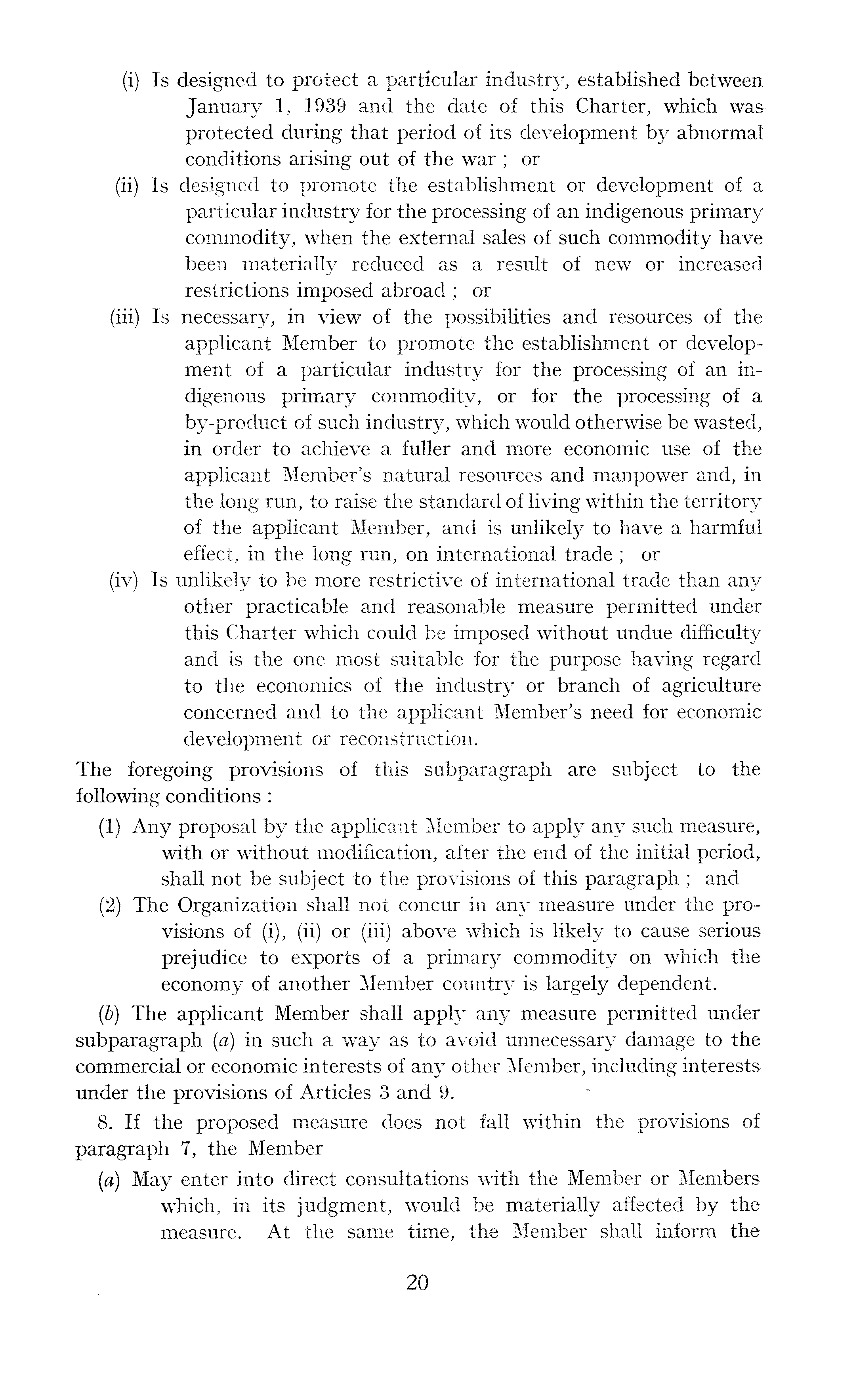 (i) Is designed to protect a particular industry, established between January 1, 1939 and the date of this Charter, which was protected during that period of its development by abnormal conditions arising out of the war ; or (ii) Is designed to promote the establishment or development of a particular industry for the processing of an indigenous primary commodity, when the external sales of such commodity have been materially reduced as a result of new or increased restrictions imposed abroad ; or (iii) Is necessary, in view of the possibilities and resources of the applicant Member to promote the establishment or development of a particular industry for the processing of an indigenous primary commodity, or for the processing of a by-product of such industry, which would otherwise be wasted, in order to achieve a fuller and more economic use of the applicant Member's natural resources and manpower and, in the long run, to raise the standard of living within the territory of the applicant Member, and is unlikely to have a harmful effect, in the long run, on international trade ; or (iv) Is unlikely to be more restrictive of international trade than any other practicable and reasonable measure permitted under this Charter which could be imposed without undue difficulty and is the one most suitable for the purpose having regard to the economics of the industry or branch of agriculture concerned and to the applicant Member's need for economic development or reconstruction. The foregoing provisions of this subparagraph are subject to the following conditions : (1) Any proposal by the applicant Member to apply any such measure, with or without modification, after the end of the initial period, shall not be subject to the provisions of this paragraph ; and (2) The Organization shall not concur in any measure under the provisions of (i), (ii) or (iii) above which is likely to cause serious prejudice to exports of a primary commodity on which the economy of another Member country is largely dependent. (b) The applicant Member shall apply any measure permitted under subparagraph (a) in such a way as to avoid unnecessary damage to the commercial or economic interests of any other Member, including interests under the provisions of Articles 3 and 9. 8. If the proposed measure does not fall within the provisions of paragraph 7, the Member (a) May enter into direct consultations with the Member or Members which, in its judgment, would be materially affected by the measure. At the same time, the Member shall inform the