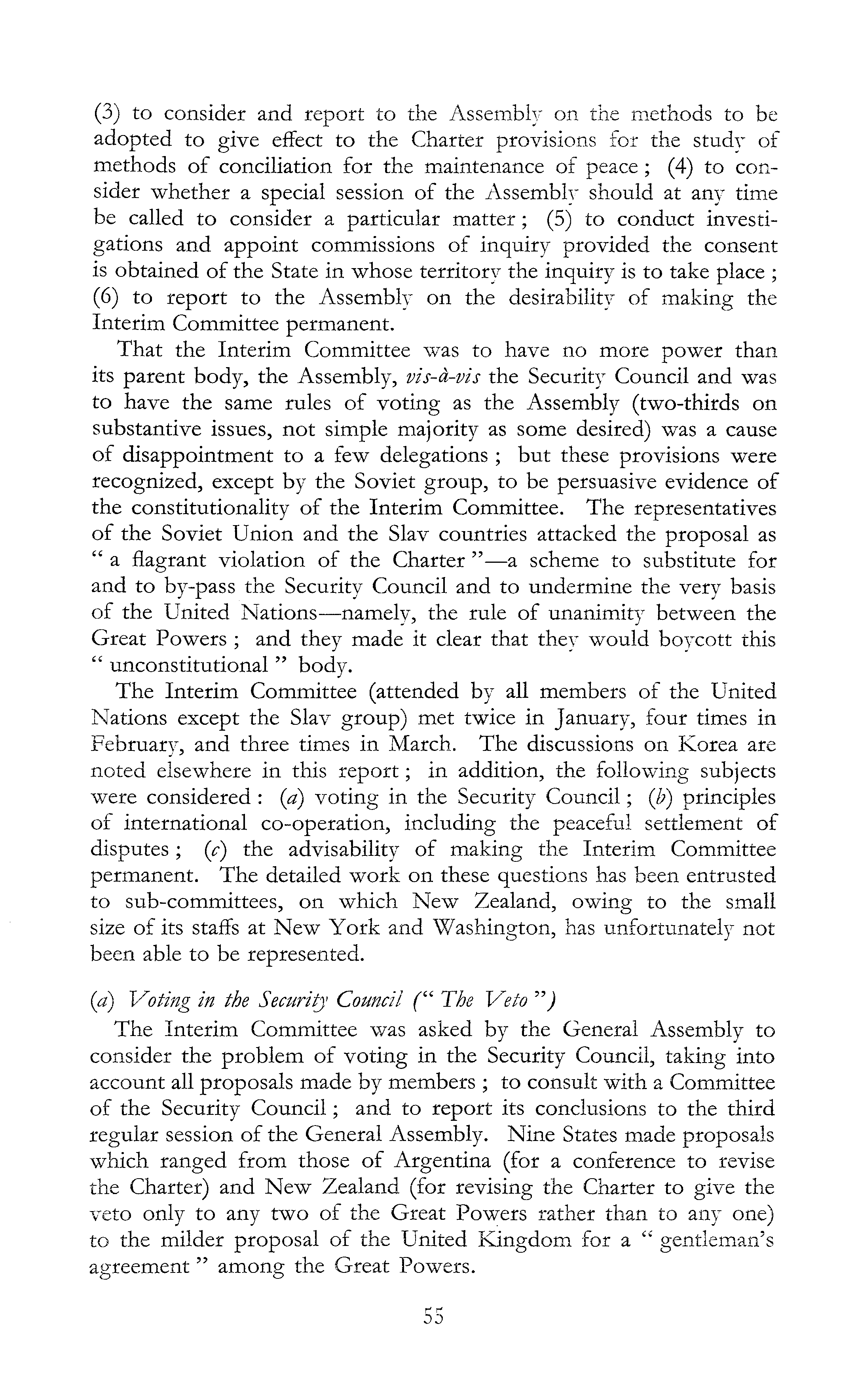 (3) to consider and report to the Assembly on the methods to be adopted to give effect to the Charter provisions for the study of methods of conciliation for the maintenance of peace; (4) to consider whether a special session of the Assembly should at any time be called to consider a particular matter; (5) to conduct investigations and appoint commissions of inquiry provided the consent is obtained of the State in whose territory the inquiry is to take place ; (6) to report to the Assembly on the desirability of making the Interim Committee permanent. That the Interim Committee was to have no more power than its parent body, the Assembly, vis-a-vis the Security Council and was to have the same rules of voting as the Assembly (two-thirds on substantive issues, not simple majority as some desired) was a cause of disappointment to a few delegations ; but these provisions were recognized, except by the Soviet group, to be persuasive evidence of the constitutionality of the Interim Committee. The representatives of the Soviet Union and the Slav countries attacked the proposal as " a flagrant violation of the Charter " —a scheme to substitute for and to by-pass the Security Council and to undermine the very basis of the United Nations—namely, the rule of unanimity between the Great Powers ; and they made it clear that they would boycott this " unconstitutional " body. The Interim Committee (attended by all members of the United Nations except the Slav group) met twice in January, four times in February, and three times in March. The discussions on Korea are noted elsewhere in this report; in addition, the following subjects were considered : {a) voting in the Security Council; (b) principles of international co-operation, including the peaceful settlement of disputes; (c) the advisability of making the Interim Committee permanent. The detailed work on these questions has been entrusted to sub-committees, on which New Zealand, owing to the small size of its staffs at New York and Washington, has unfortunately not been able to be represented. (a) Voting in the Security Council (" The Veto ") The Interim Committee was asked by the General Assembly to consider the problem of voting in the Security Council, taking into account all proposals made by members ; to consult with a Committee of the Security Council; and to report its conclusions to the third regular session of the General Assembly. Nine States made proposals which ranged from those of Argentina (for a conference to revise the Charter) and New Zealand (for revising the Charter to give the veto only to any two of the Great Powers rather than to any one) to the milder proposal of the United Kingdom for a " gentleman's agreement" among the Great Powers.