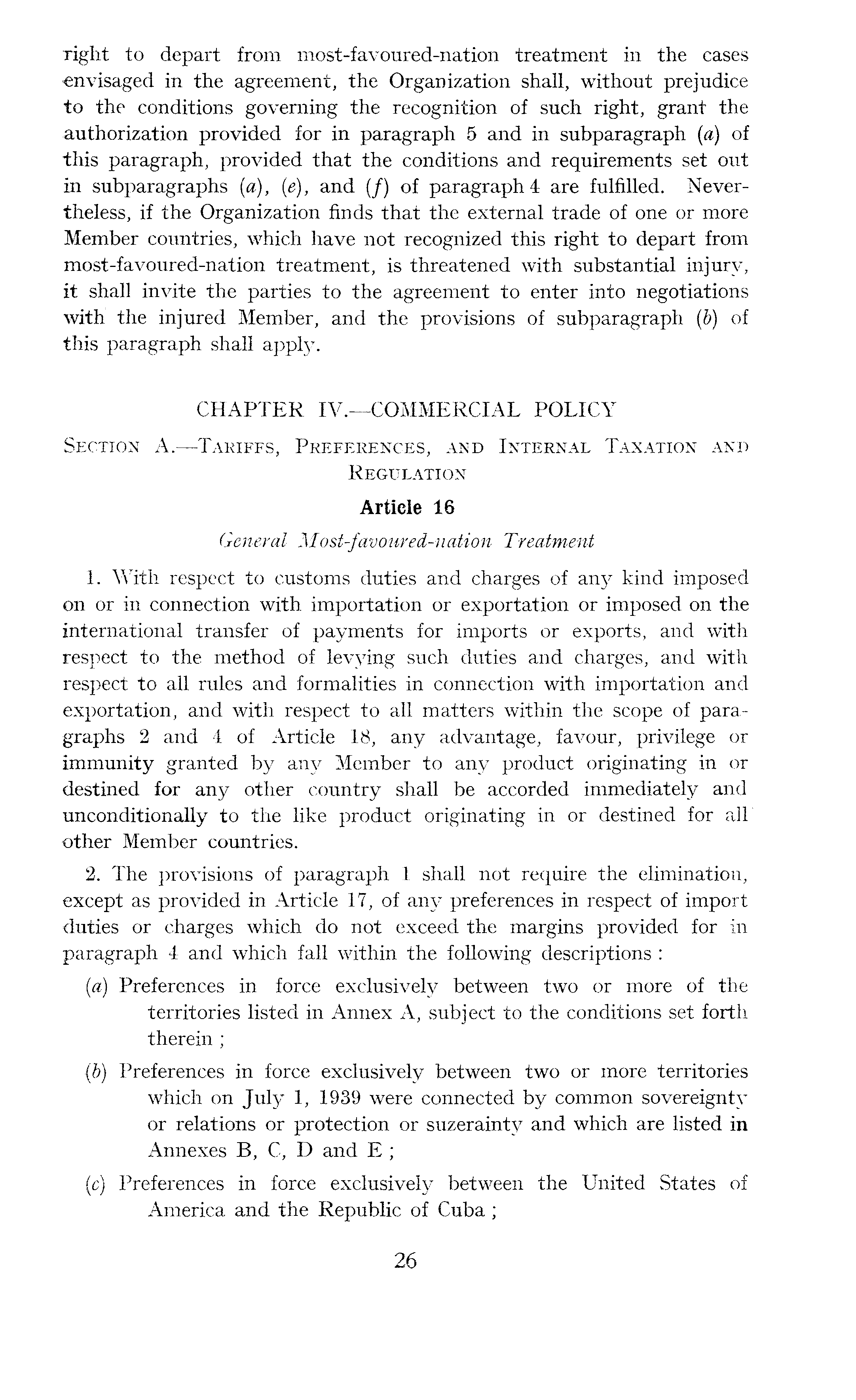right to depart from most-favoured-nation treatment in the cases •envisaged in the agreement, the Organization shall, without prejudice to the conditions governing the recognition of such right, grant the authorization provided for in paragraph 5 and in subparagraph (a) of this paragraph, provided that the conditions and requirements set out in subparagraphs (a), (e), and (/) of paragraph 4 are fulfilled. Nevertheless, if the Organization finds that the external trade of one or more Member countries, which have not recognized this right to depart from most-favoured-nation treatment, is threatened with substantial injury, it shall invite the parties to the agreement to enter into negotiations with the injured Member, and the provisions of subparagraph (b) of this paragraph shall apply. CHAPTER IV.—COMMERCIAL POLICY Section A. —Tariffs, Preferences, and Internal Taxation and Regulation Article 16 General Most-favoured-nation Treatment 1. With respect to customs duties and charges of any kind imposed on or in connection with importation or exportation or imposed on the international transfer of payments for imports or exports, and with respect to the method of levying such duties and charges, and with respect to all rules and formalities in connection with importation and exportation, and with respect to all matters within the scope of paragraphs 2 and 4 of Article 18, any advantage, favour, privilege or immunity granted by any Member to any product originating in or destined for any other country shall be accorded immediately and unconditionally to the like product originating in or destined for all other Member countries. 2. The provisions of paragraph 1 shall not require the elimination, except as provided in Article 17, of any preferences in respect of import duties or charges which do not exceed the margins provided for in paragraph 4 and which fall within the following descriptions : (a) Preferences in force exclusively between two or more of the territories listed in Annex A, subject to the conditions set forth therein ; (b) Preferences in force exclusively between two or more territories which on July 1, 1939 were connected by common sovereignty or relations or protection or suzerainty and which are listed in Annexes B, C, D and E ; (c) Preferences in force exclusively between the United States of America and the Republic of Cuba ;