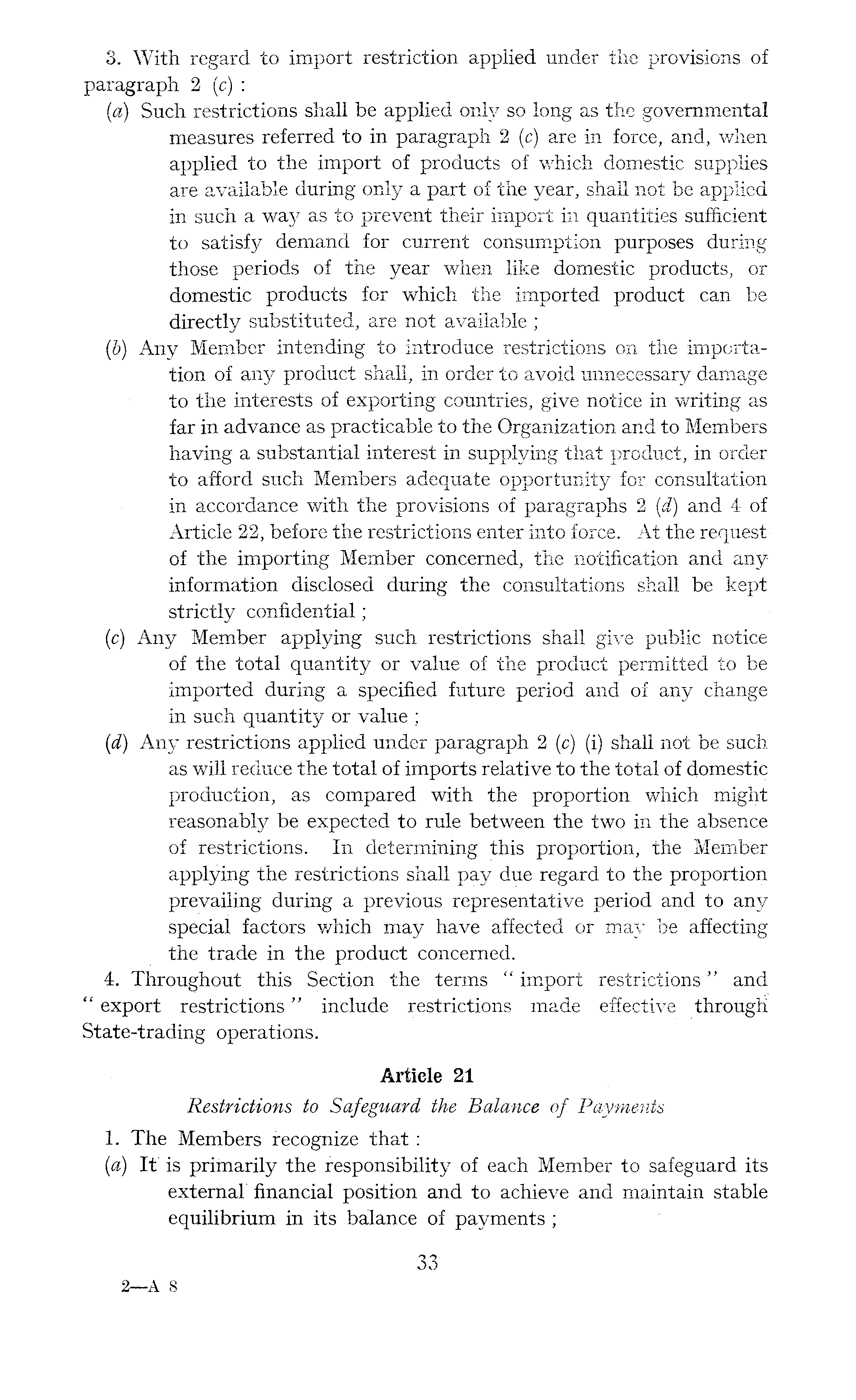 3. With regard to import restriction applied under the provisions of paragraph 2 (c) : {a) Such restrictions shall be applied only so long as the governmental measures referred to in paragraph 2 (c) are in force, and, when applied to the import of products of which domestic supplies are available during only a part of the year, shall not be applied in such a way as to prevent their import in quantities sufficient to satisfy demand for current consumption purposes during those periods of the year when like domestic products, or domestic products for which the imported product can be directly substituted, are not available ; (b) Any Member intending to introduce restrictions on the importation of any product shall, in order to avoid unnecessary damage to the interests of exporting countries, give notice in writing as far in advance as practicable to the Organization and to Members having a substantial interest in supplying that product, in order to afford such Members adequate opportunity for consultation in accordance with the provisions of paragraphs 2 (d) and 4 of Article 22, before the restrictions enter into force. At the request of the importing Member concerned, the notification and any information disclosed during the consultations shall be kept strictly confidential; (c) Any Member applying such restrictions shall give public notice of the total quantity or value of the product permitted to be imported during a specified future period and of any change in such quantity or value ; (d) Any restrictions applied under paragraph 2 (c) (i) shall not be such as will reduce the total of imports relative to the total of domestic production, as compared with the proportion which might reasonably be expected to rule between the two in the absence of restrictions. In determining this proportion, the Member applying the restrictions shall pay due regard to the proportion prevailing during a previous representative period and to any special factors which may have affected or may be affecting the trade in the product concerned. 4. Throughout this Section the terms " import restrictions" and " export restrictions" include restrictions made effective through State-trading operations. Article 21 Restrictions to Safeguard the Balance of Payments 1. The Members recognize that: (a) It is primarily the responsibility of each Member to safeguard its external financial position and to achieve and maintain stable equilibrium in its balance of payments ;