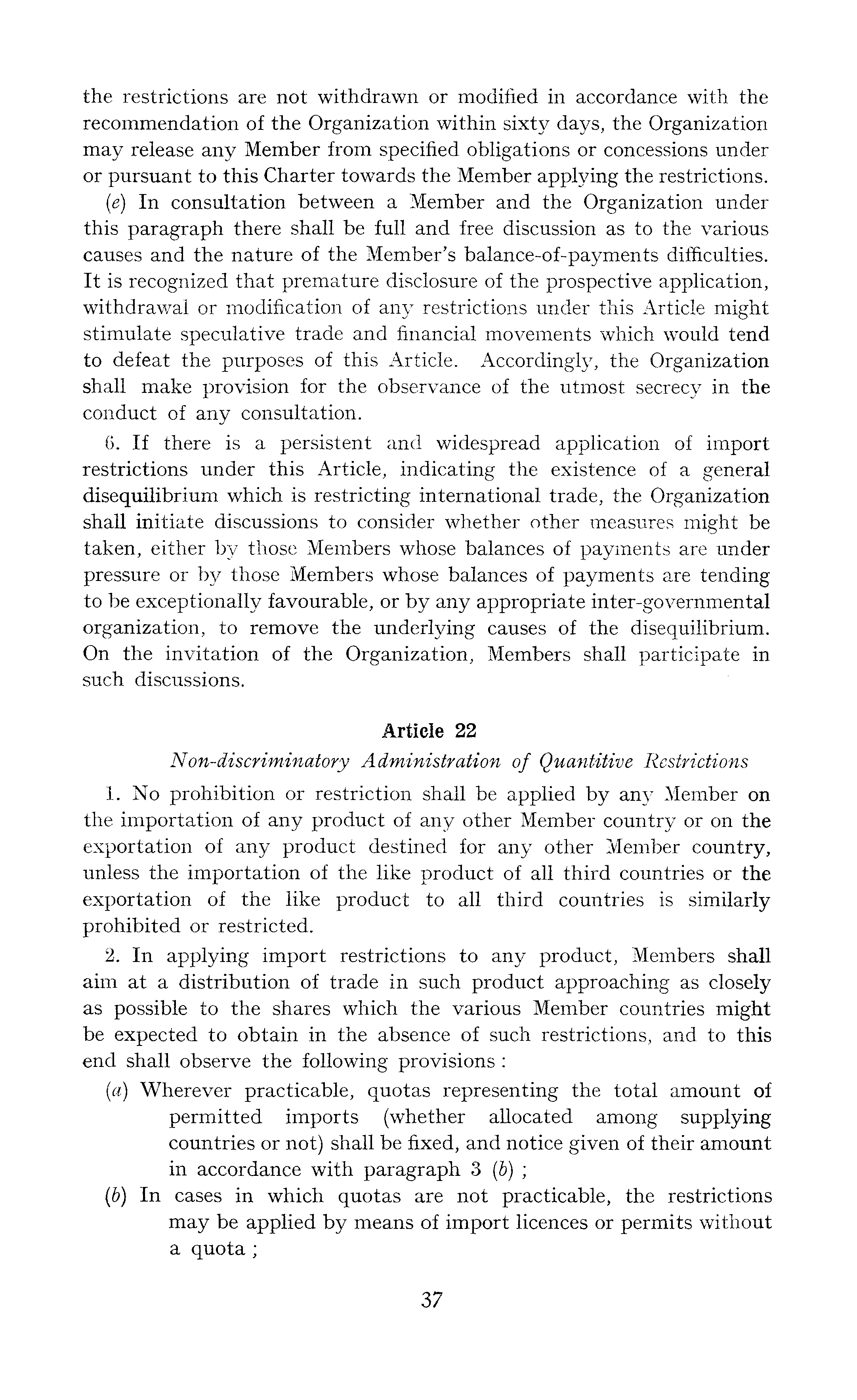 the restrictions are not withdrawn or modified in accordance with the recommendation of the Organization within sixty days, the Organization may release any Member from specified obligations or concessions under or pursuant to this Charter towards the Member applying the restrictions. {e) In consultation between a Member and the Organization under this paragraph there shall be full and free discussion as to the various causes and the nature of the Member's balance-of-payments difficulties. It is recognized that premature disclosure of the prospective application, withdrawal or modification of any restrictions under this Article might stimulate speculative trade and financial movements which would tend to defeat the purposes of this Article. Accordingly, the Organization shall make provision for the observance of the utmost secrecy in the conduct of any consultation. 6. If there is a persistent and widespread application of import restrictions under this Article, indicating the existence of a general disequilibrium which is restricting international trade, the Organization shall initiate discussions to consider whether other measures might be taken, either by those Members whose balances of payments are under pressure or by those Members whose balances of payments are tending to be exceptionally favourable, or by any appropriate inter-governmental organization, to remove the underlying causes of the disequilibrium. On the invitation of the Organization, Members shall participate in such discussions. Article 22 Non-discriminatory Administration of Quantitive Restrictions 1. No prohibition or restriction shall be applied by any Member on the importation of any product of any other Member country or on the exportation of any product destined for any other Member country, unless the importation of the like product of all third countries or the exportation of the like product to all third countries is similarly prohibited or restricted. 2. In applying import restrictions to any product, Members shall aim at a distribution of trade in such product approaching as closely as possible to the shares which the various Member countries might be expected to obtain in the absence of such restrictions, and to this end shall observe the following provisions : (a) Wherever practicable, quotas representing the total amount of permitted imports (whether allocated among supplying countries or not) shall be fixed, and notice given of their amount in accordance with paragraph 3 (b) ; (b) In cases in which quotas are not practicable, the restrictions may be applied by means of import licences or permits without a quota;