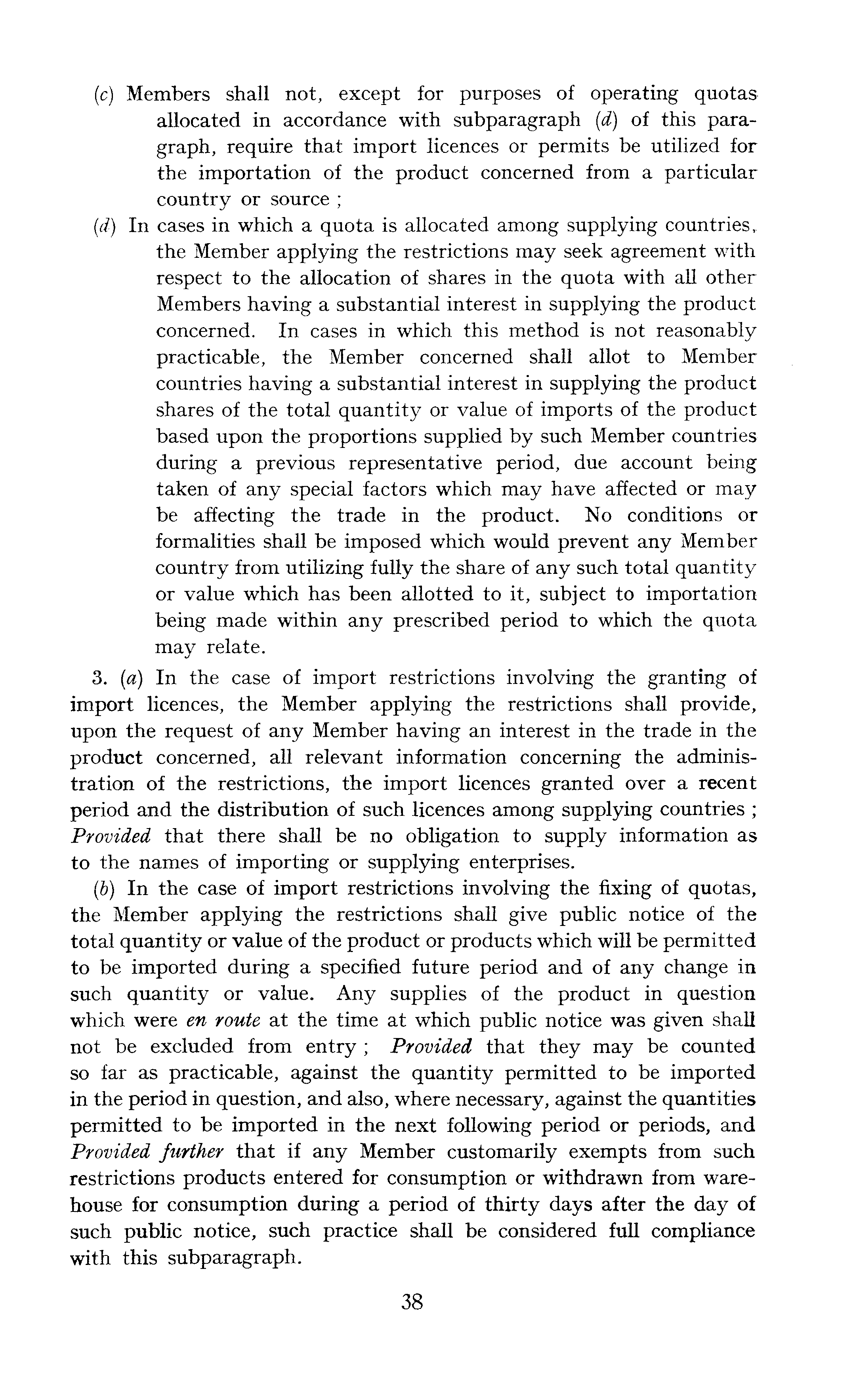 (c) Members shall not, except for purposes of operating quotas allocated in accordance with subparagraph {d) of this paragraph, require that import licences or permits be utilized for the importation of the product concerned from a particular country or source ; (d) In cases in which a quota is allocated among supplying countries, the Member applying the restrictions may seek agreement with respect to the allocation of shares in the quota with all other Members having a substantial interest in supplying the product concerned. In cases in which this method is not reasonably practicable, the Member concerned shall allot to Member countries having a substantial interest in supplying the product shares of the total quantity or value of imports of the product based upon the proportions supplied by such Member countries during a previous representative period, due account being taken of any special factors which may have affected or may be affecting the trade in the product. No conditions or formalities shall be imposed which would prevent any Member country from utilizing fully the share of any such total quantity or value which has been allotted to it, subject to importation being made within any prescribed period to which the quota may relate. 3. (a) In the case of import restrictions involving the granting of import licences, the Member applying the restrictions shall provide, upon the request of any Member having an interest in the trade in the product concerned, all relevant information concerning the administration of the restrictions, the import licences granted over a recent period and the distribution of such licences among supplying countries ; Provided that there shall be no obligation to supply information as to the names of importing or supplying enterprises. (b) In the case of import restrictions involving the fixing of quotas, the Member applying the restrictions shall give public notice of the total quantity or value of the product or products which will be permitted to be imported during a specified future period and of any change in such quantity or value. Any supplies of the product in question which were en route at the time at which public notice was given shall not be excluded from entry ; Provided that they may be counted so far as practicable, against the quantity permitted to be imported in the period in question, and also, where necessary, against the quantities permitted to be imported in the next following period or periods, and Provided further that if any Member customarily exempts from such restrictions products entered for consumption or withdrawn from warehouse for consumption during a period of thirty days after the day of such public notice, such practice shall be considered full compliance with this subparagraph.