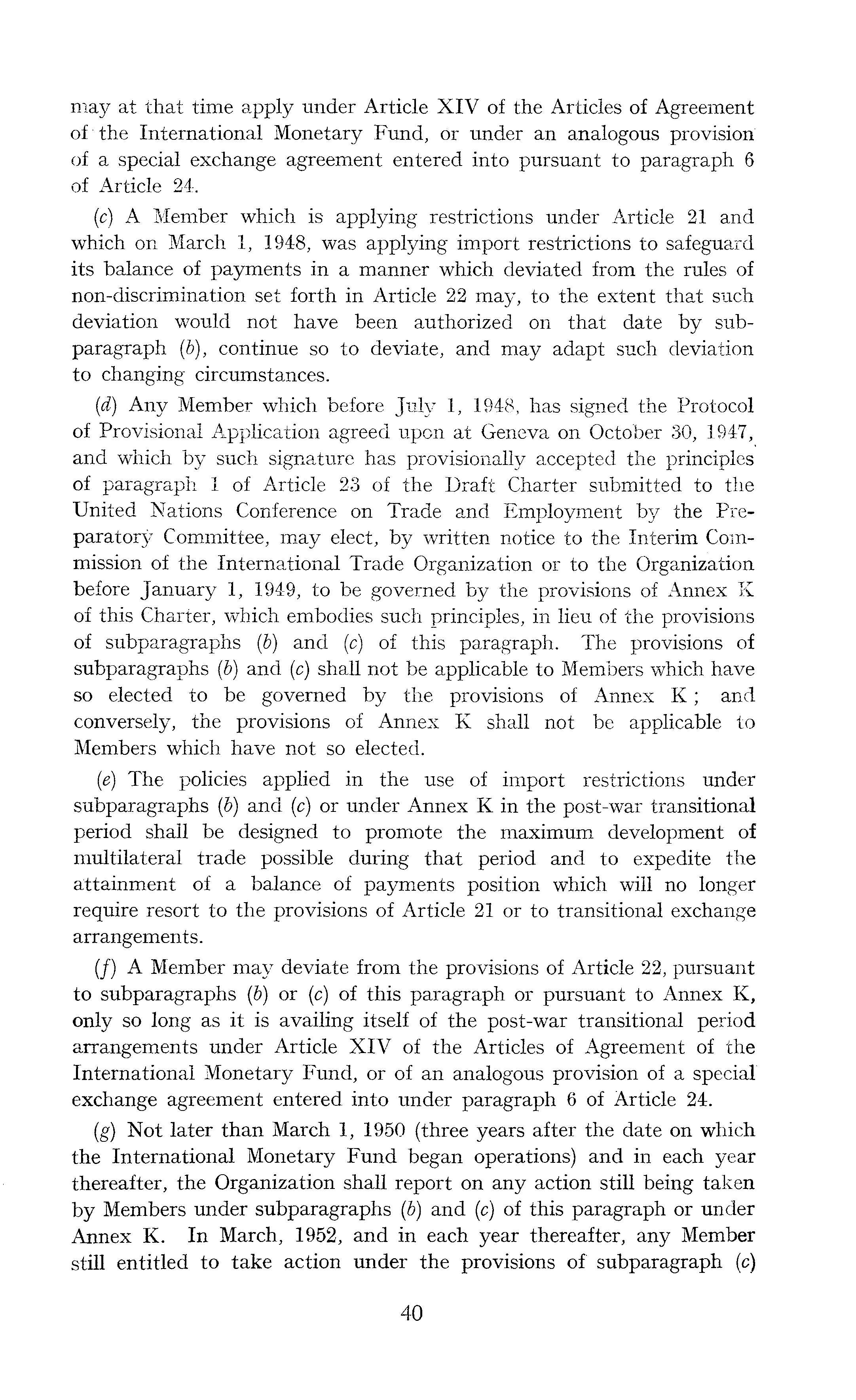 may at that time apply under Article XIV of the Articles of Agreement of the International Monetary Fund, Or under an analogous provision* of a special exchange agreement entered into pursuant to paragraph 6 of Article 24. (c) A Member which is applying restrictions under Article 21 and which on March 1, 1948, was applying import restrictions to safeguard its balance of payments in a manner which deviated from the rules of non-discrimination set forth in Article 22 may, to the extent that such deviation would not have been authorized on that date by subparagraph (b), continue so to deviate, and may adapt such deviation to changing circumstances. (d) Any Member which before July 1, 1948, has signed the Protocol of Provisional Application agreed upon at Geneva on October 30, 1947, and which by such signature has provisionally accepted the principles of paragraph 1 of Article 23 of the Draft Charter submitted to the United Nations Conference on Trade and Employment by the Preparatory Committee, may elect, by written notice to the Interim Commission of the International Trade Organization or to the Organization before January 1, 1949, to be governed by the provisions of Annex K of this Charter, which embodies such principles, in lieu of the provisions of subparagraphs (b) and (c) of this paragraph. The provisions of subparagraphs ( b) and (c) shall not be applicable to Members which have so elected to be governed by the provisions of Annex K; and conversely, the provisions of Annex K shall not be applicable to Members which have not so elected. (e) The policies applied in the use of import restrictions under subparagraphs (b) and (c) or under Annex K in the post-war transitional period shall be designed to promote the maximum development of multilateral trade possible during that period and to expedite the attainment of a balance of payments position which will no longer require resort to the provisions of Article 21 or to transitional exchange arrangements. (/) A Member may deviate from the provisions of Article 22, pursuant to subparagraphs (b) or (c) of this paragraph or pursuant to Annex K, only so long as it is availing itself of the post-war transitional period arrangements under Article XIV of the Articles of Agreement of the International Monetary Fund, or of an analogous provision of a special exchange agreement entered into under paragraph 6 of Article 24. (g) Not later than March 1, 1950 (three years after the date on which the International Monetary Fund began operations) and in each year thereafter, the Organization shall report on any action still being taken by Members under subparagraphs (6) and (c) of this paragraph or under Annex K. In March, 1952, and in each year thereafter, any Member still entitled to take action under the provisions of subparagraph (c)