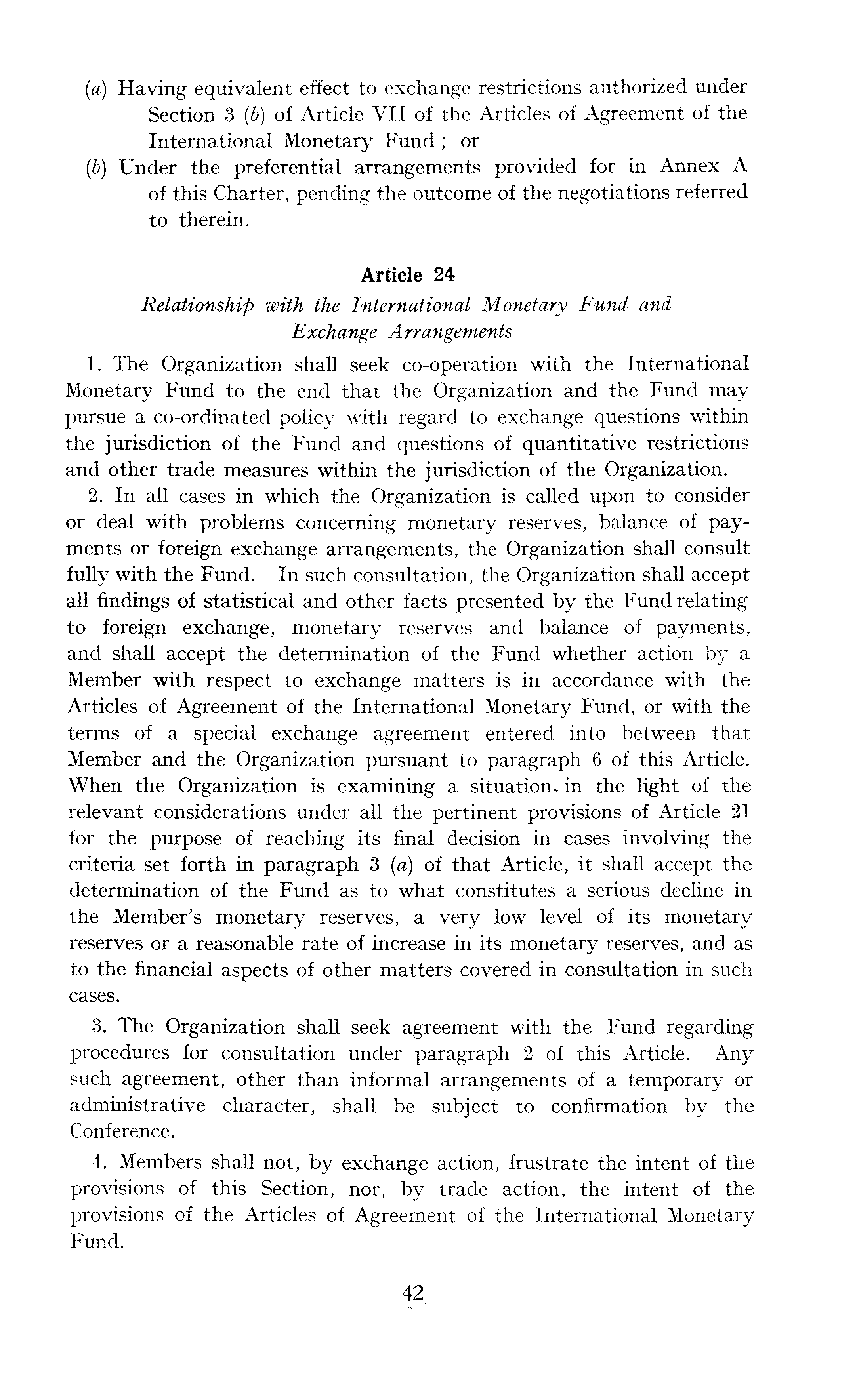 (a) Having equivalent effect to exchange restrictions authorized under Section 3 (b) of Article VII of the Articles of Agreement of the International Monetary Fund ; or (b) Under the preferential arrangements provided for in Annex A of this Charter, pending the outcome of the negotiations referred to therein. Article 24 Relationship with the International Monetary Fund and Exchange Arrangements 1. The Organization shall seek co-operation with the International Monetary Fund to the end that the Organization and the Fund may pursue a co-ordinated policy with regard to exchange questions within the jurisdiction of the Fund and questions of quantitative restrictions and other trade measures within the jurisdiction of the Organization. 2. In all cases in which the Organization is called upon to consider or deal with problems concerning monetary reserves, balance of payments or foreign exchange arrangements, the Organization shall consult fully with the Fund. In such consultation, the Organization shall accept all findings of statistical and other facts presented by the Fund relating to foreign exchange, monetary reserves and balance of payments, and shall accept the determination of the Fund whether action by a Member with respect to exchange matters is in accordance with the Articles of Agreement of the International Monetary Fund, or with the terms of a special exchange agreement entered into between that Member and the Organization pursuant to paragraph 6 of this Article. When the Organization is examining a situation, in the light of the relevant considerations under all the pertinent provisions of Article 21 for the purpose of reaching its final decision in cases involving the criteria set forth in paragraph 3 {a) of that Article, it shall accept the determination of the Fund as to what constitutes a serious decline in the Member's monetary reserves, a very low level of its monetary reserves or a reasonable rate of increase in its monetary reserves, and as to the financial aspects of other matters covered in consultation in such cases. 3. The Organization shall seek agreement with the Fund regarding procedures for consultation under paragraph 2 of this Article. Any such agreement, other than informal arrangements of a temporary or administrative character, shall be subject to confirmation by the Conference. 4. Members shall not, by exchange action, frustrate the intent of the provisions of this Section, nor, by trade action, the intent of the provisions of the Articles of Agreement of the International Monetary Fund.