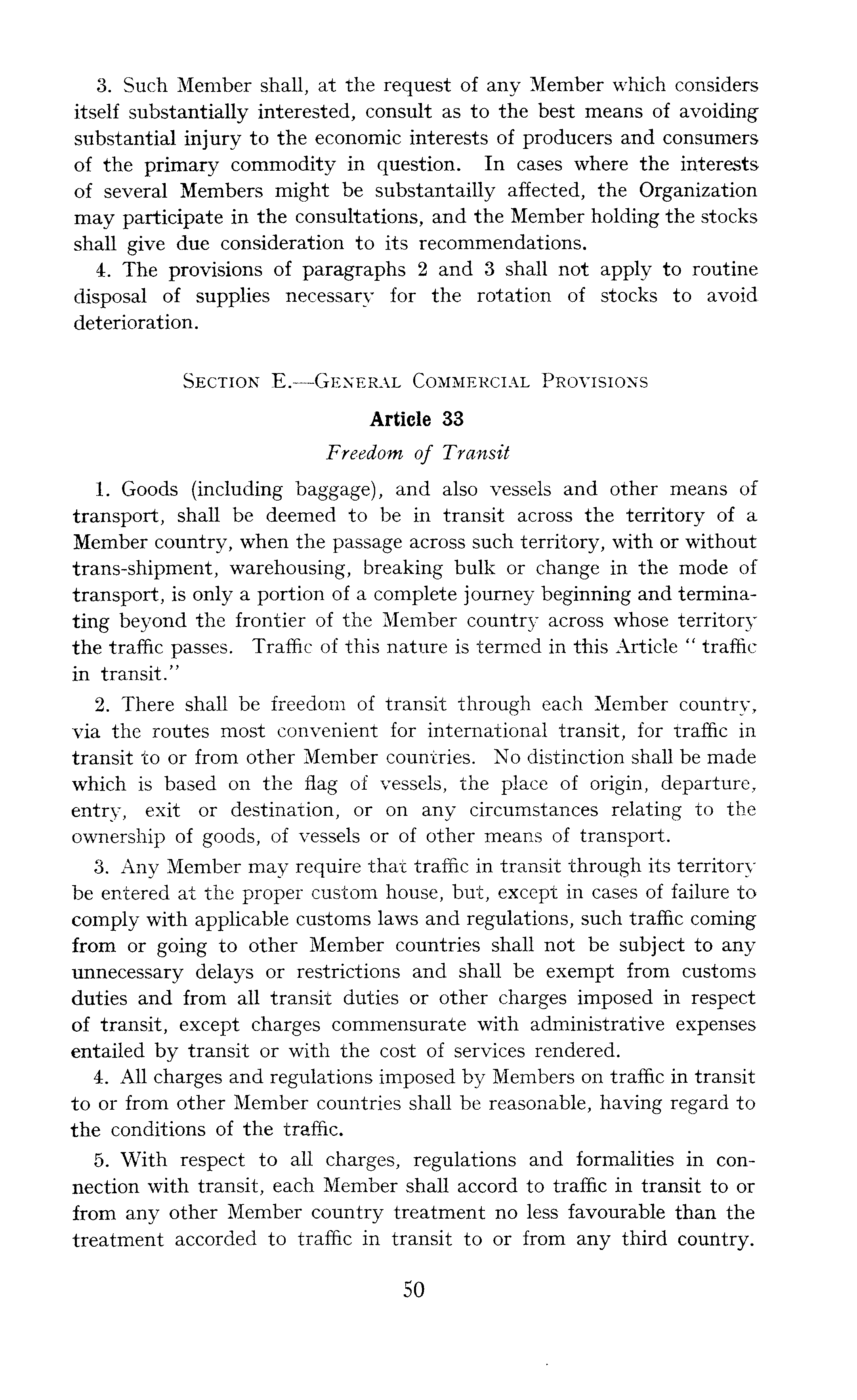 3. Such Member shall, at the request of any Member which considers itself substantially interested, consult as to the best means of avoiding substantial injury to the economic interests of producers and consumers of the primary commodity in question. In cases where the interests of several Members might be substantailly affected, the Organization may participate in the consultations, and the Member holding the stocks shall give due consideration to its recommendations. 4. The provisions of paragraphs 2 and 3 shall not apply to routine disposal of supplies necessary for the rotation of stocks to avoid deterioration. Section E. —General Commercial Provisions Article 33 Freedom of Transit 1. Goods (including baggage), and also vessels and other means of transport, shall be deemed to be in transit across the territory of a Member country, when the passage across such territory, with or without trans-shipment, warehousing, breaking bulk or change in the mode of transport, is only a portion of a complete journey beginning and terminating beyond the frontier of the Member country across whose territory the traffic passes. Traffic of this nature is termed in this Article " traffic in transit." 2. There shall be freedom of transit through each Member country, via the routes most convenient for international transit, for traffic in transit to or from other Member countries. No distinction shall be made which is based on the flag of vessels, the place of origin, departure, entry, exit or destination, or on any circumstances relating to the ownership of goods, of vessels or of other means of transport. 3. Any Member may require that traffic in transit through its territory be entered at the proper custom house, but, except in cases of failure to comply with applicable customs laws and regulations, such traffic coming from or going to other Member countries shall not be subject to any unnecessary delays or restrictions and shall be exempt from customs duties and from all transit duties or other charges imposed in respect of transit, except charges commensurate with administrative expenses entailed by transit or with the cost of services rendered. 4. All charges and regulations imposed by Members on traffic in transit to or from other Member countries shall be reasonable, having regard to the conditions of the traffic. 5. With respect to all charges, regulations and formalities in connection with transit, each Member shall accord to traffic in transit to or from any other Member country treatment no less favourable than the treatment accorded to traffic in transit to or from any third country.