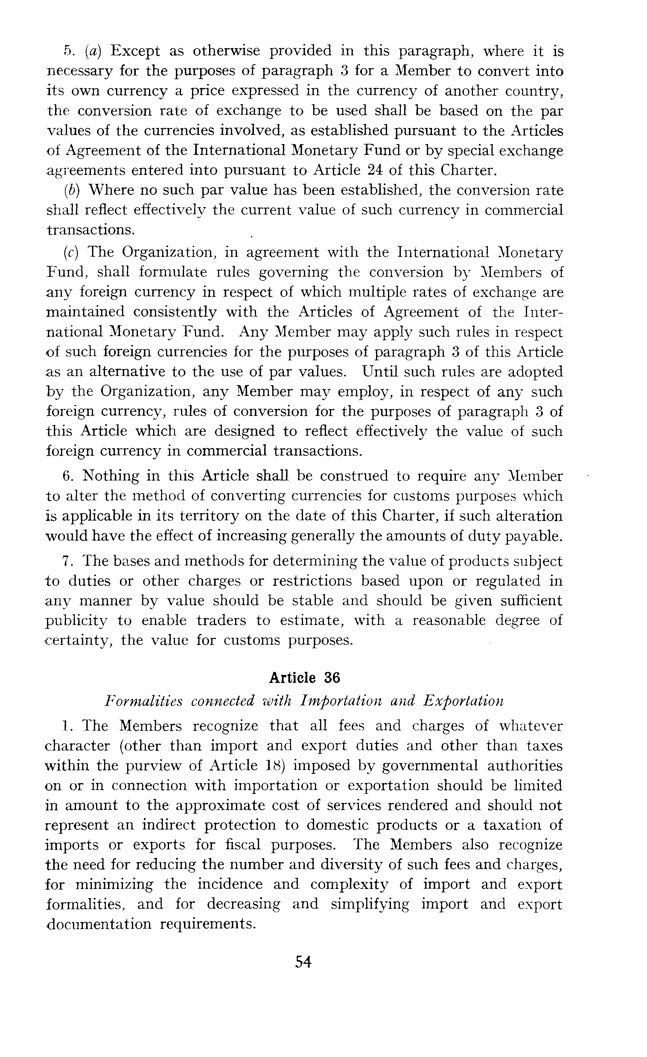 5. (a) Except as otherwise provided in this paragraph, where it is necessary for the purposes of paragraph 3 for a Member to convert into its own currency a price expressed in the currency of another country, the conversion rate of exchange to be used shall be based on the par values of the currencies involved, as established pursuant to the Articles of Agreement of the International Monetary Fund or by special exchange agreements entered into pursuant to Article 24 of this Charter. (Ib) Where no such par value has been established, the conversion rate shall reflect effectively the current value of such currency in commercial transactions. (c) The Organization, in agreement with the International Monetary Fund, shall formulate rules governing the conversion by Members of any foreign currency in respect of which multiple rates of exchange are maintained consistently with the Articles of Agreement of the International Monetary Fund. Any Member may apply such rules in respect of such foreign currencies for the purposes of paragraph 3 of this Article as an alternative to the use of par values. Until such rules are adopted by the Organization, any Member may employ, in respect of any such foreign currency, rules of conversion for the purposes of paragraph 3 of this Article which are designed to reflect effectively the value of such foreign currency in commercial transactions. 6. Nothing in this Article shall be construed to require any Member to alter the method of converting currencies for customs purposes which is applicable in its territory on the date of this Charter, if such alteration would have the effect of increasing generally the amounts of duty payable. 7. The bases and methods for determining the value of products subject to duties or other charges or restrictions based upon or regulated in any manner by value should be stable and should be given sufficient publicity to enable traders to estimate, with a reasonable degree of certainty, the value for customs purposes. Article 36 Formalities connected with Importation and Exportation 1. The Members recognize that all fees and charges of whatever character (other than import and export duties and other than taxes within the purview of Article 18) imposed by governmental authorities on or in connection with importation or exportation should be limited in amount to the approximate cost of services rendered and should not represent an indirect protection to domestic products or a taxation of imports or exports for fiscal purposes. The Members also recognize the need for reducing the number and diversity of such fees and charges, for minimizing the incidence and complexity of import and export formalities, and for decreasing and simplifying import and export documentation requirements.