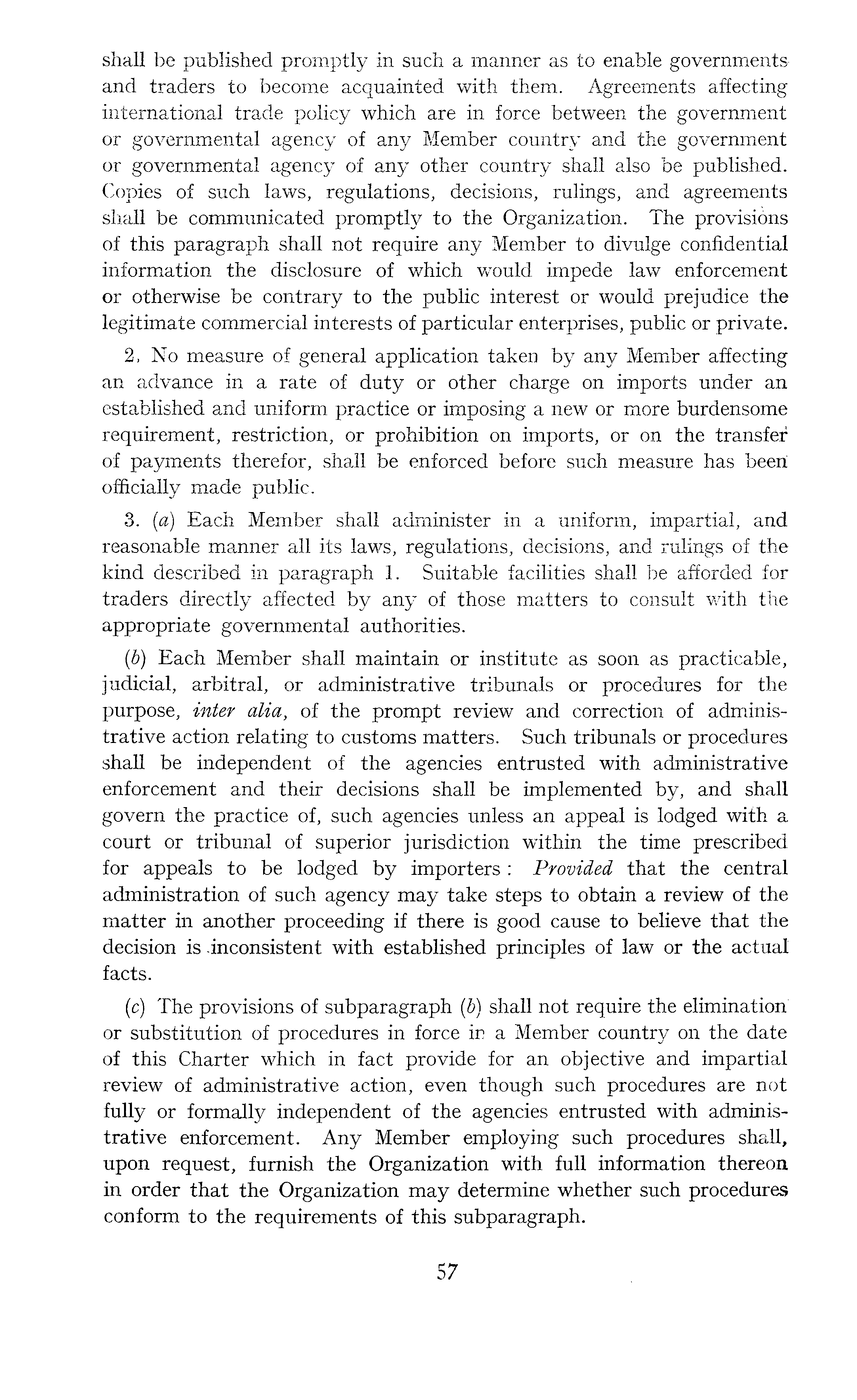 shall be published promptly in such a manner as to enable governments and traders to become acquainted with them. Agreements affecting international trade policy which are in force between the government or governmental agency of any Member country and the government or governmental agency of any other country shall also be published. Copies of such laws, regulations, decisions, rulings, and agreements shall be communicated promptly to the Organization. The provisions of this paragraph shall not require any Member to divulge confidential information the disclosure of which would impede law enforcement or otherwise be contrary to the public interest or would prejudice the legitimate commercial interests of particular enterprises, public or private. 2, No measure of general application taken by any Member affecting an advance in a rate of duty or other charge on imports under an established and uniform practice or imposing a new or more burdensome requirement, restriction, or prohibition on imports, or on the transfer of payments therefor, shall be enforced before such measure has beeri officially made public. 3. (a) Each Member shall administer in a uniform, impartial, and reasonable manner all its laws, regulations, decisions, and rulings of the kind described in paragraph 1. Suitable facilities shall be afforded for traders directly affected by any of those matters to consult with the appropriate governmental authorities. (b) Each Member shall maintain or institute as soon as practicable, judicial, arbitral, or administrative tribunals or procedures for the purpose, inter alia, of the prompt review and correction of administrative action relating to customs matters. Such tribunals or procedures shall be independent of the agencies entrusted with administrative enforcement and their decisions shall be implemented by, and shall govern the practice of, such agencies unless an appeal is lodged with a court or tribunal of superior jurisdiction within the time prescribed for appeals to be lodged by importers : Provided that the central administration of such agency may take steps to obtain a review of the matter in another proceeding if there is good cause to believe that the decision is -inconsistent with established principles of law or the actual facts. (c) The provisions of subparagraph (6) shall not require the elimination or substitution of procedures in force in a Member country on the date of this Charter which in fact provide for an objective and impartial review of administrative action, even though such procedures are not fully or formally independent of the agencies entrusted with administrative enforcement. Any Member employing such procedures shall, upon request, furnish the Organization with full information thereon in order that the Organization may determine whether such procedures conform to the requirements of this subparagraph.