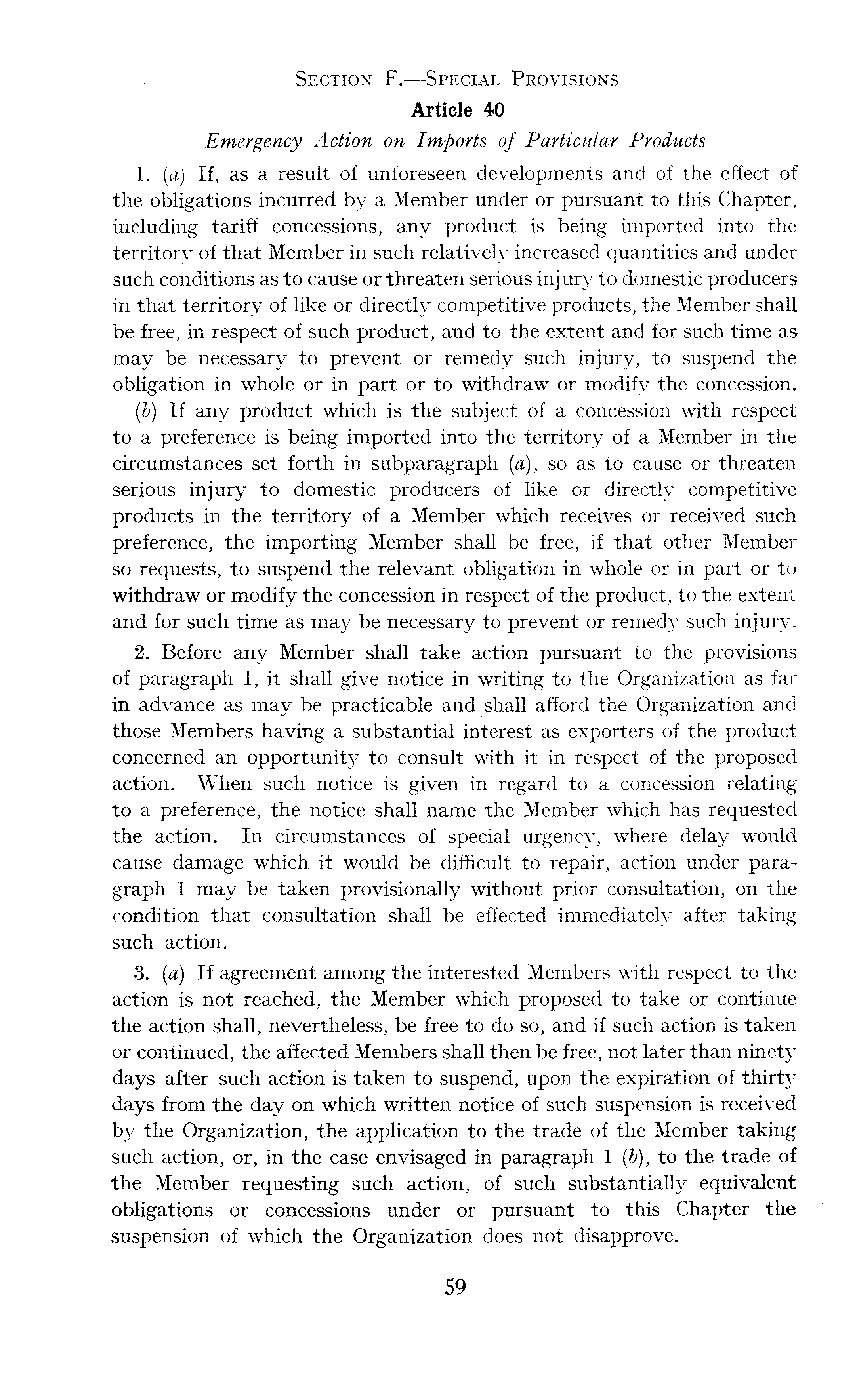 Section F. —Special Provisions Article 40 Emergency Action on Imports of Particular Products 1. (a) If, as a result of unforeseen developments and of the effect of the obligations incurred by a Member under or pursuant to this Chapter, including tariff concessions, any product is being imported into the territory of that Member iri such relatively increased quantities and under such conditions as to cause or threaten serious injury to domestic producers in that territory of like or directly competitive products, the Member shall be free, in respect of such product, and to the extent and for such time as may be necessary to prevent or remedy such injury, to suspend the obligation in whole or in part or to withdraw or modify the concession. (b) If any product which is the subject of a concession with respect to a preference is being imported into the territory of a Member in the circumstances set forth in subparagraph (a), so as to cause or threaten serious injury to domestic producers of like or directly competitive products in the territory of a Member which receives or received such preference, the importing Member shall be free, if that other Member so requests, to suspend the relevant obligation in whole or in part or to withdraw or modify the concession in respect of the product, to the extent and for such time as may be necessary to prevent or remedy such injury. 2. Before any Member shall take action pursuant to the provisions of paragraph 1, it shall give notice in writing to the Organization as far in advance as may be practicable and shall afford the Organization and those Members having a substantial interest as exporters of the product concerned an opportunity to consult with it in respect of the proposed action. When such notice is given in regard to a concession relating to a preference, the notice shall name the Member which has requested the action. In circumstances of special urgency, where delay would cause damage which it would be difficult to repair, action under paragraph 1 may be taken provisionally without prior consultation, on the condition that consultation shall be effected immediately after taking such action. 3. (a) If agreement among the interested Members with respect to the action is not reached, the Member which proposed to take or continue the action shall, nevertheless, be free to do so, and if such action is taken or continued, the affected Members shall then be free, not later than ninety days after such action is taken to suspend, upon the expiration of thirty days from the day on which written notice of such suspension is received by the Organization, the application to the trade of the Member taking such action, or, in the case envisaged in paragraph 1 (b), to the trade of the Member requesting such action, of such substantially equivalent obligations or concessions under or pursuant to this Chapter the suspension of which the Organization does not disapprove.