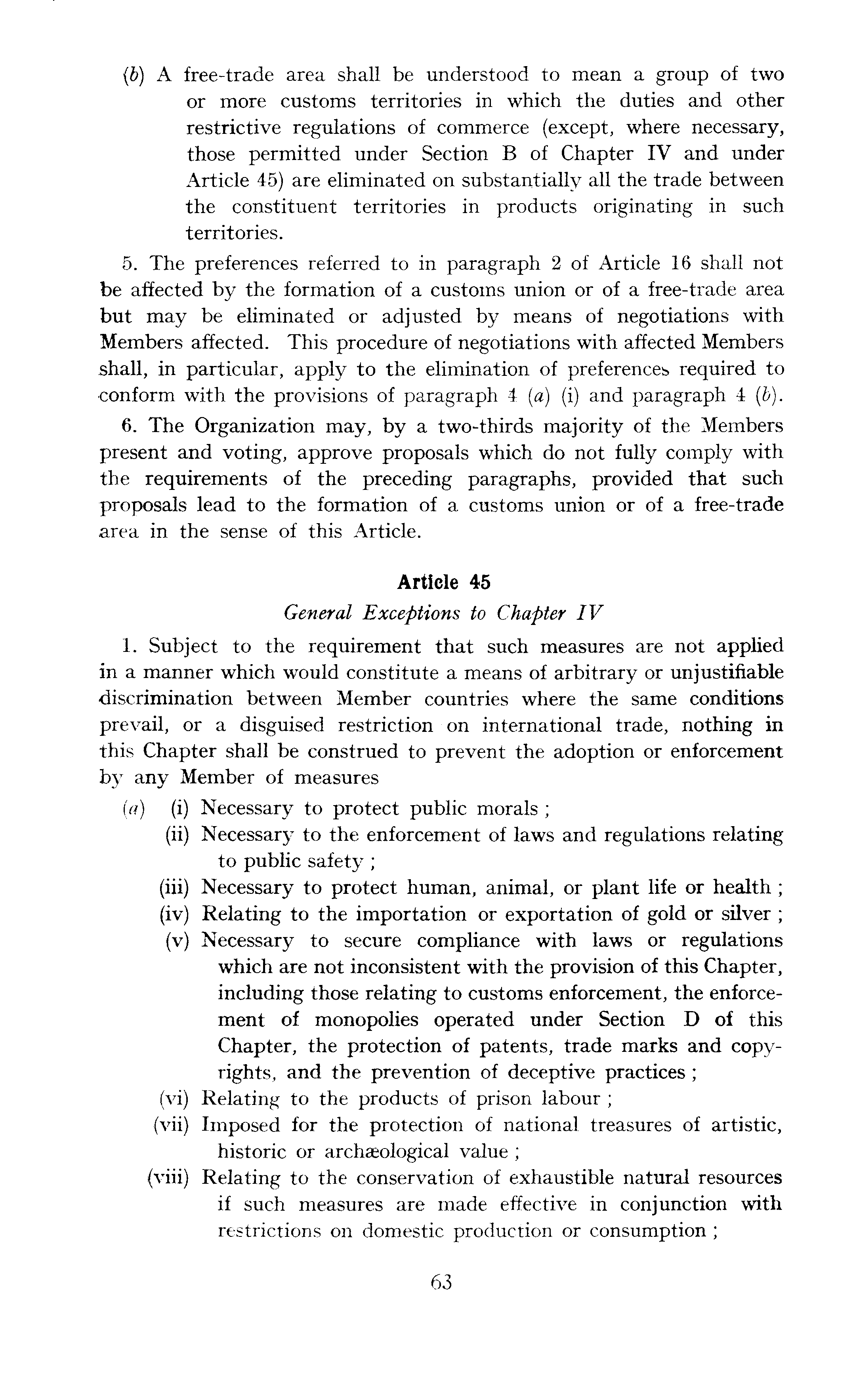 (b) A free-trade area shall be understood to mean a group of two or more customs territories in which the duties and other restrictive regulations of commerce (except, where necessary, those permitted under Section B of Chapter IV and under Article 45) are eliminated on substantially all the trade between the constituent territories in products originating in such territories. 5. The preferences referred to in paragraph 2 of Article 16 shall not be affected by the formation of a customs union or of a free-trade area but may be eliminated or adjusted by means of negotiations with Members affected. This procedure of negotiations with affected Members shall, in particular, apply to the elimination of preferences required to conform with the provisions of paragraph 4 (a) (i) and paragraph 4 (b). 6. The Organization may, by a two-thirds majority of the Members present and voting, approve proposals which do not fully comply with the requirements of the preceding paragraphs, provided that such proposals lead to the formation of a customs union or of a free-trade area in the sense of this Article. Article 45 General Exceptions to Chapter IV 1. Subject to the requirement that such measures are not applied in a manner which would constitute a means of arbitrary or unjustifiable discrimination between Member countries where the same conditions prevail, or a disguised restriction on international trade, nothing in this Chapter shall be construed to prevent the adoption or enforcement by any Member of measures (a) (i) Necessary to protect public morals; (ii) Necessary to the enforcement of laws and regulations relating to public safety; (iii) Necessary to protect human, animal, or plant life or health; (iv) Relating to the importation or exportation of gold or silver ; (v) Necessary to secure compliance with laws or regulations which are not inconsistent with the provision of this Chapter, including those relating to customs enforcement, the enforcement of monopolies operated under Section D of this Chapter, the protection of patents, trade marks and copyrights, and the prevention of deceptive practices; (vi) Relating to the products of prison labour ; (vii) Imposed for the protection of national treasures of artistic, historic or archaeological value ; (viii) Relating to the conservation of exhaustible natural resources if such measures are made effective in conjunction with restrictions on domestic production or consumption;