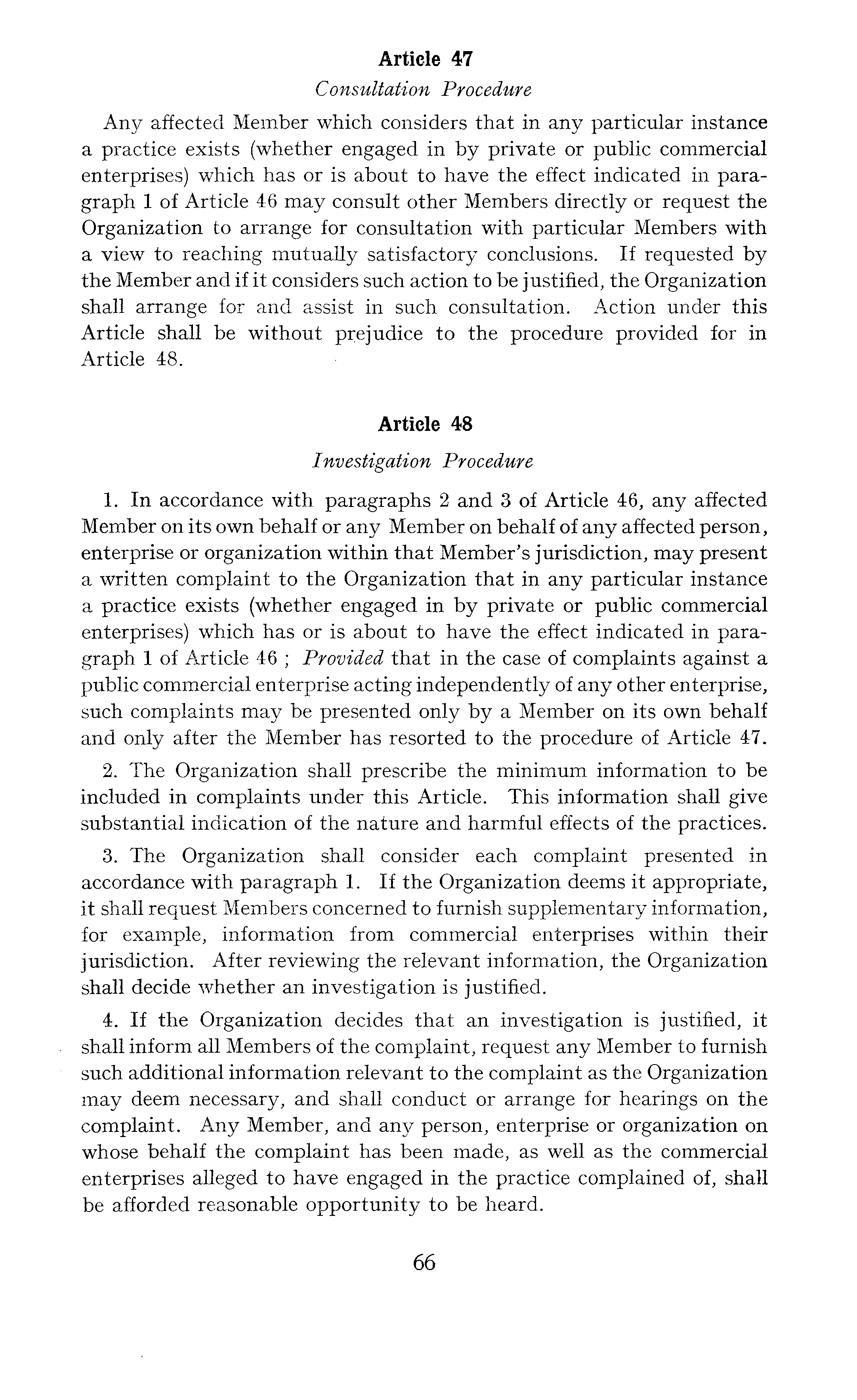 Article 47 Consultation Procedure Any affected Member which considers that in any particular instance a practice exists (whether engaged in by private or public commercial enterprises) which has or is about to have the effect indicated in paragraph 1 of Article 46 may consult other Members directly or request the Organization to arrange for consultation with particular Members with a view to reaching mutually satisfactory conclusions. If requested by the Member and if it considers such action to be justified, the Organization shall arrange for and assist in such consultation. Action under this Article shall be without prejudice to the procedure provided for in Article 48. Article 48 Investigation Procedure 1. In accordance with paragraphs 2 and 3 of Article 46, any affected Member on its own behalf or any Member on behalf of any affected person, enterprise or organization within that Member's jurisdiction, may present a written complaint to the Organization that in any particular instance a practice exists (whether engaged in by private or public commercial enterprises) which has or is about to have the effect indicated in paragraph 1 of Article 46 ; Provided that in the case of complaints against a public commercial enterprise acting independently of any other enterprise, such complaints may be presented only by a Member on its own behalf and only after the Member has resorted to the procedure of Article 47. 2. The Organization shall prescribe the minimum information to be included in complaints under this Article. This information shall give substantial indication of the nature and harmful effects of the practices. 3. The Organization shall consider each complaint presented in accordance with paragraph 1. If the Organization deems it appropriate, it shall request Members concerned to furnish supplementary information, for example, information from commercial enterprises within their jurisdiction. After reviewing the relevant information, the Organization shall decide whether an investigation is justified. 4. If the Organization decides that an investigation is justified, it shall inform all Members of the complaint, request any Member to furnish such additional information relevant to the complaint as the Organization may deem necessary, and shall conduct or arrange for hearings on the complaint. Any Member, and any person, enterprise or organization on whose behalf the complaint has been made, as well as the commercial enterprises alleged to have engaged in the practice complained of, shall be afforded reasonable opportunity to be heard.
