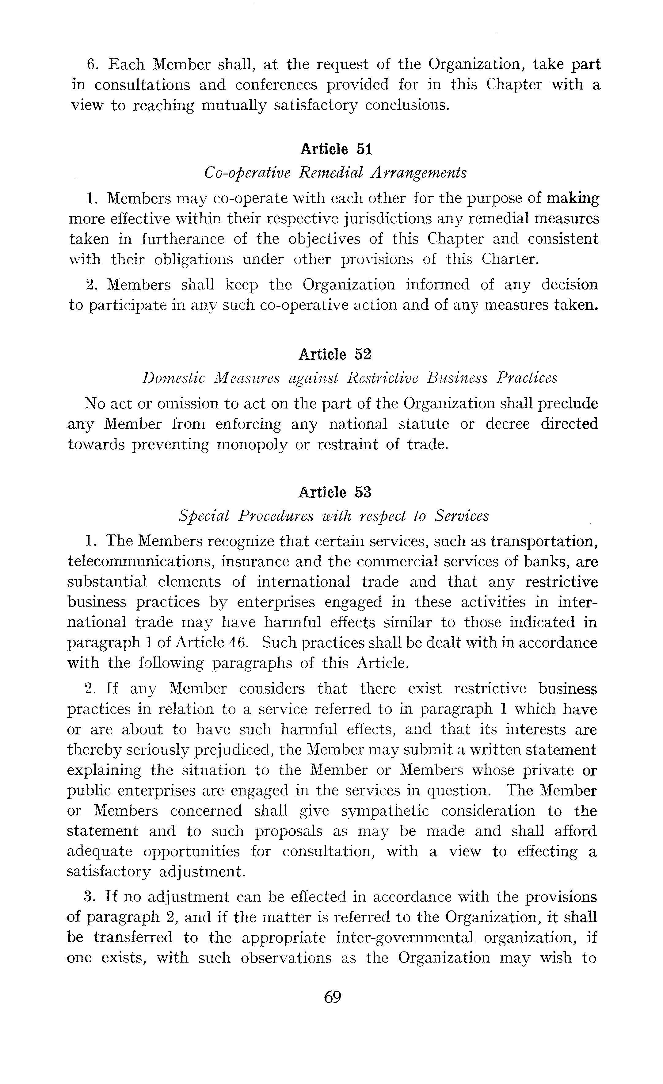 6. Each Member shall, at the request of the Organization, take part in consultations and conferences provided for in this Chapter with a view to reaching mutually satisfactory conclusions. Article 51 Co-operative Remedial Arrangements 1. Members may co-operate with each other for the purpose of making more effective within their respective jurisdictions any remedial measures taken in furtherance of the objectives of this Chapter and consistent with their obligations under other provisions of this Charter. 2. Members shall keep the Organization informed of any decision to participate in any such co-operative action and of any measures taken. Article 52 Domestic Measures against Restrictive Business Practices No act or omission to act on the part of the Organization shall preclude any Member from enforcing any national statute or decree directed towards preventing monopoly or restraint of trade. Article 53 Special Procedures with respect to Services 1. The Members recognize that certain services, such as transportation, telecommunications, insurance and the commercial services of banks, are substantial elements of international trade and that any restrictive business practices by enterprises engaged in these activities in international trade may have harmful effects similar to those indicated in paragraph lof Article 46. Such practices shall be dealt with in accordance with the following paragraphs of this Article. 2. If any Member considers that there exist restrictive business practices in relation to a service referred to in paragraph 1 which have or are about to have such harmful effects, and that its interests are thereby seriously prejudiced, the Member may submit a written statement explaining the situation to the Member or Members whose private or public enterprises are engaged in the services in question. The Member or Members concerned shall give sympathetic consideration to the statement and to such proposals as may be made and shall afford adequate opportunities for consultation, with a view to effecting a satisfactory adjustment. 3. If no adjustment can be effected in accordance with the provisions of paragraph 2, and if the matter is referred to the Organization, it shall be transferred to the appropriate inter-governmental organization, if one exists, with such observations as the Organization may wish to