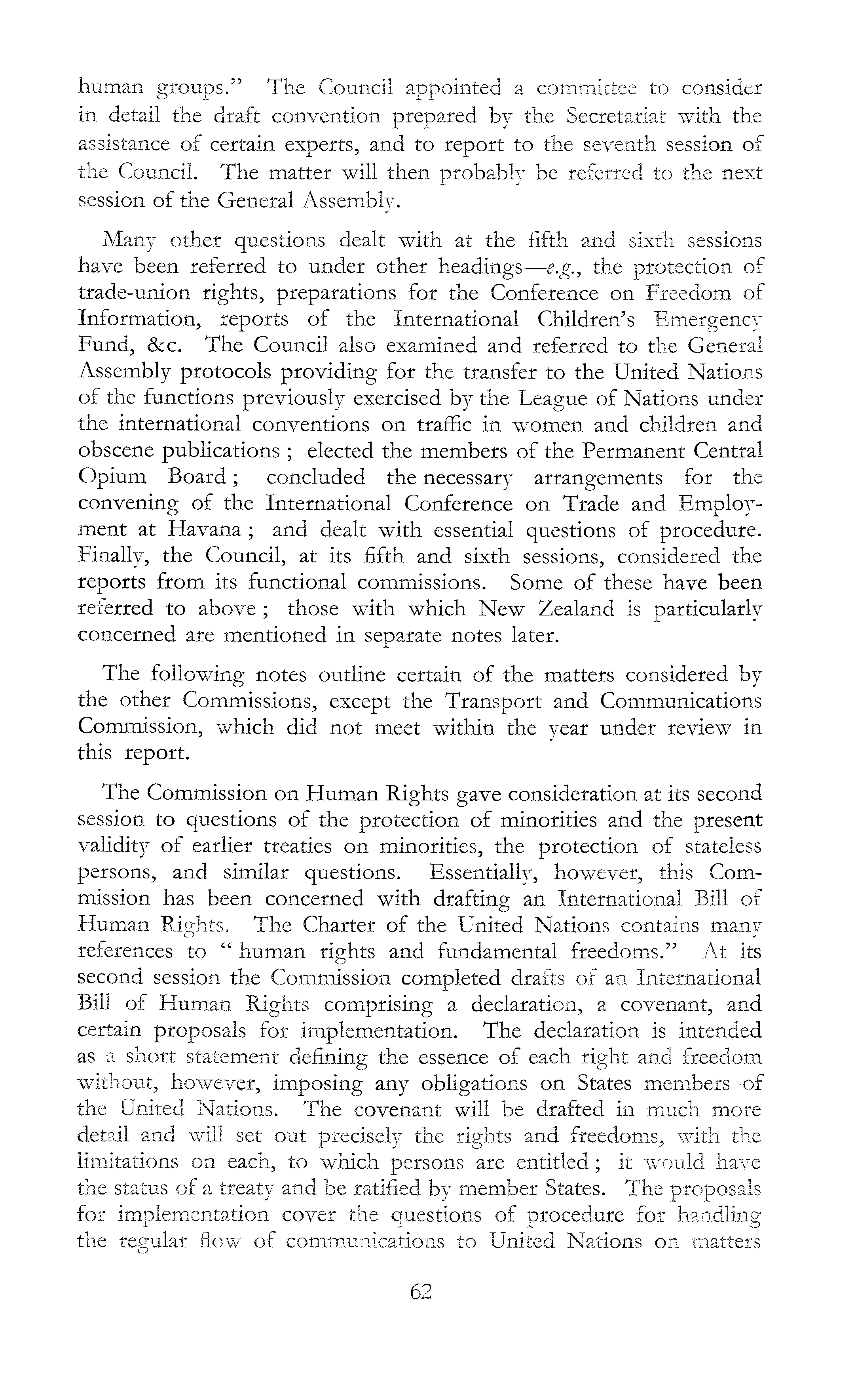 human groups." The Council appointed a committee to consider in detail the draft convention prepared by the Secretariat with the assistance of certain experts, and to report to the seventh session of the Council. The matter will then probably be referred to the next session of the General Assembly. Many other questions dealt with at the fifth and sixth sessions have been referred to under other headings—e.g., the protection of trade-union rights, preparations for the Conference on Freedom of Information, reports of the International Children's Emergency Fund, &c. The Council also examined and referred to the General Assembly protocols providing for the transfer to the United Nations of the functions previously exercised by the League of Nations under the international conventions on traffic in women and children and obscene publications ; elected the members of the Permanent Central Opium Board; concluded the necessary arrangements for the convening of the International Conference on Trade and Employment at Havana; and dealt with essential questions of procedure. Finally, the Council, at its fifth and sixth sessions, considered the reports from its functional commissions. Some of these have been referred to above ; those with which New Zealand is particularly concerned are mentioned in separate notes later. The following notes outline certain of the matters considered by the other Commissions, except the Transport and Communications Commission, which did not meet within the year under review in this report. The Commission on Human Rights gave consideration at its second session to questions of the protection of minorities and the present validity of earlier treaties on minorities, the protection of stateless persons, and similar questions. Essentially, however, this Commission has been concerned with drafting an International Bill of Human Rights. The Charter of the United Nations contains many references to " human rights and fundamental freedoms." At its second session the Commission completed drafts of an International Bill of Human Rights comprising a declaration, a covenant, and certain proposals for implementation. The declaration is intended as a short statement defining the essence of each right and freedom without, however, imposing any obligations on States members of the United Nations. The covenant will be drafted in much more detail and will set out precisely the rights and freedoms, with the limitations on each, to which persons are entitled; it would have the status of a treaty and be ratified by member States. The proposals for implementation cover the questions of procedure for handling the regular flow of communications to United Nations on matters