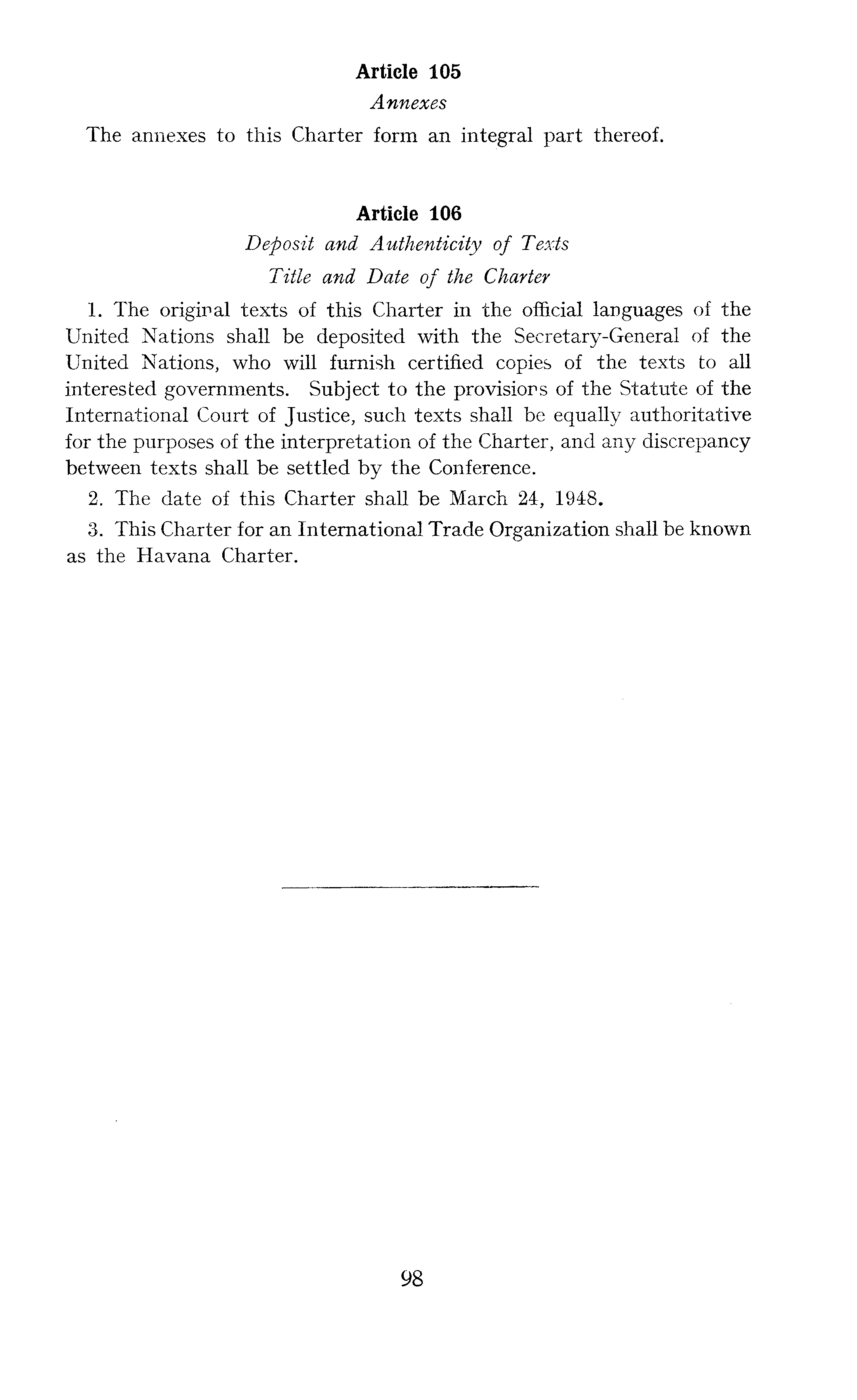 Article 105 Annexes The annexes to this Charter form an integral part thereof. Article 106 Deposit and Authenticity of Texts Title and Date of the Charter 1. The original texts of this Charter in the official languages of the United Nations shall be deposited with the Secretary-General of the United Nations, who will furnish certified copies of the texts to all interested governments. Subject to the provisions of the Statute of the International Court of Justice, such texts shall be equally authoritative for the purposes of the interpretation of the Charter, and any discrepancy between texts shall be settled by the Conference. 2. The date of this Charter shall be March 24, 1948. 3. This Charter for an International Trade Organization shall be known as the Havana Charter.