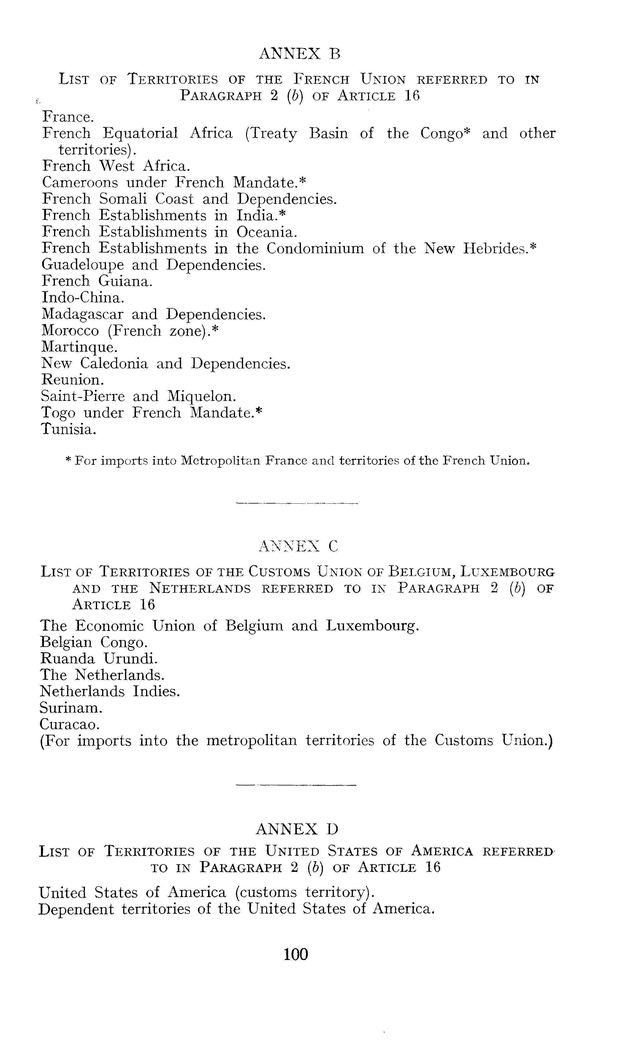 ANNEX B List of Territories of the French Union referred to in 0 Paragraph 2 (b) of Article 16 France. French Equatorial Africa (Treaty Basin of the Congo* and other territories). French West Africa. Cameroons under French Mandate.* French Somali Coast and Dependencies. French Establishments in India.* French Establishments in Oceania. French Establishments in the Condominium of the New Hebrides.* Guadeloupe and Dependencies. French Guiana. Indo-China. Madagascar and Dependencies. Morocco (French zone).* Martinque. New Caledonia and Dependencies. Reunion. Saint-Pierre and Miquelon. Togo under French Mandate.* Tunisia. * For imports into Metropolitan France and territories of the French. Union. ANNEX C List of Territories of the Customs Union of Belgium, Luxembourg and the Netherlands referred to in Paragraph 2 (b) of Article 16 The Economic Union of Belgium and Luxembourg. Belgian Congo. Ruanda Urundi. The Netherlands. Netherlands Indies. Surinam. Curacao. (For imports into the metropolitan territories of the Customs Union.) ANNEX D List of Territories of the United States of America referred to in Paragraph 2 (b) of Article 16 United States of America (customs territory). Dependent territories of the United States of America.