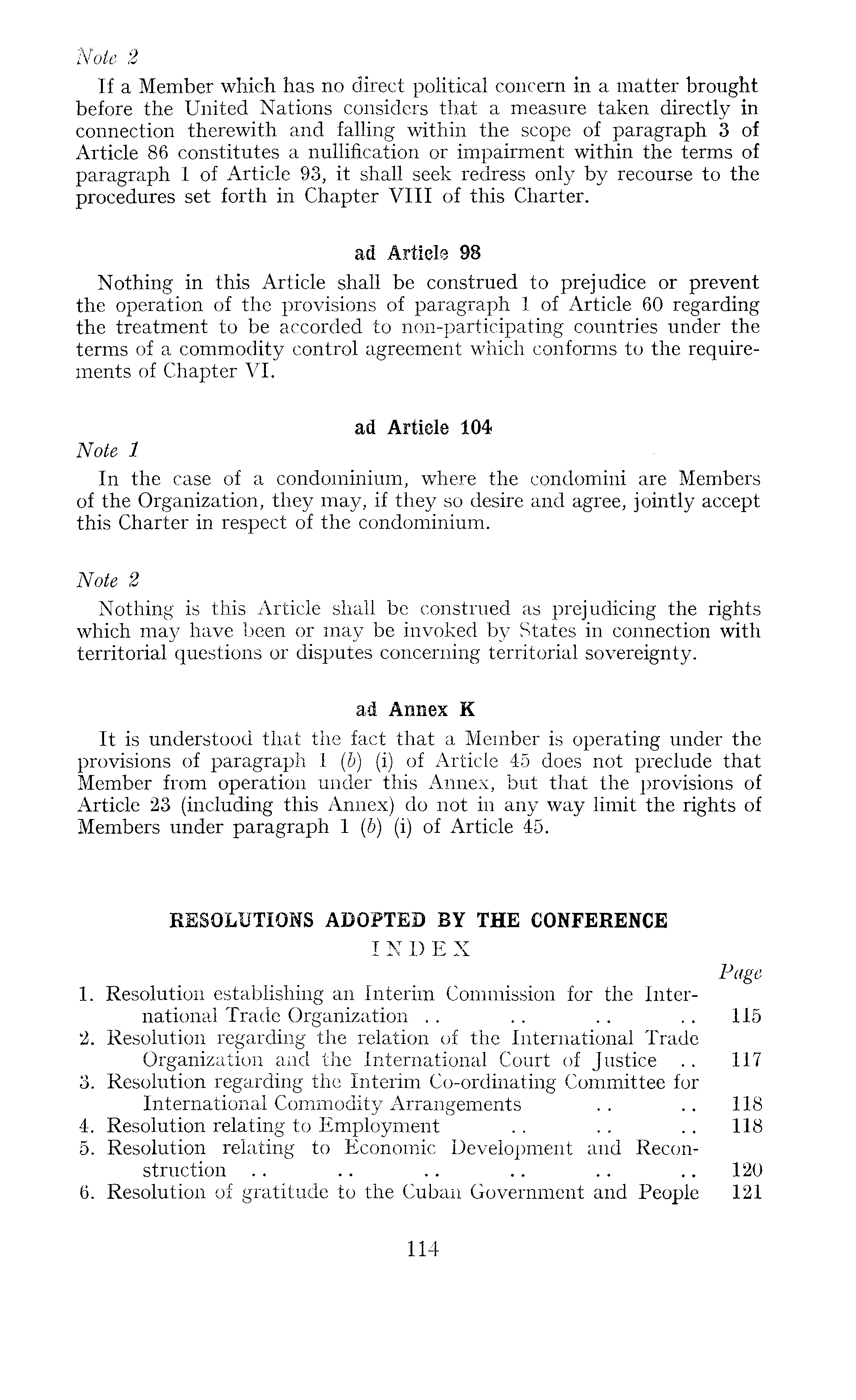 Note 2 If a Member which has no direct political concern in a matter brought before the United Nations considers that a measure taken directly in connection therewith and falling within the scope of paragraph 3 of Article 86 constitutes a nullification or impairment within the terms of paragraph 1 of Article 93, it shall seek redress only by recourse to the procedures set forth in Chapter VIII of this Charter. ad Article 98 Nothing in this Article shall be construed to prejudice or prevent the operation of the provisions of paragraph 1 of Article 60 regarding the treatment to be accorded to non-participating countries under the terms of a commodity control agreement which conforms to the requirements of Chapter VI. ad Article 104 Note 1 In the case of a condominium, where the condomini are Members of the Organization, they may, if they so desire and agree, jointly accept this Charter in respect of the condominium. Note 2 Nothing is this Article shall be construed as prejudicing the rights which may have been or may be invoked by States in connection with territorial questions or disputes concerning territorial sovereignty. ad Annex K It is understood that the fact that a Member is operating under the provisions of paragraph 1 (b) (i) of Article 45 does not preclude that Member from operation under this Annex, but that the provisions of Article 23 (including this Annex) do not in any way limit the rights of Members under paragraph 1 (b) (i) of Article 45. RESOLUTIONS ADOPTED BY THE CONFERENCE INDEX Page 1. Resolution establishing an Interim Commission for the International Trade Organization .. .. .. .. 115 2. Resolution regarding the relation of the International Trade Organization and the International Court of Justice .. 117 3. Resolution regarding the Interim Co-ordinating Committee for International Commodity Arrangements .. .. 118 4. Resolution relating to Employment .. .. .. 118 5. Resolution relating to Economic Development and Reconstruction .. .. .. .. .. .. 120 6. Resolution of gratitude to the Cuban Government and People 121